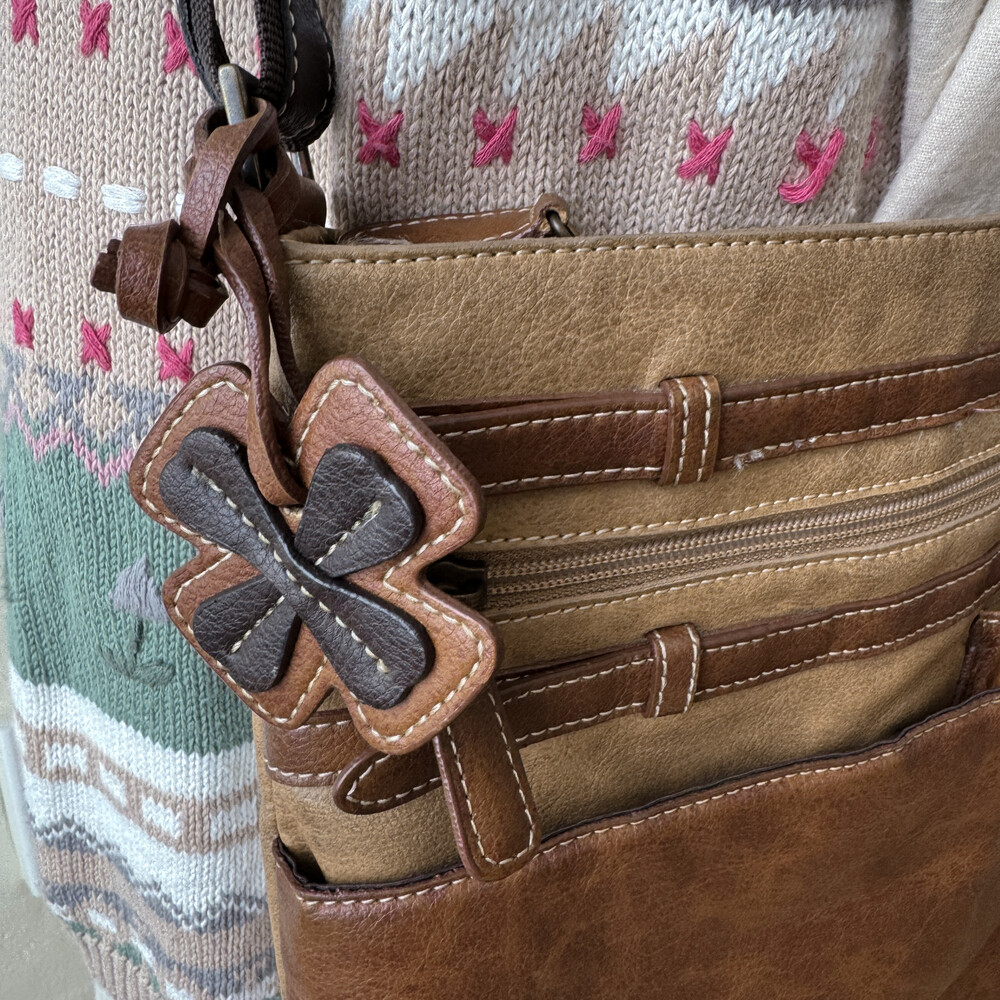인조가죽으로 추정되구요, 꽃모양 키링이 포인트로 달려있어요