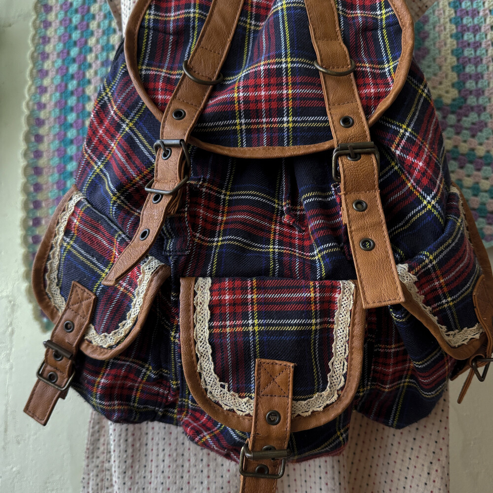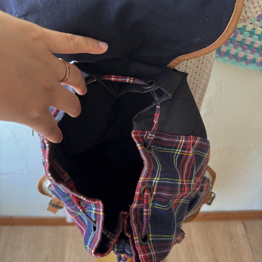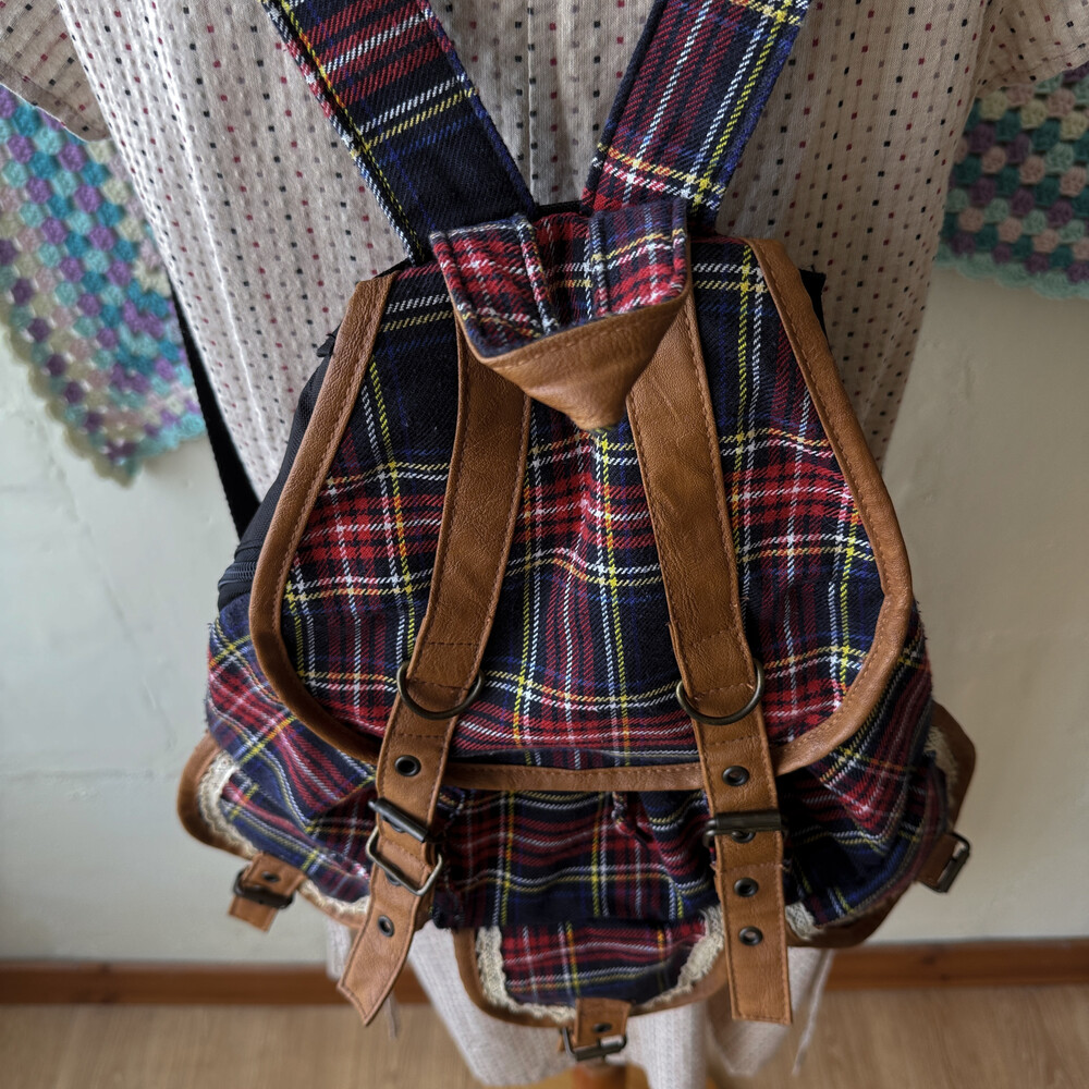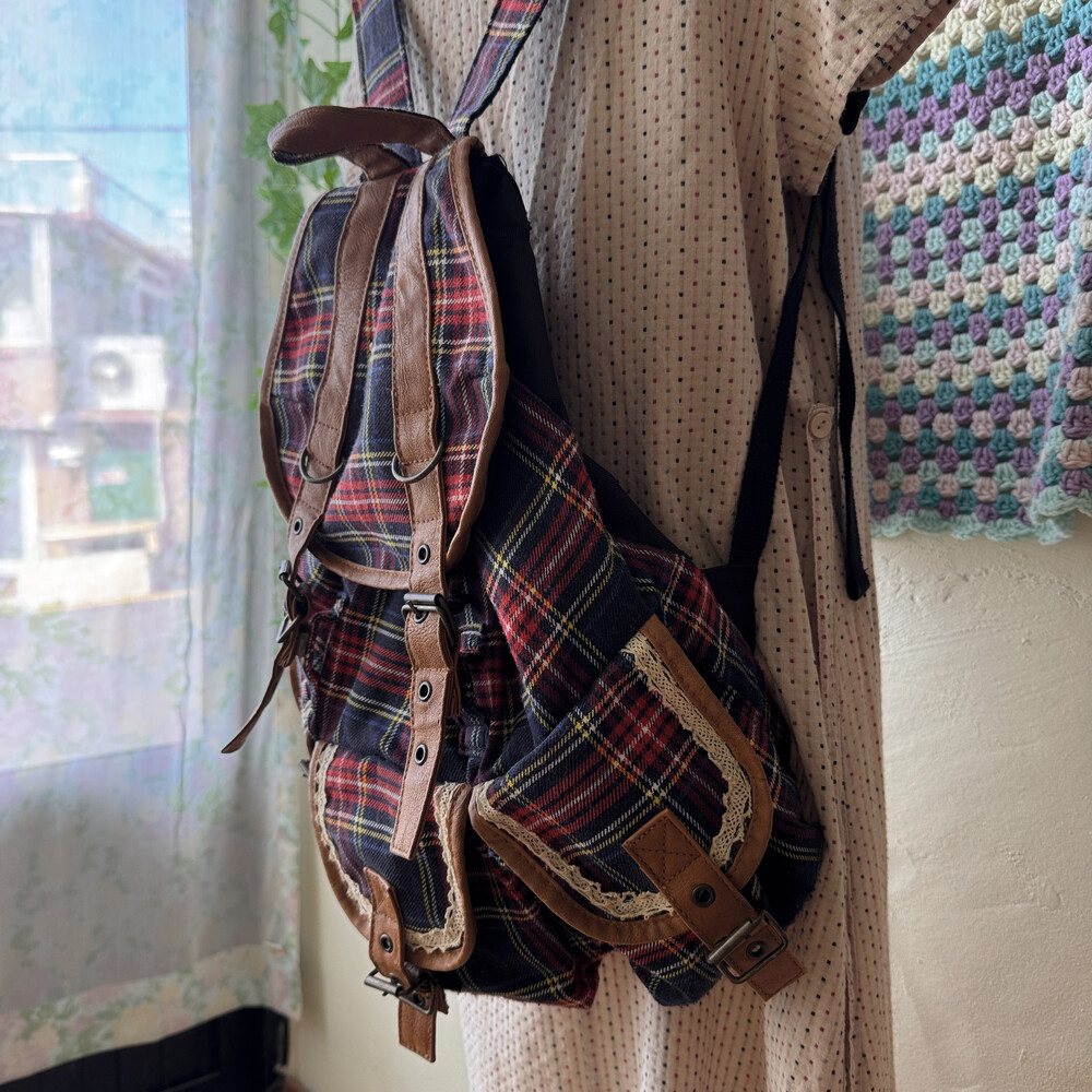레드, 네이비 색감 체크 포켓 백팩이에요