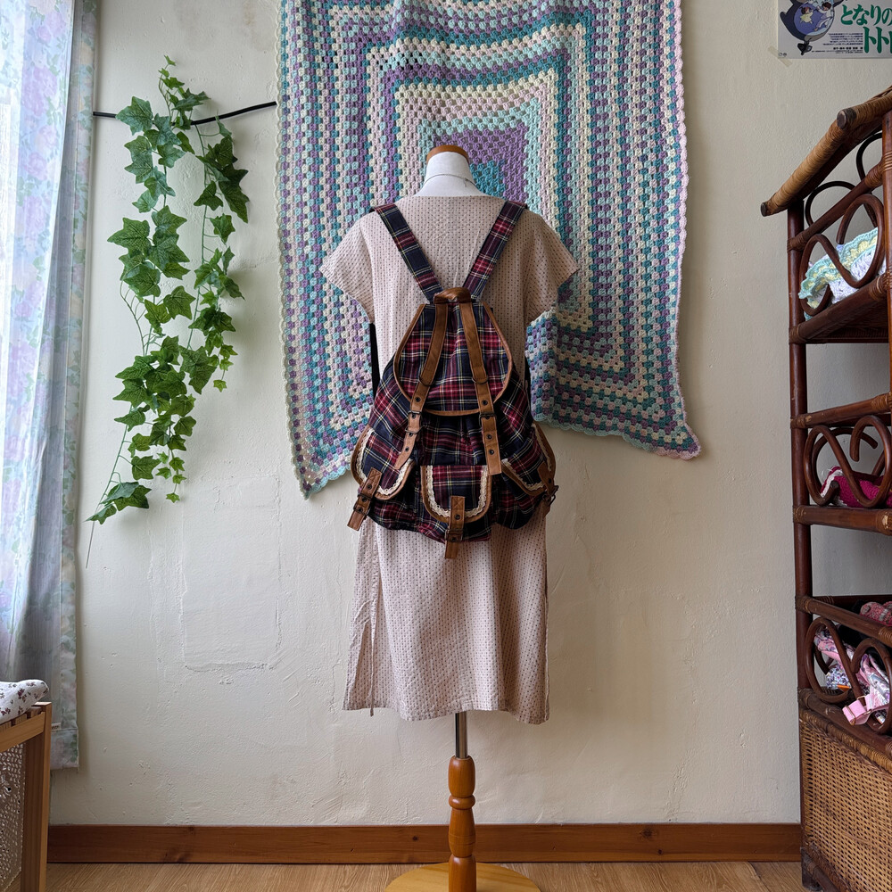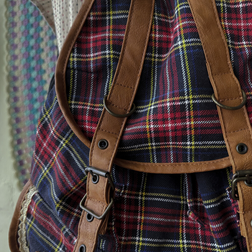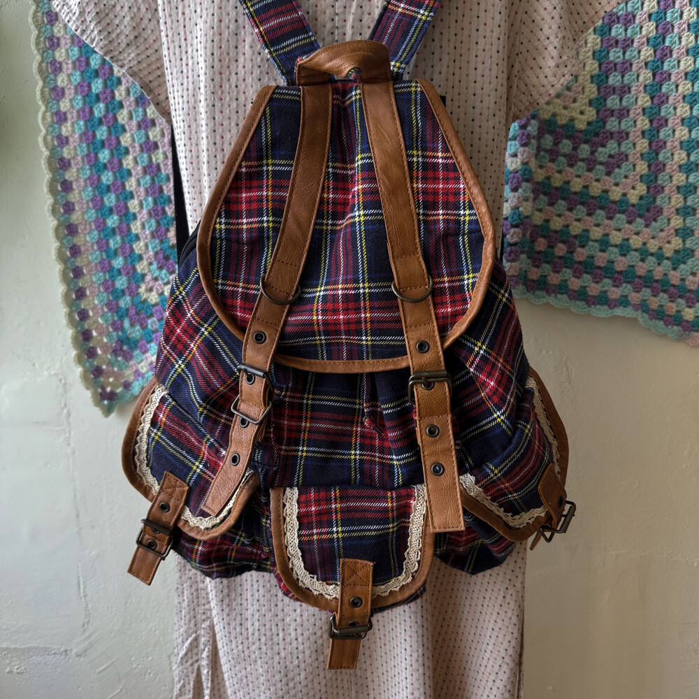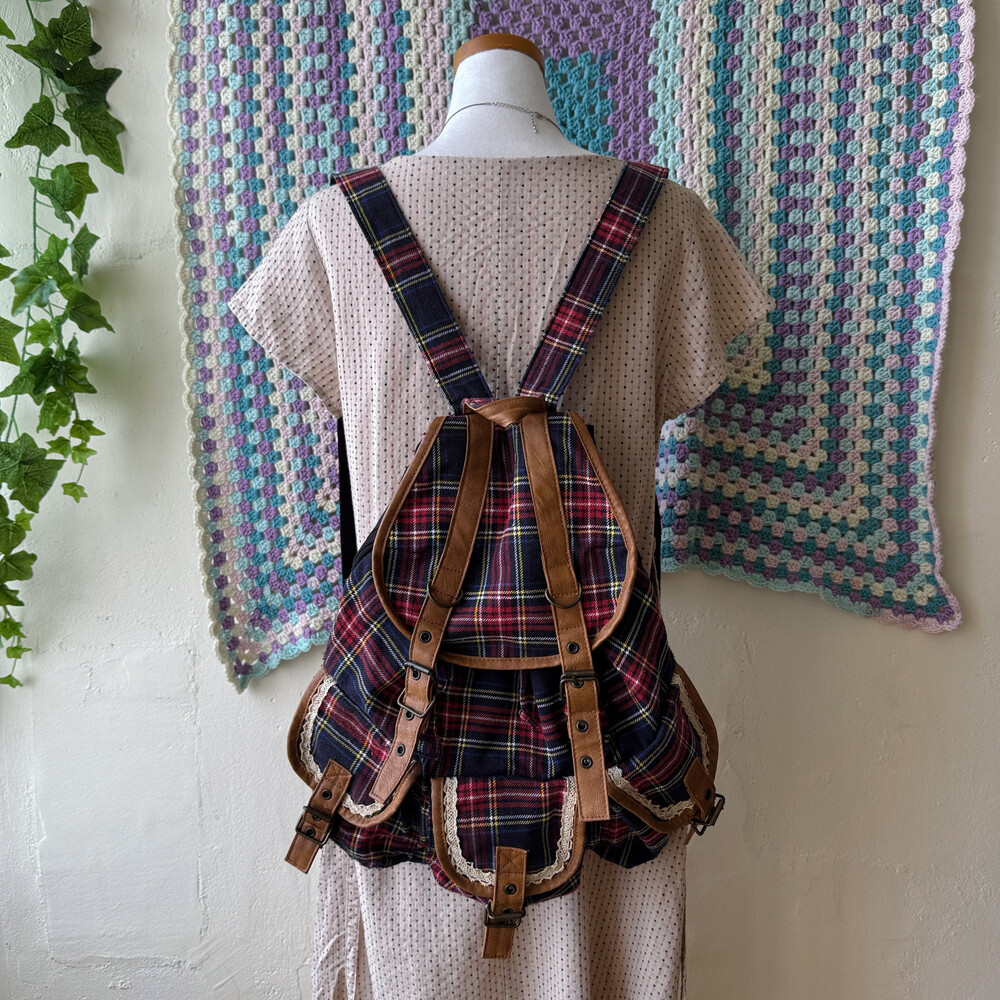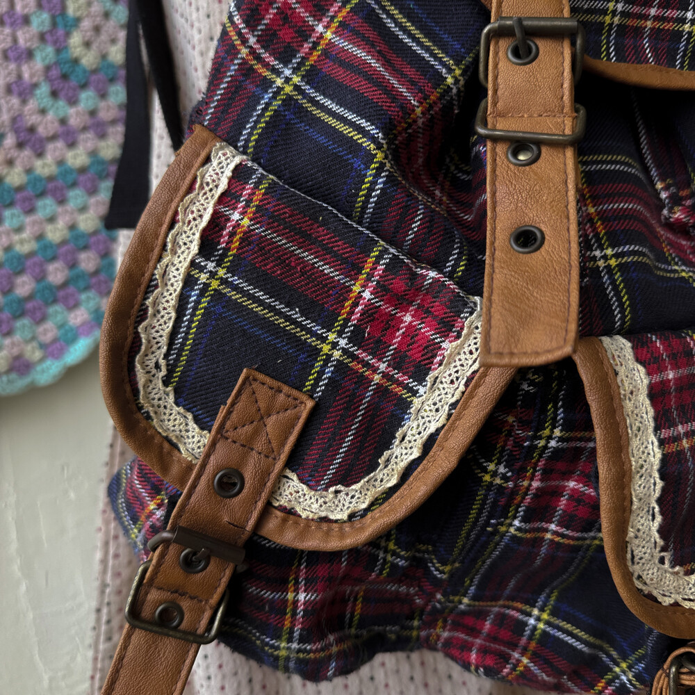 레드, 네이비 색감 체크 포켓 백팩이에요