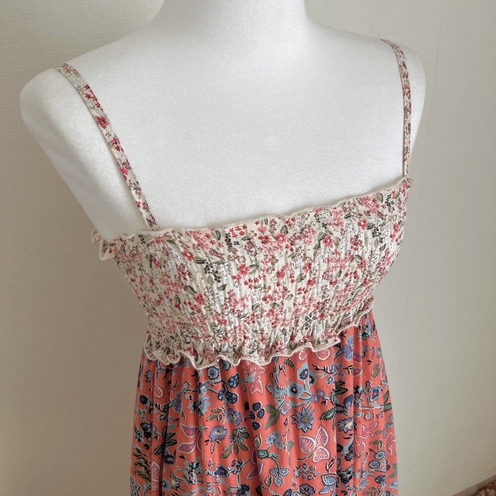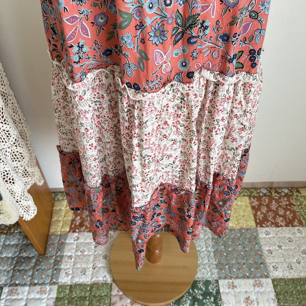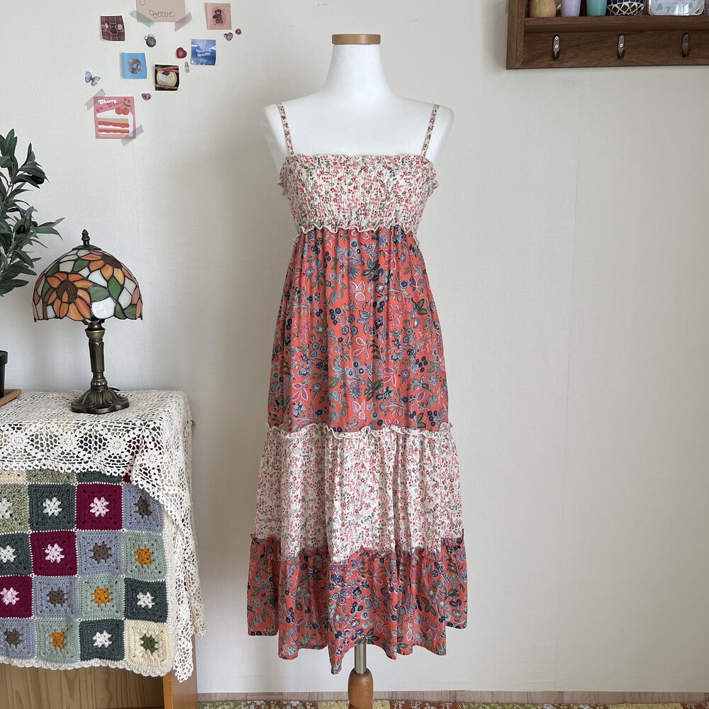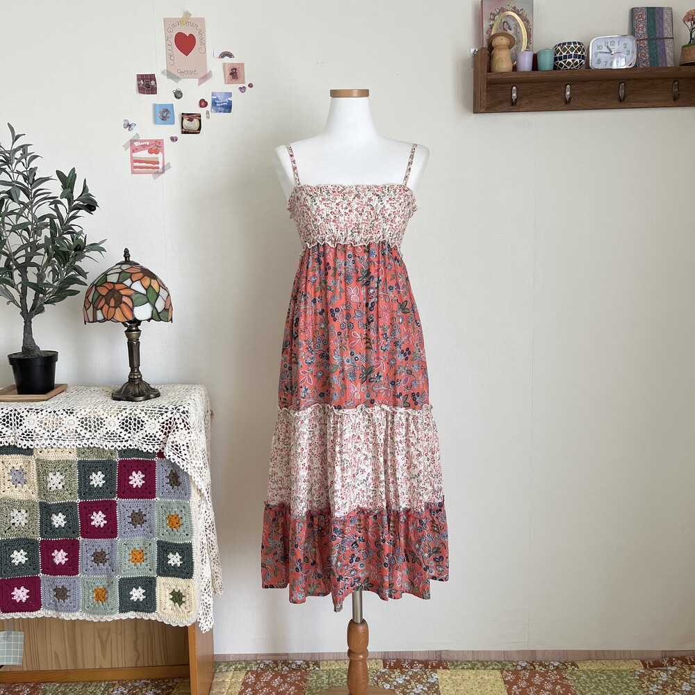 핑크와 오렌지가 오묘하게 섞인 색감의 패치 캉캉 끈원피스예요