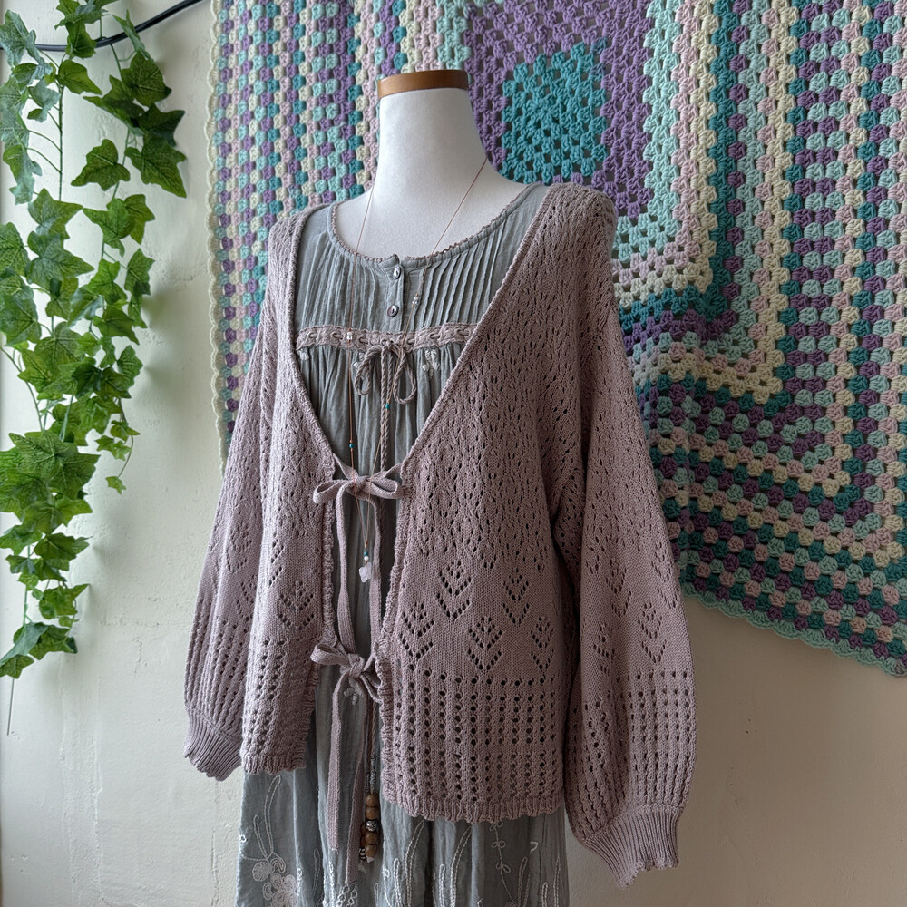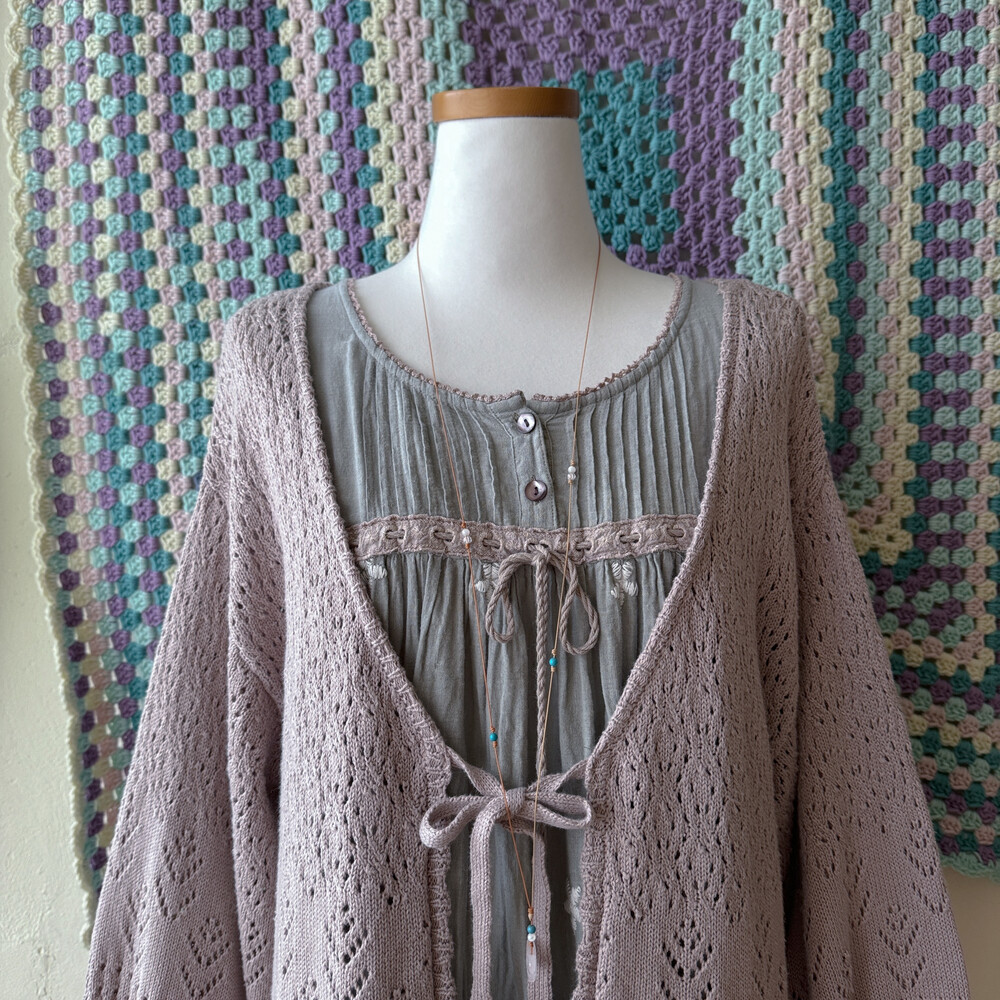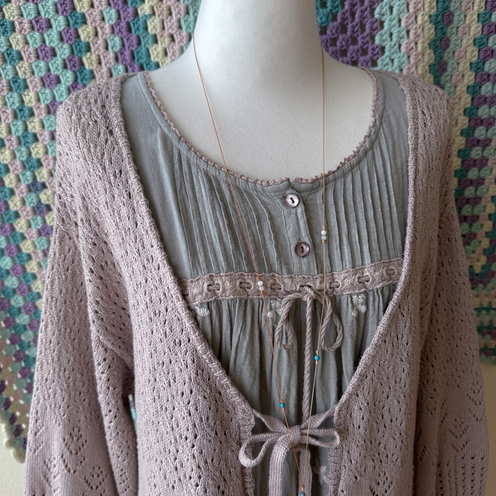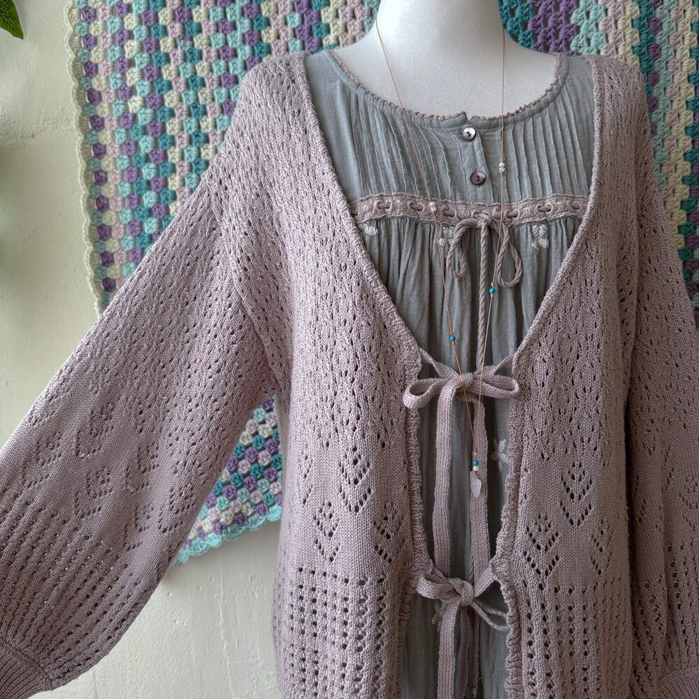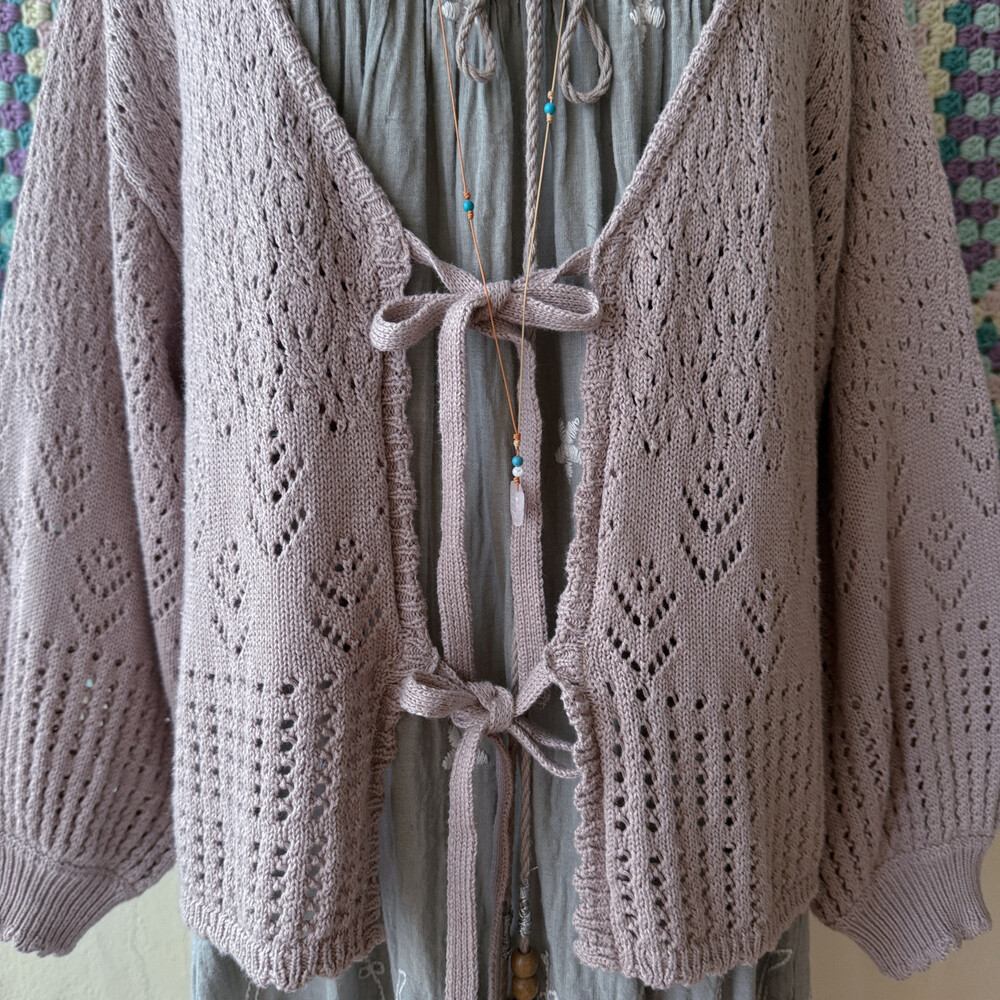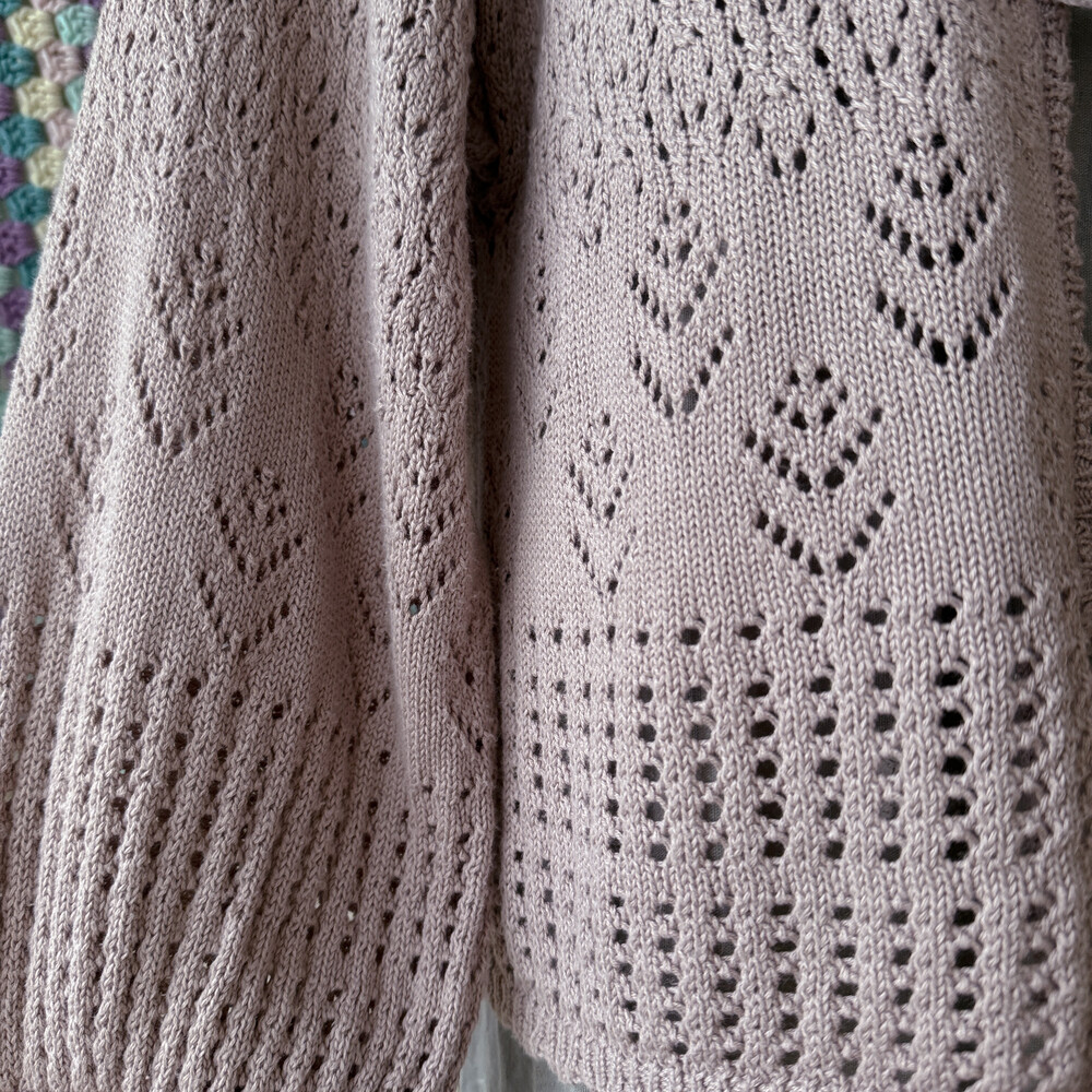 밝은 팥죽 색의 크로셰 가디건이에요