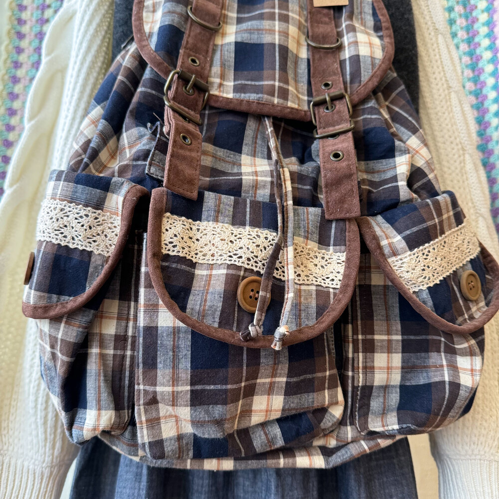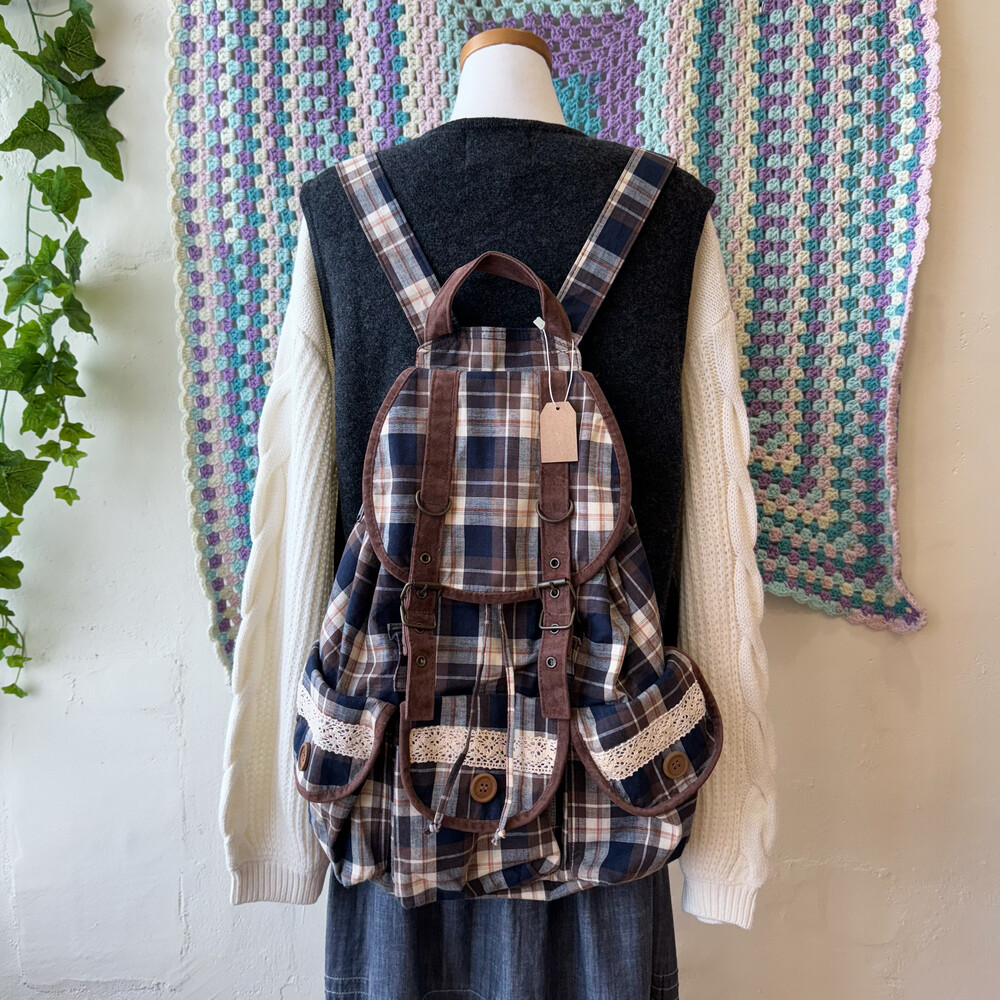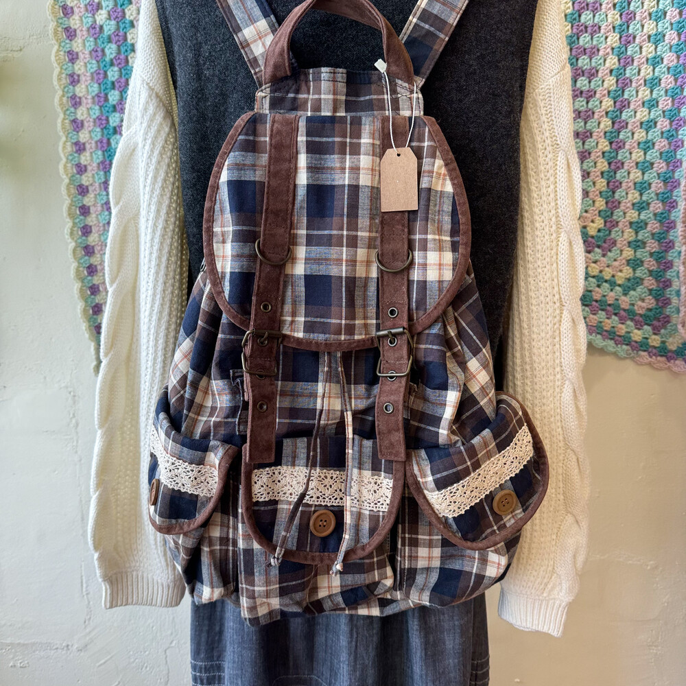 brown&navy check lace&pocket backpack
