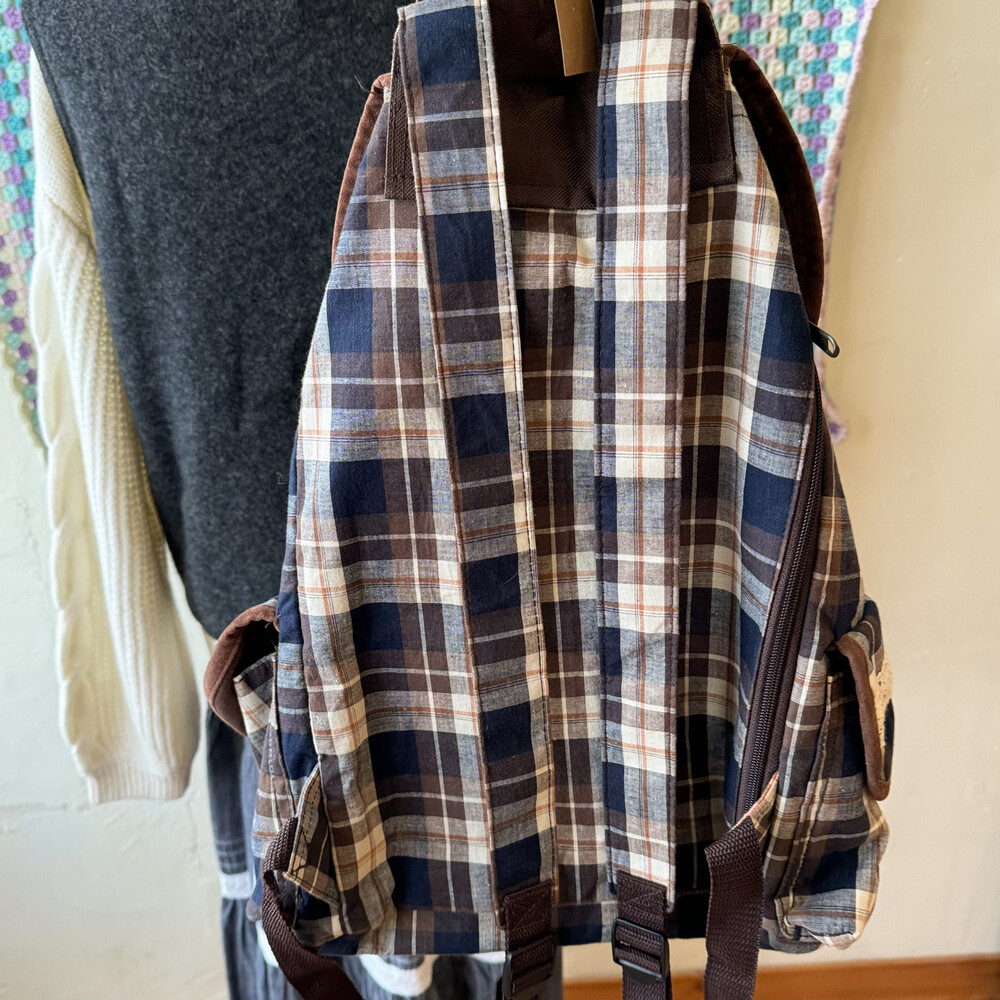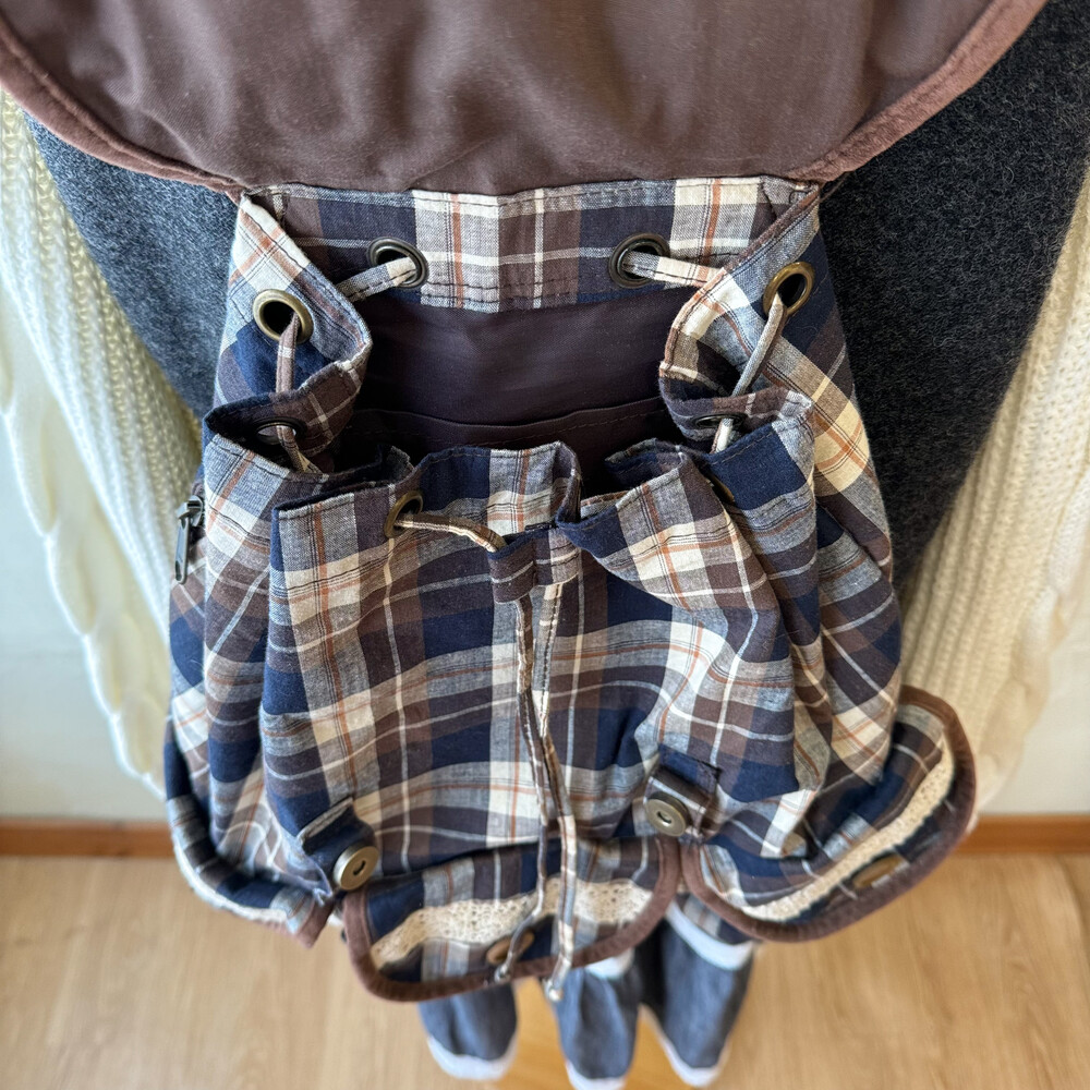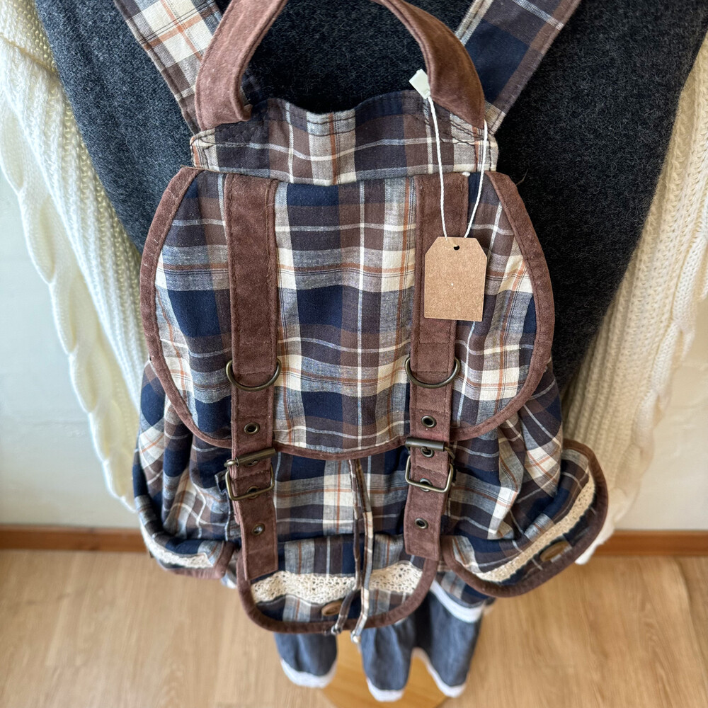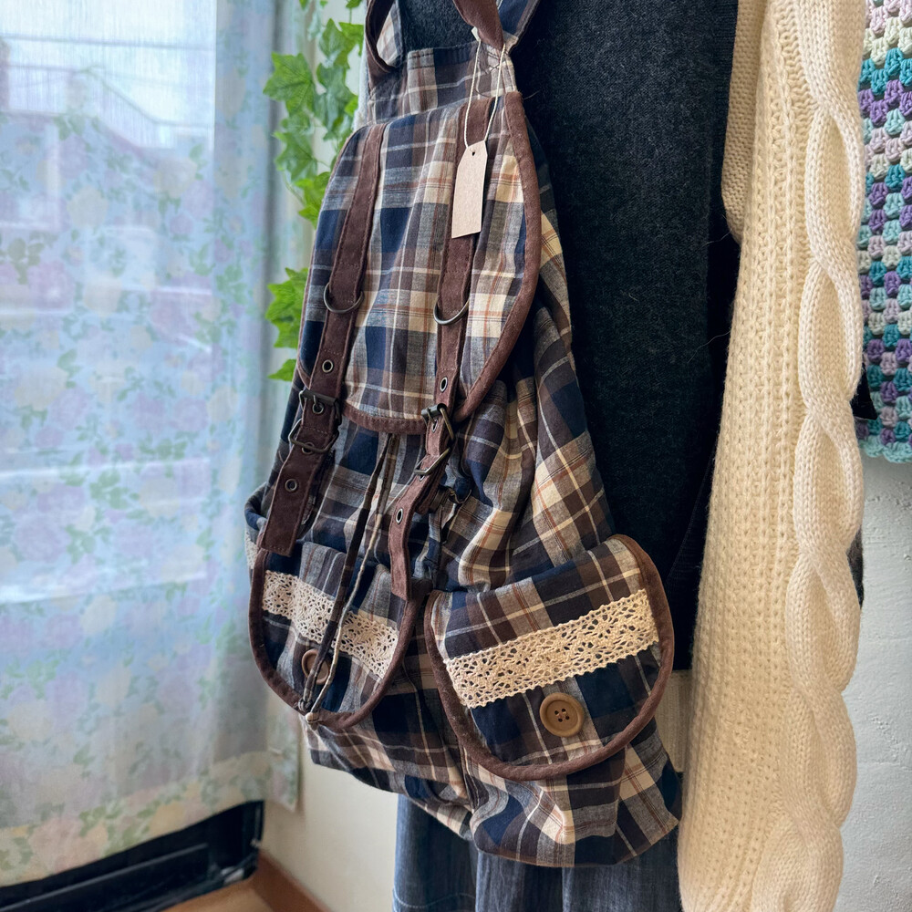 brown&navy check lace&pocket backpack