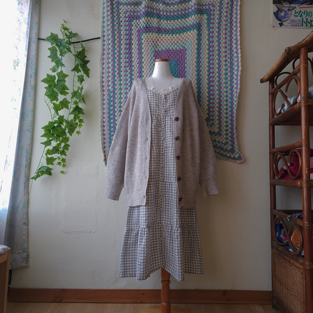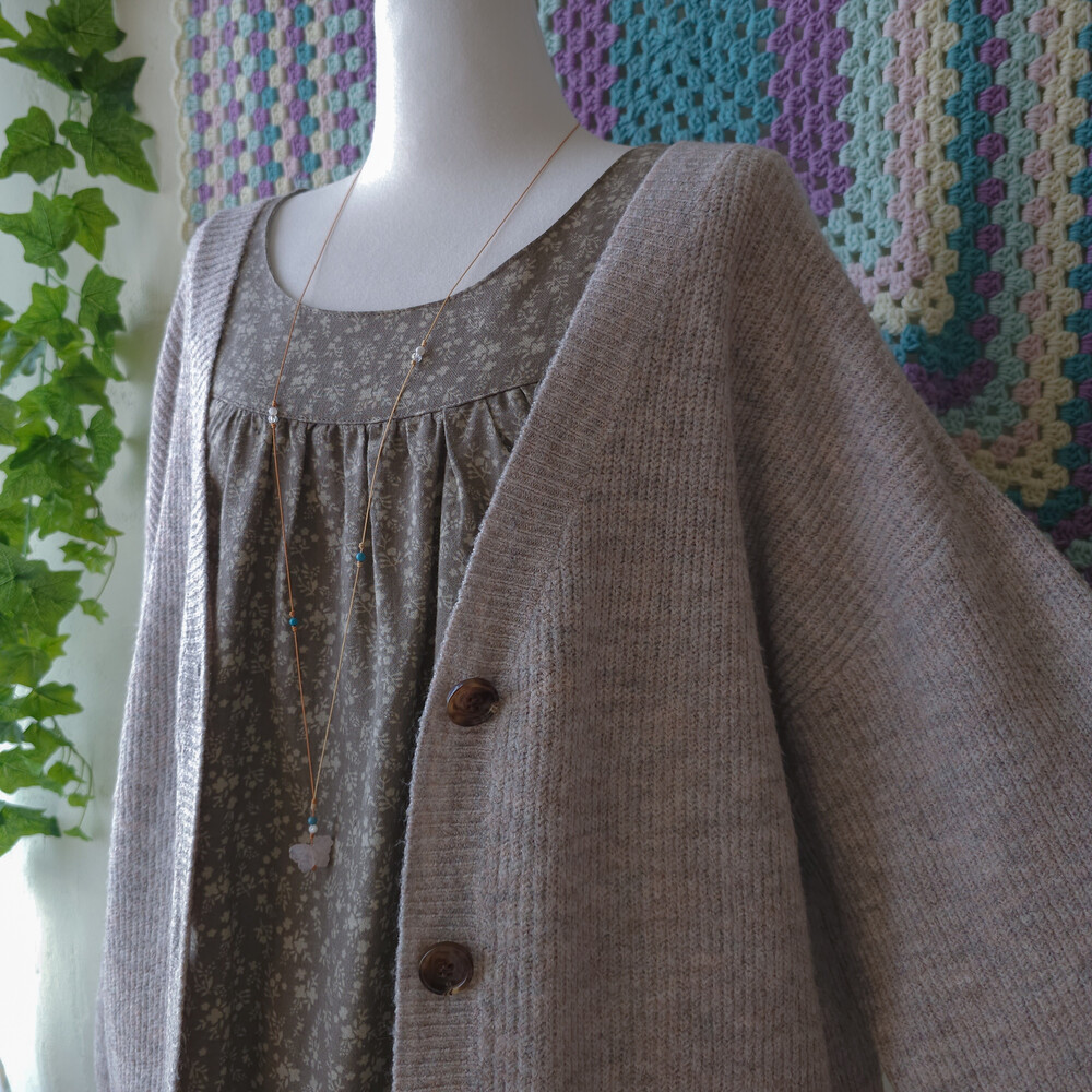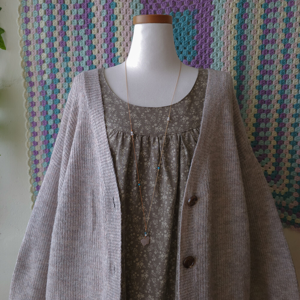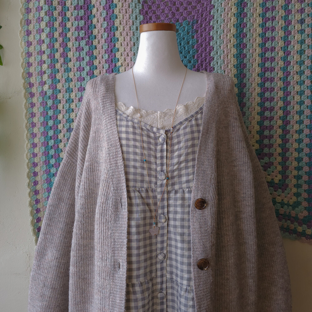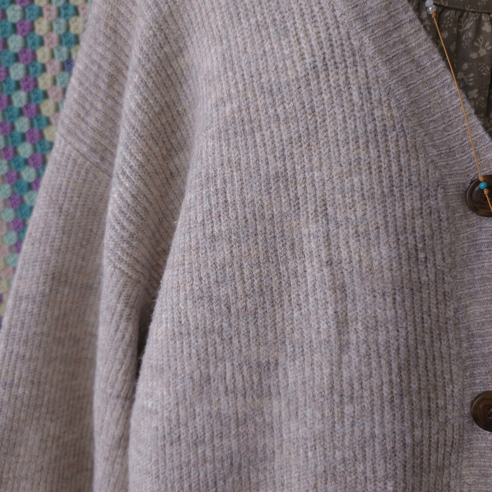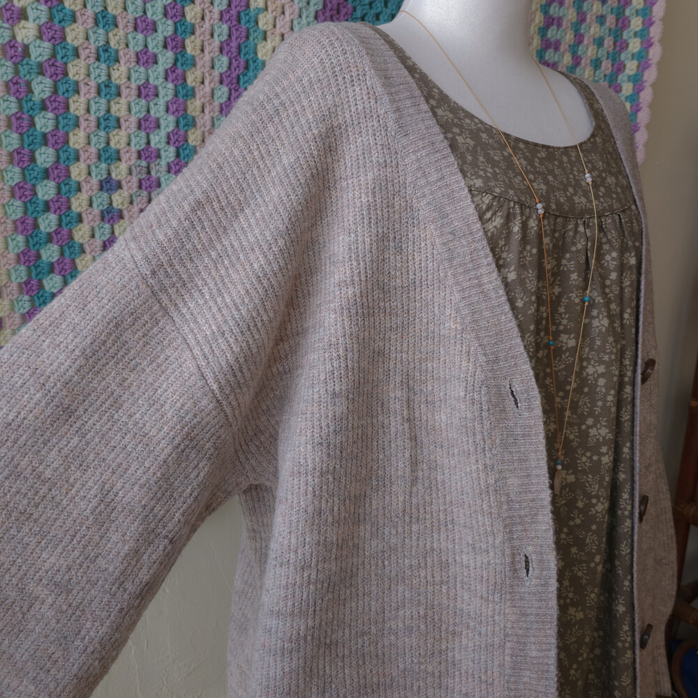 웜한 핑크와 그레이가 믹스된 색감의 가디건이에요