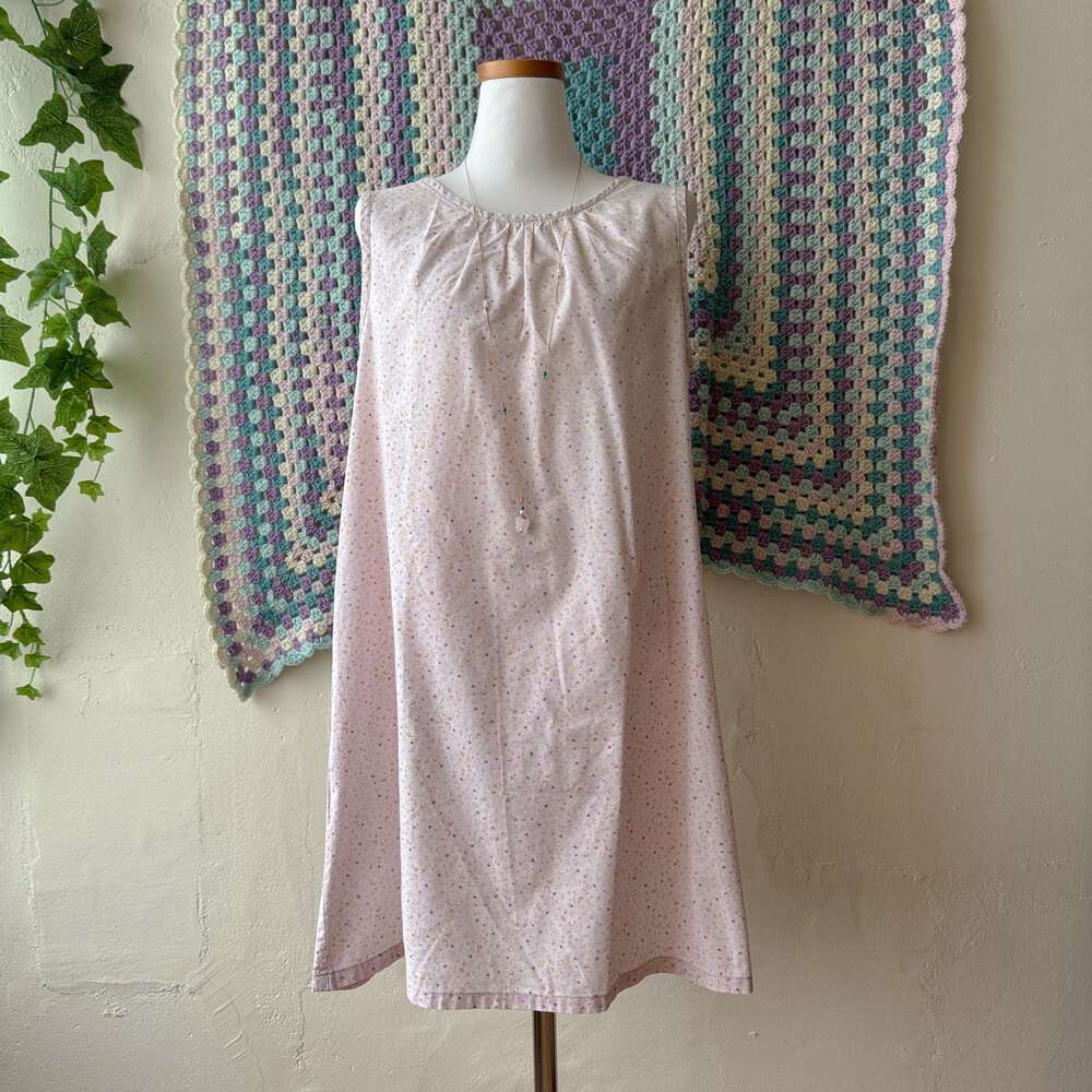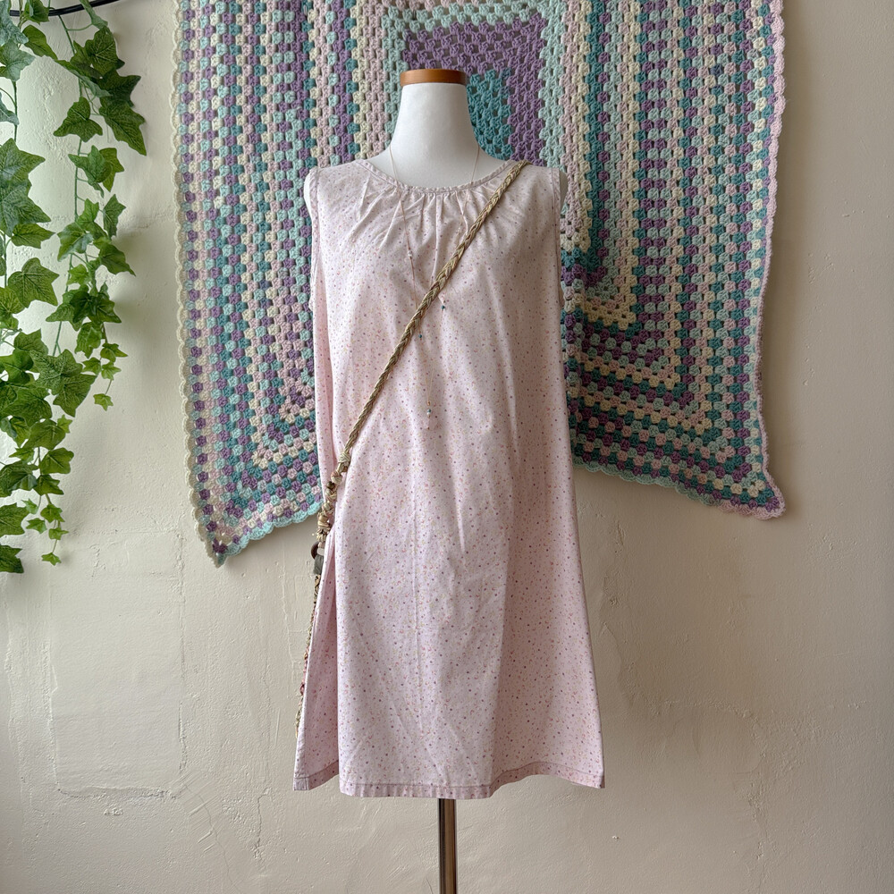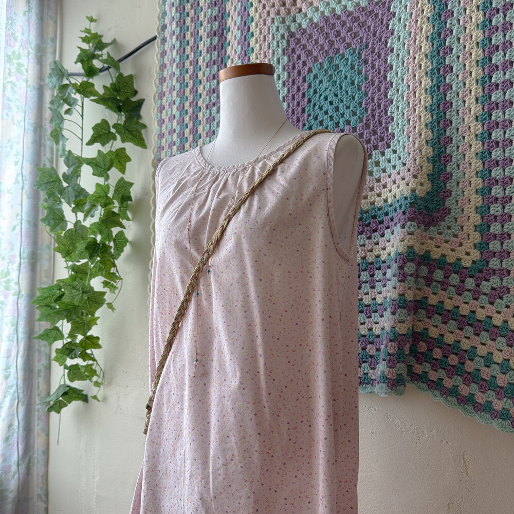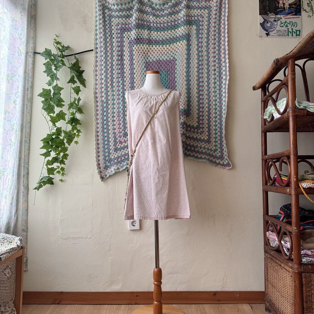 뮤트한 딸기우유색 바탕에 잔꽃무늬가 들어간 원피스예요