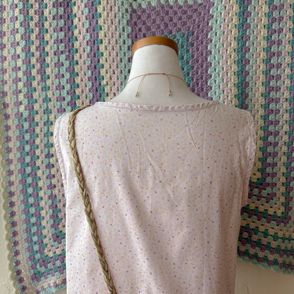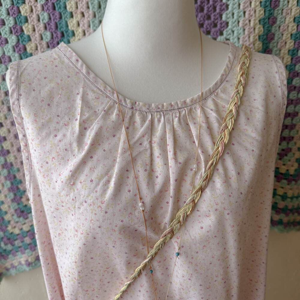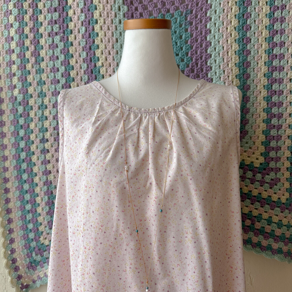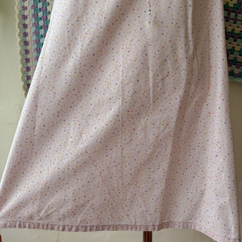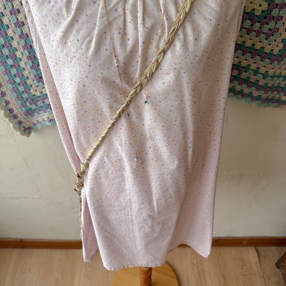 뮤트한 딸기우유색 바탕에 잔꽃무늬가 들어간 원피스예요