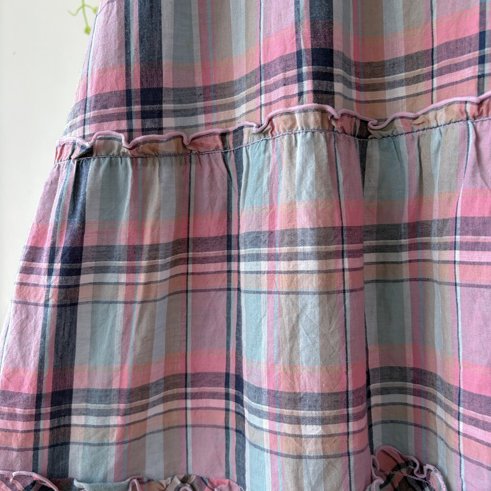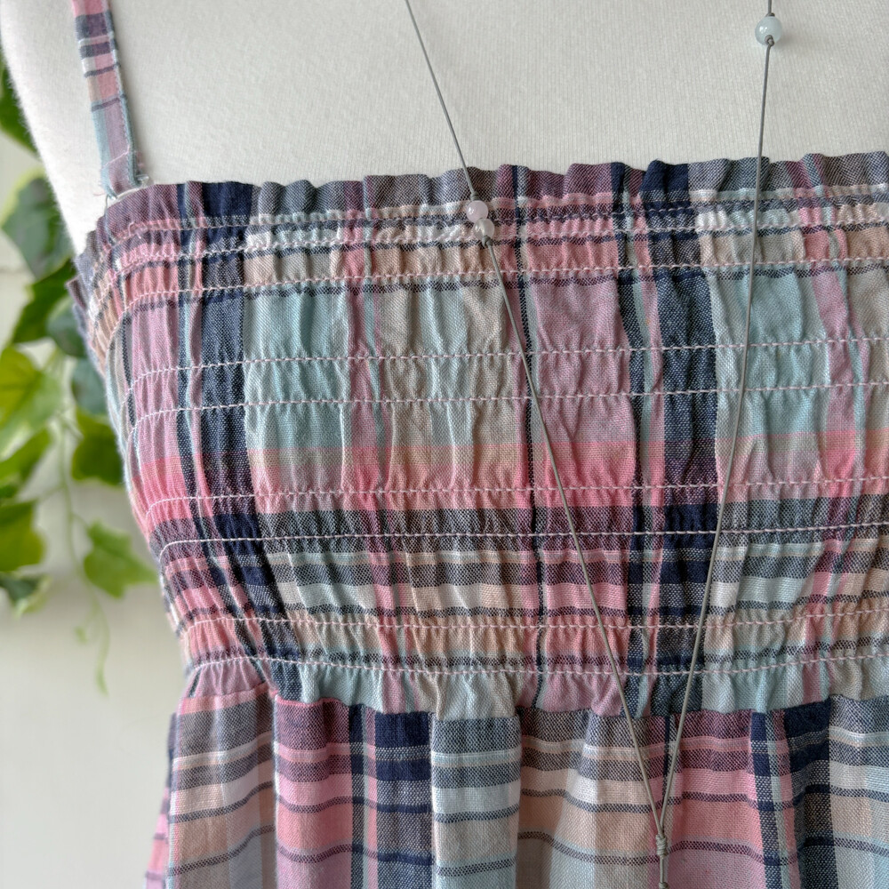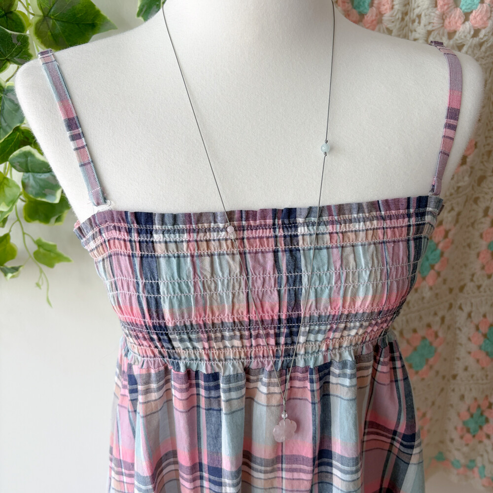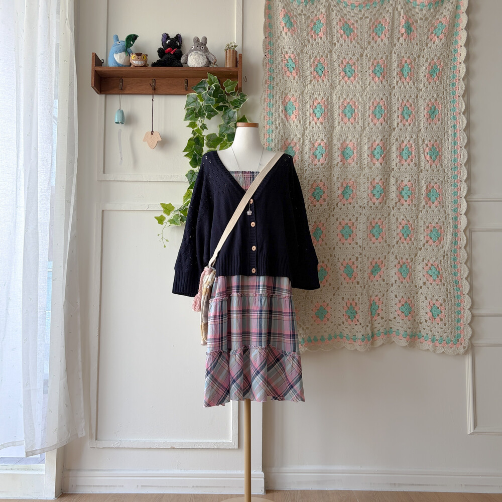 핑크, 소라, 네이비 색감 조합의 체크 끈원피스예요
