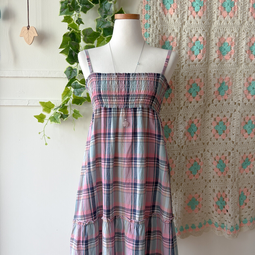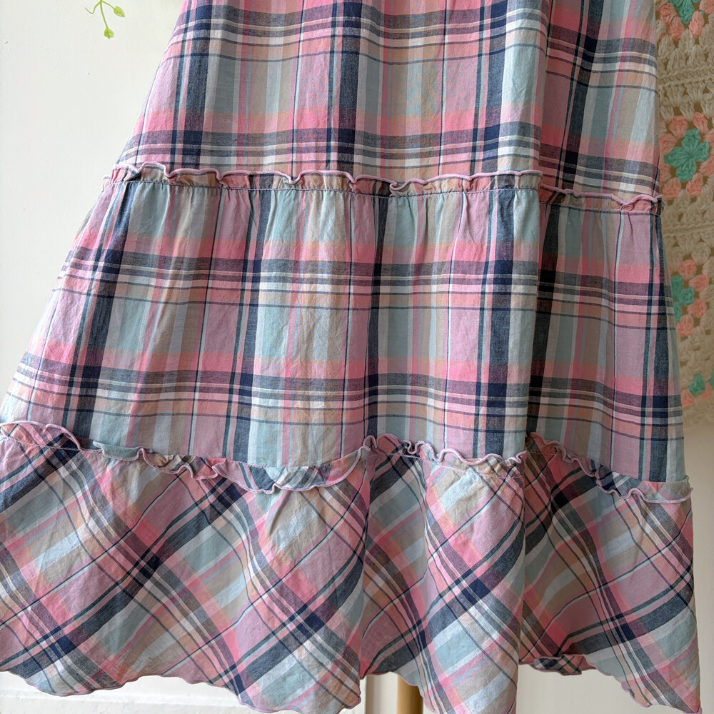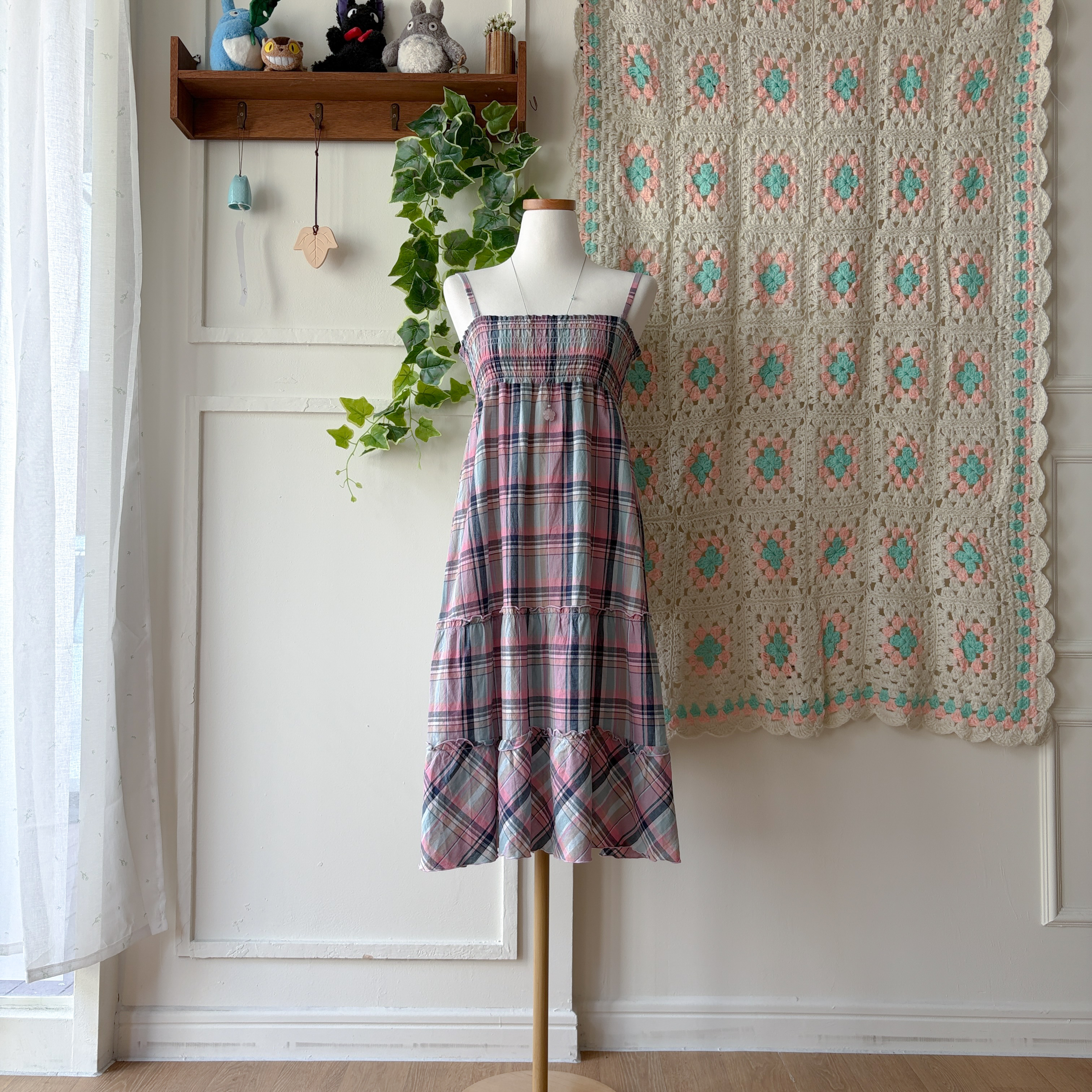 핑크, 소라, 네이비 색감 조합의 체크 끈원피스예요