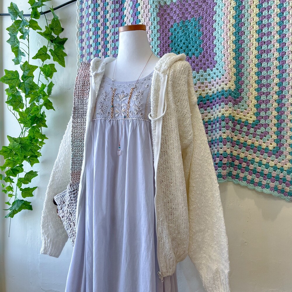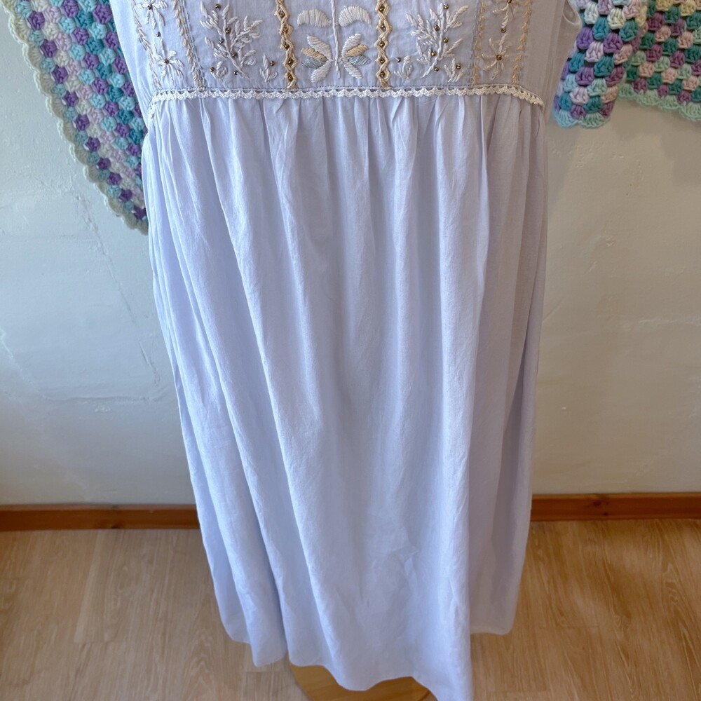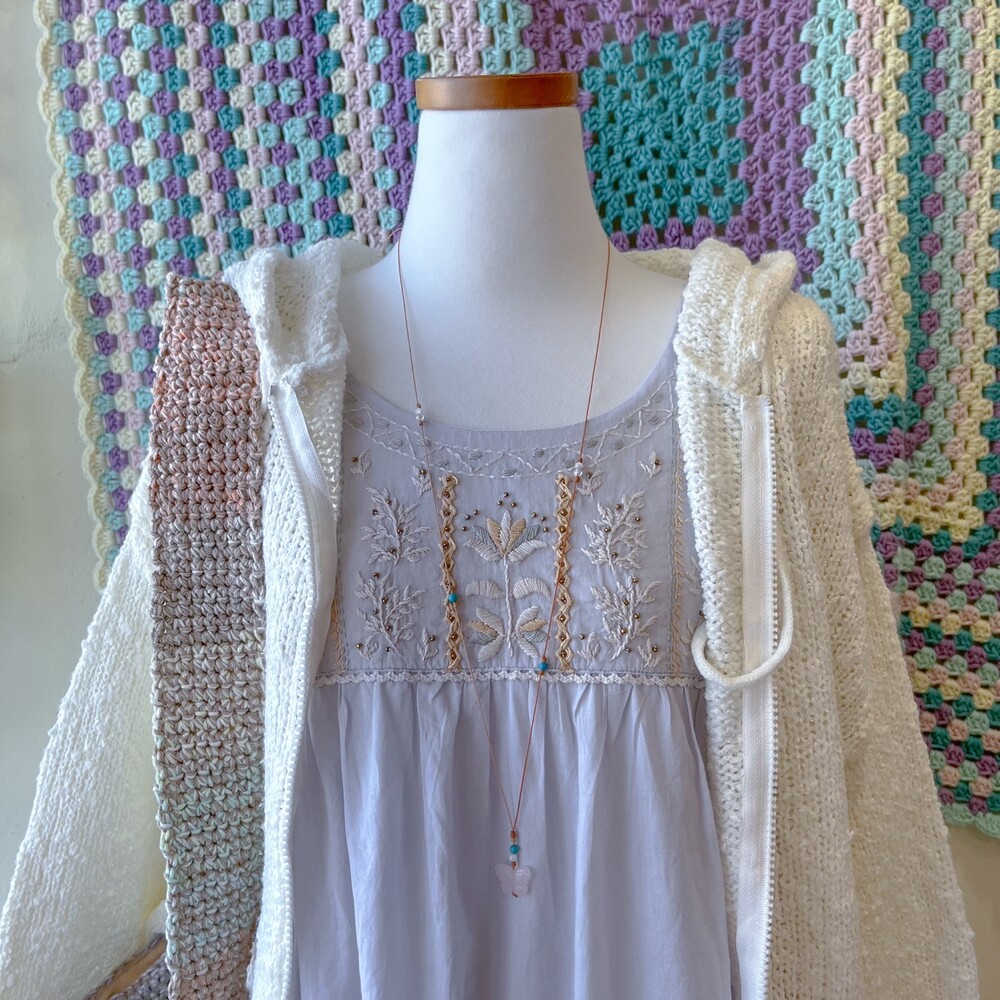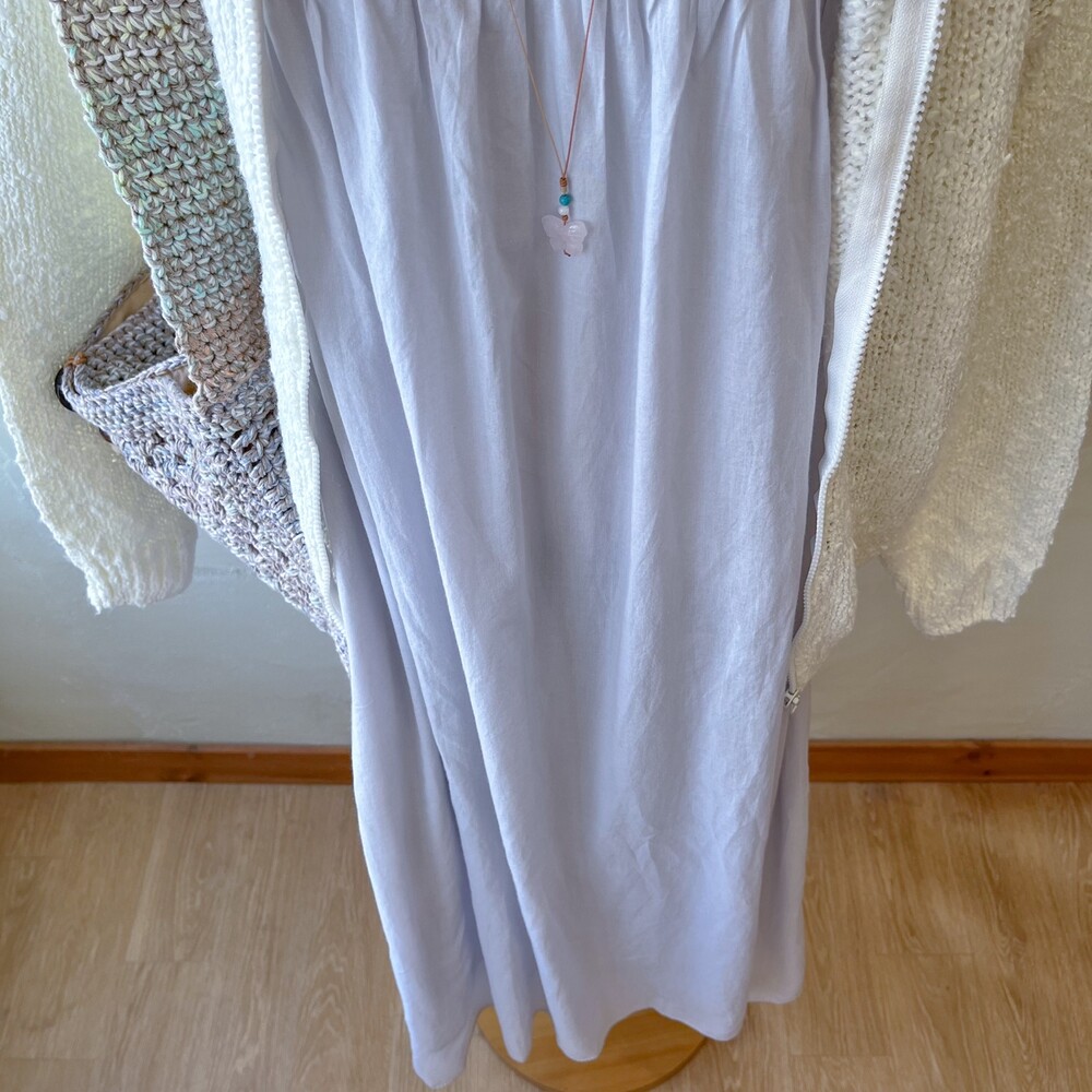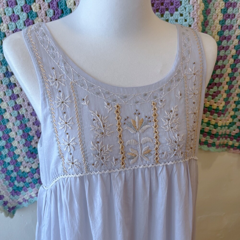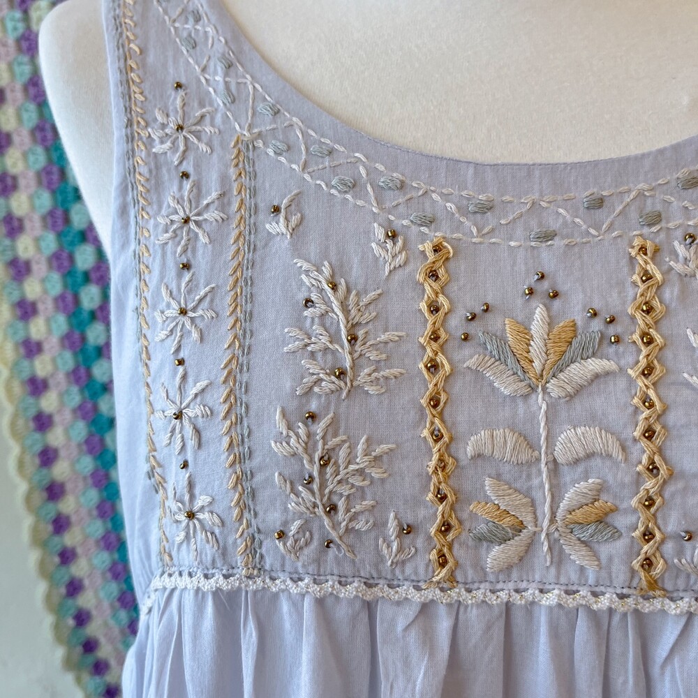 뮤트한 청보라색감의 민소매 자수 원피스예요