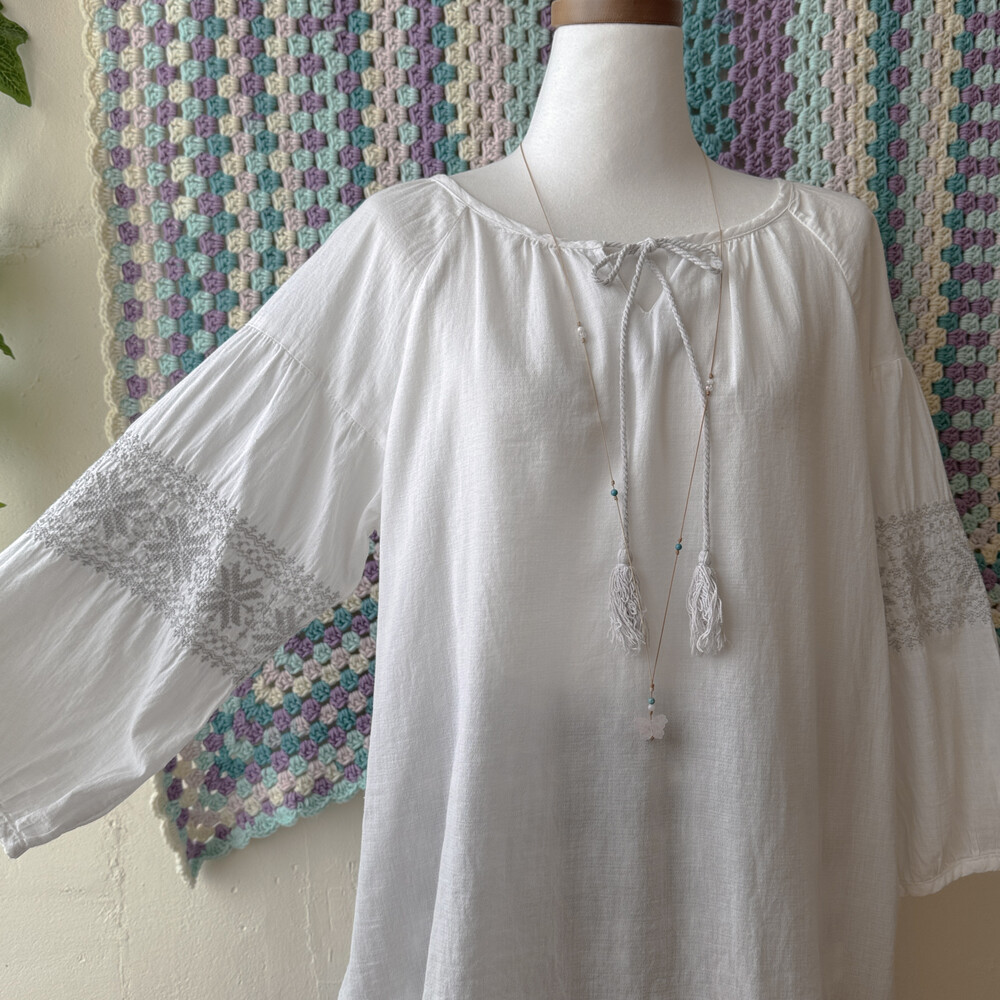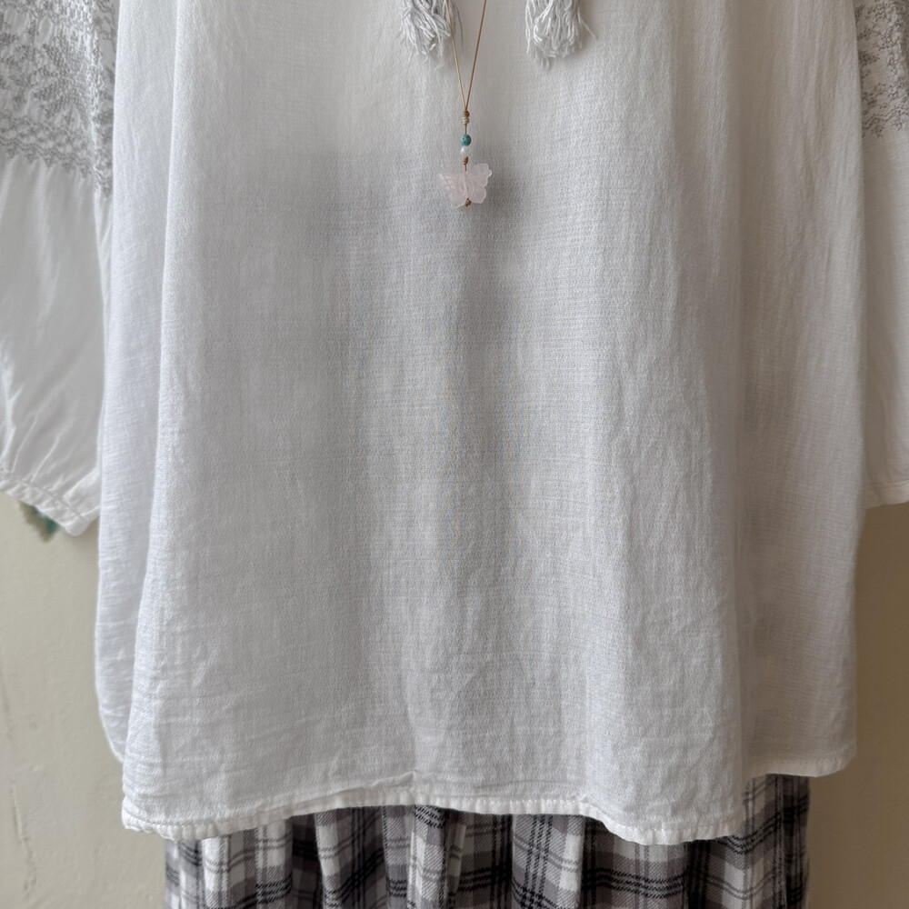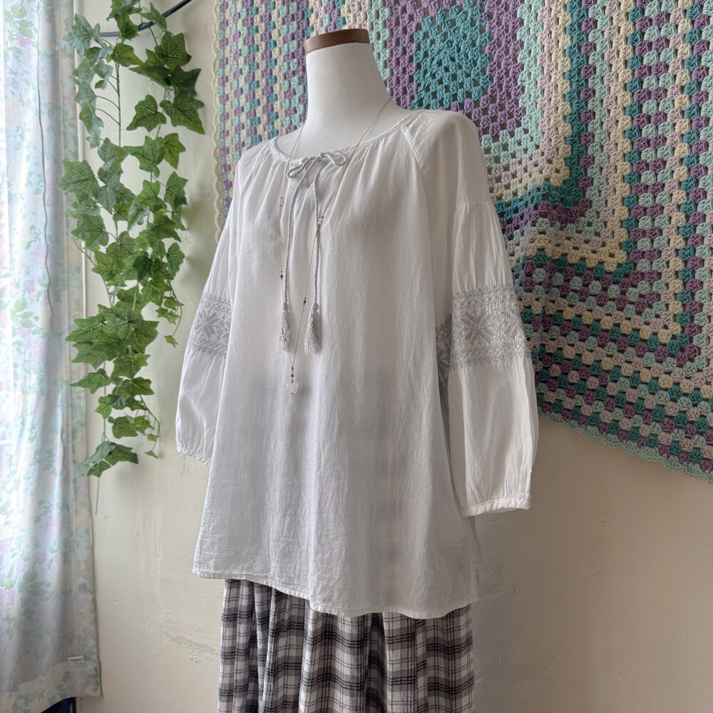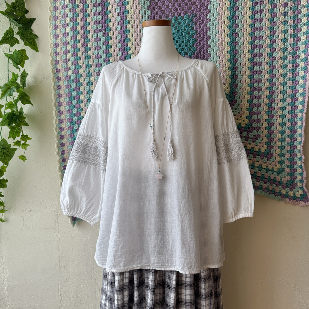 화이트 색감의 자수 포인트 블라우스예요