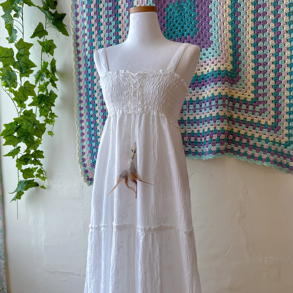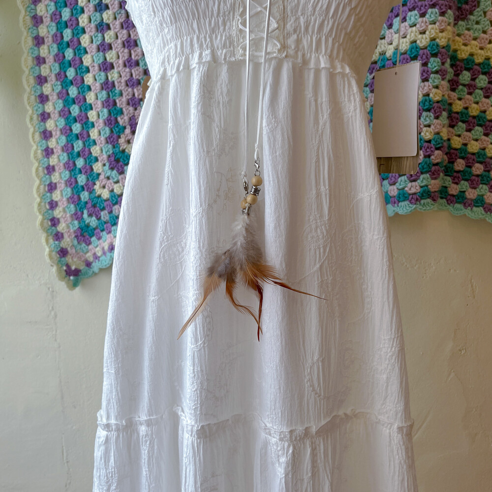 화이트 자수 포인트의 아일렛 끈원피스예요