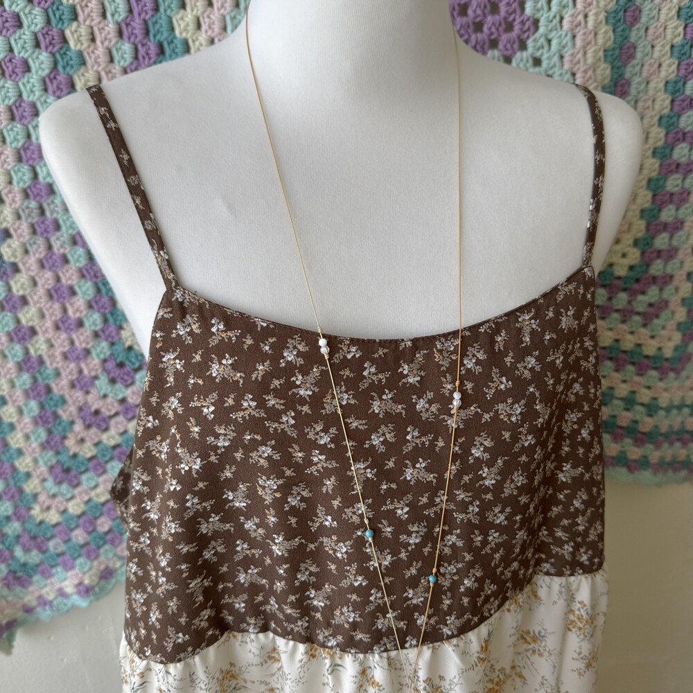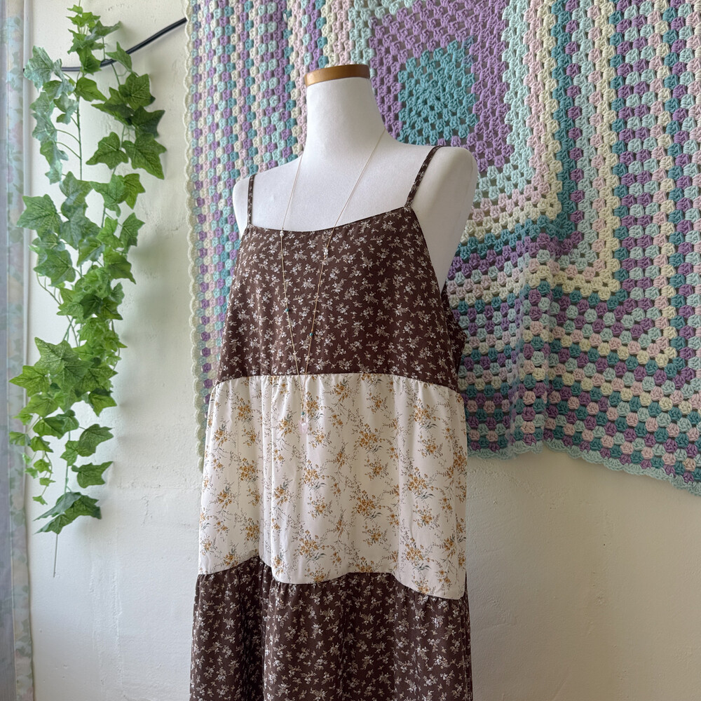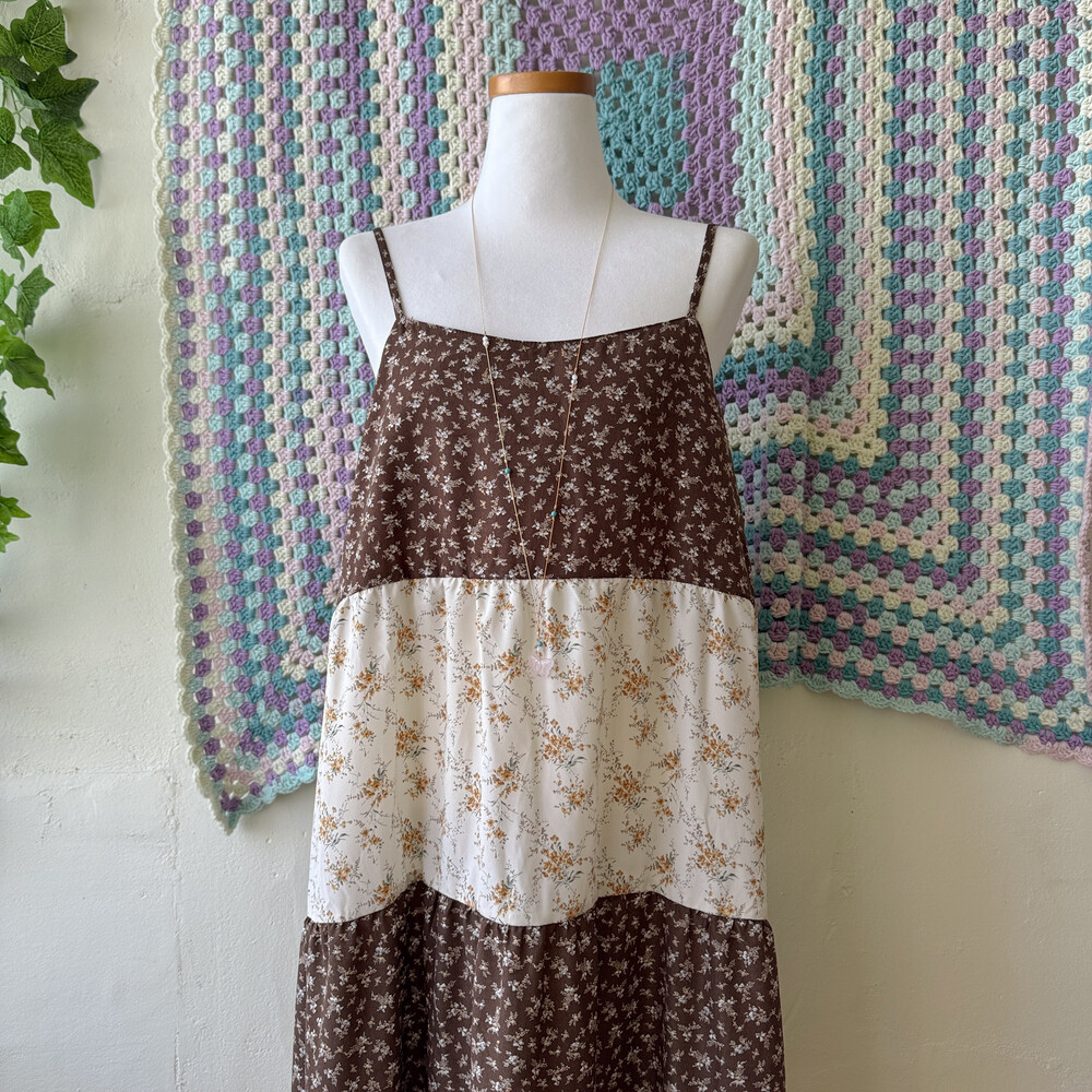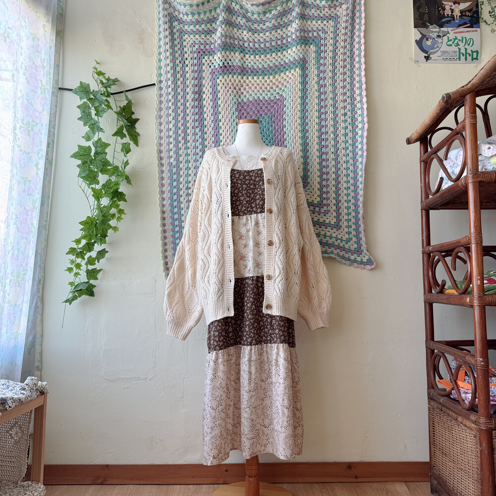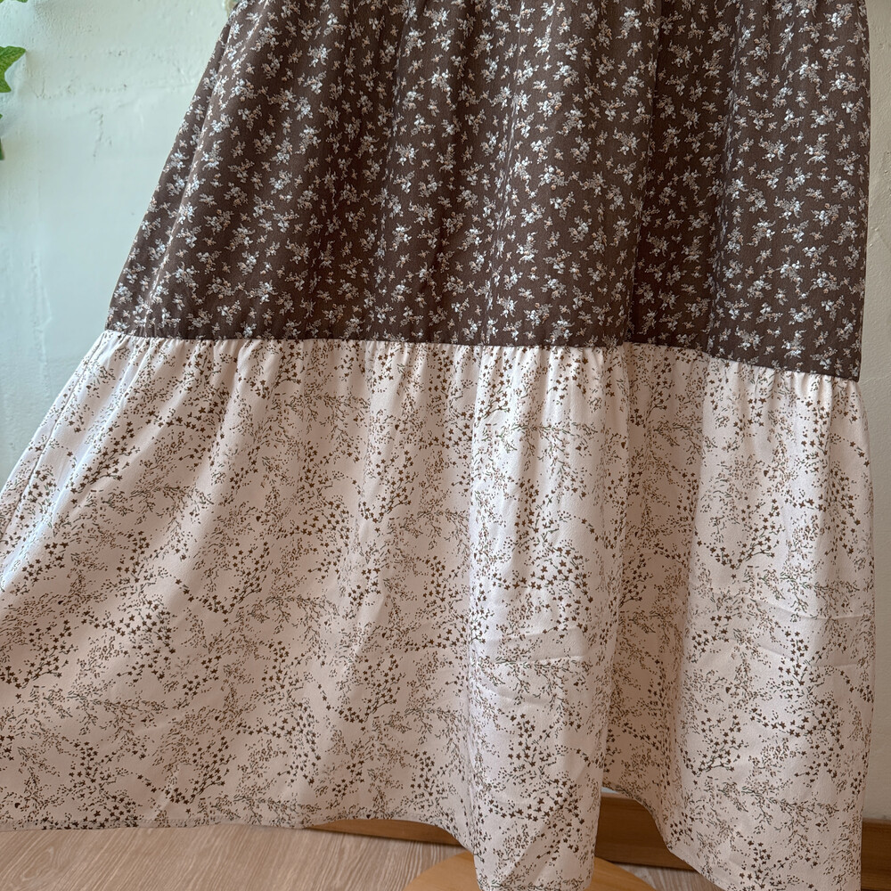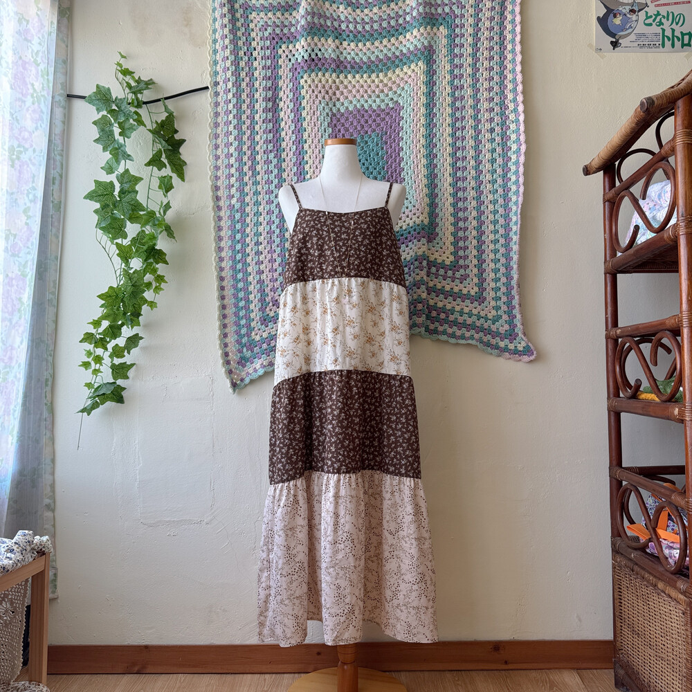 브라운, 연핑크, 아이보리 등 조합의 패치워크 끈원피스예요