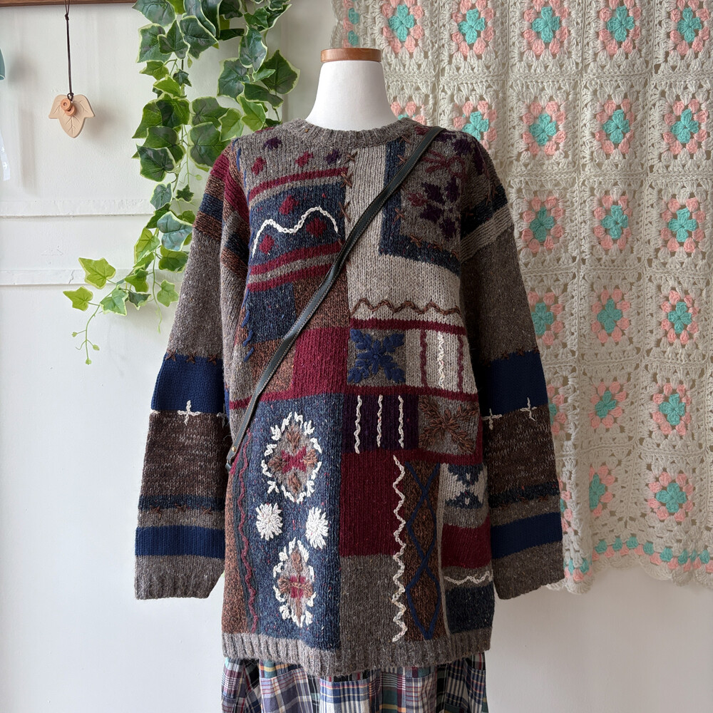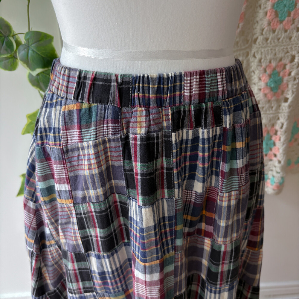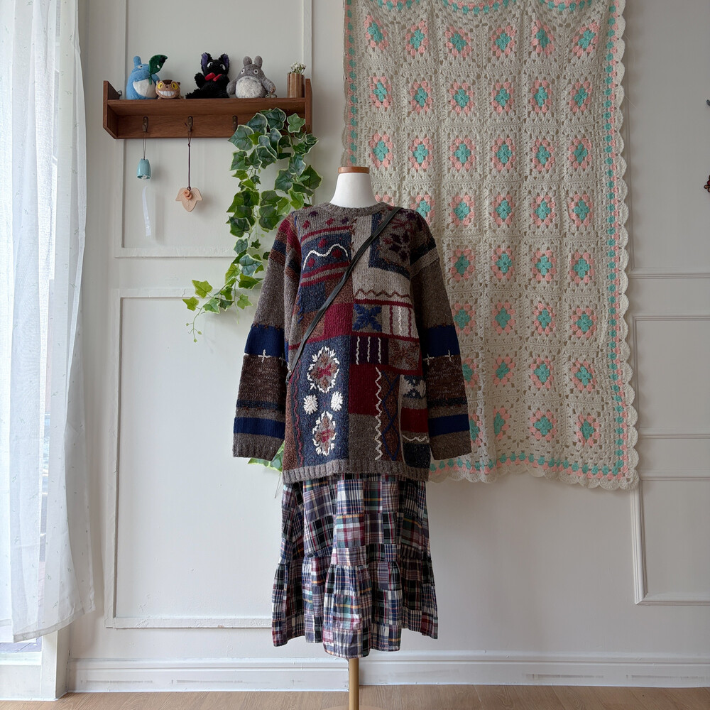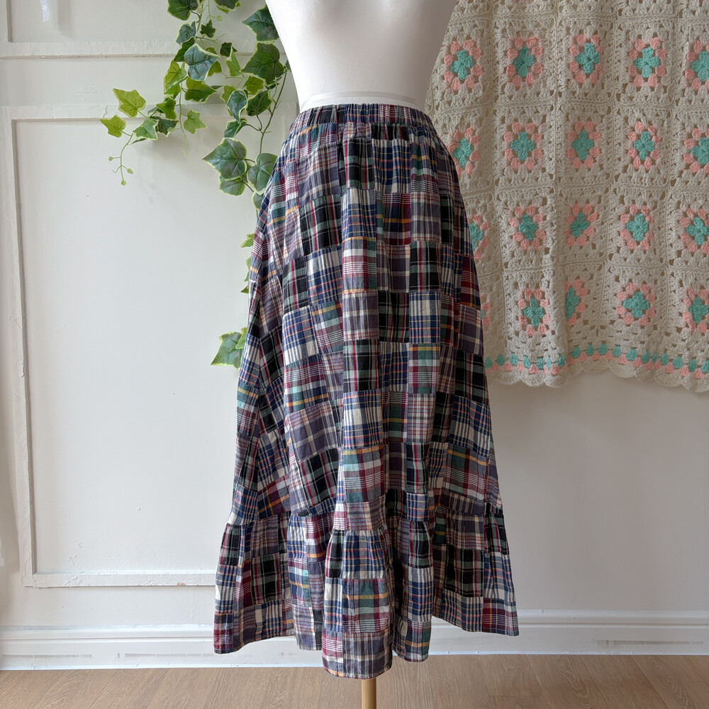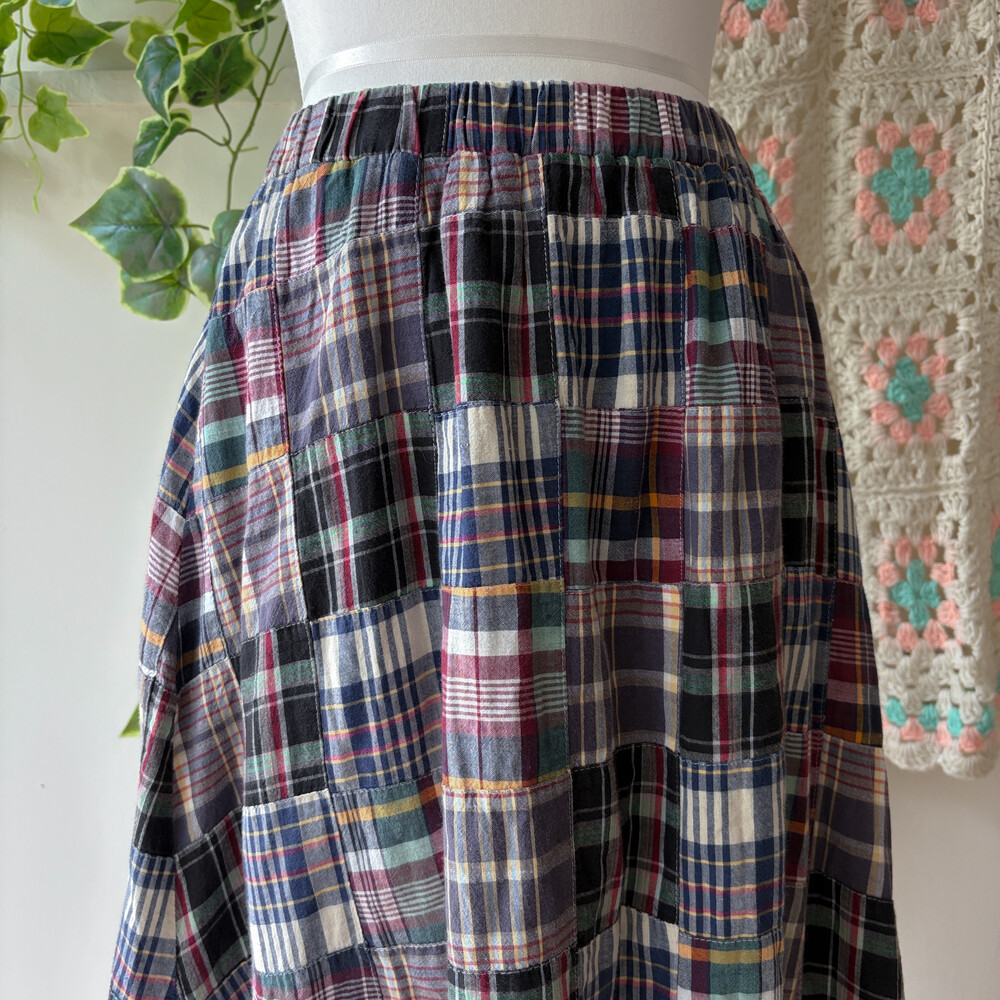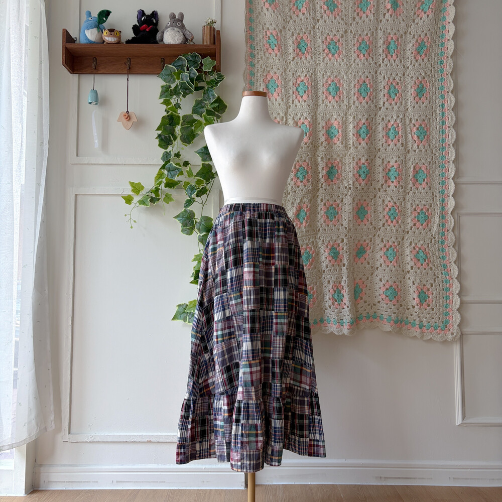 네이비, 그린, 버건디 등 색감 조합의 패치워크 스커트예요