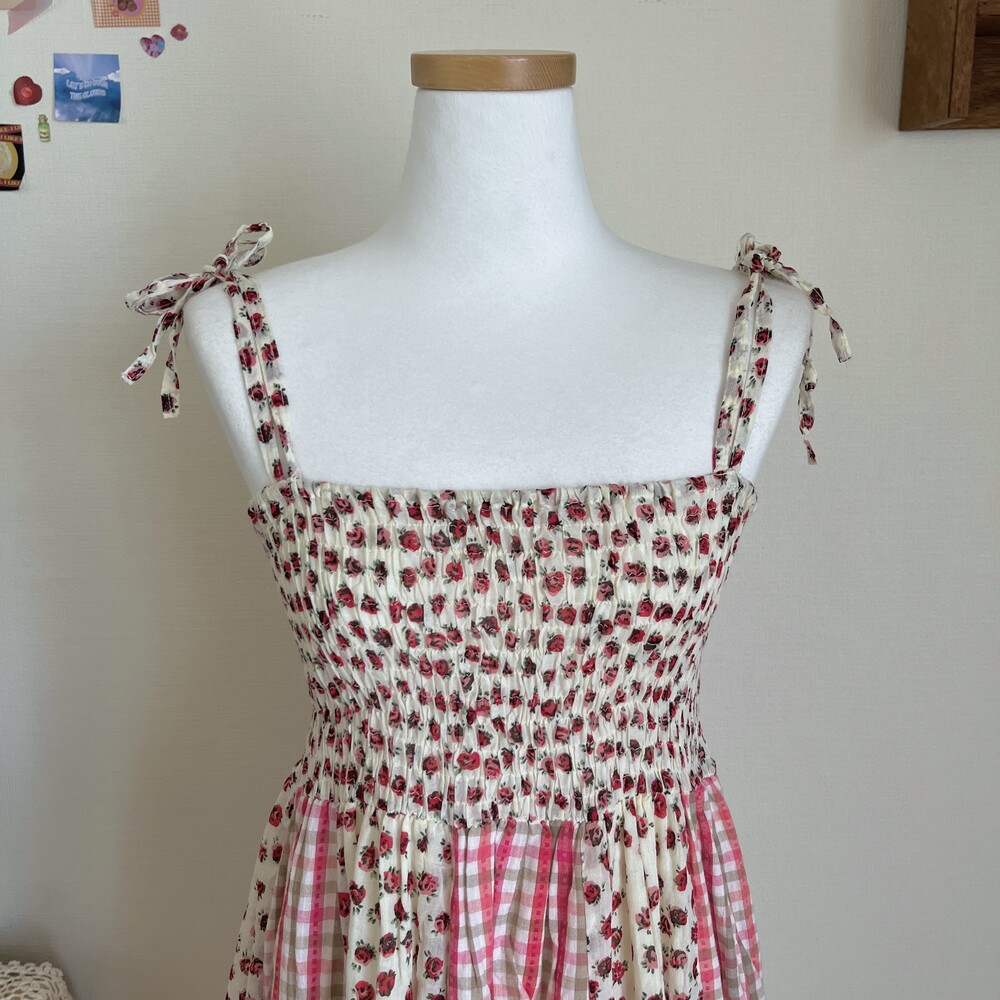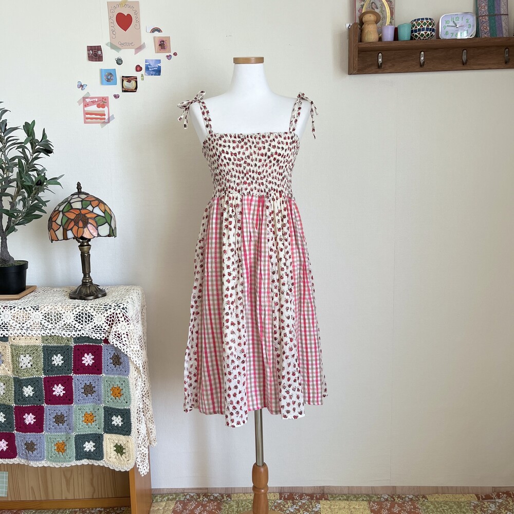 핑크색감 베이스의 세로 패치 끈원피스예요