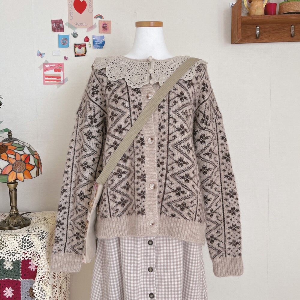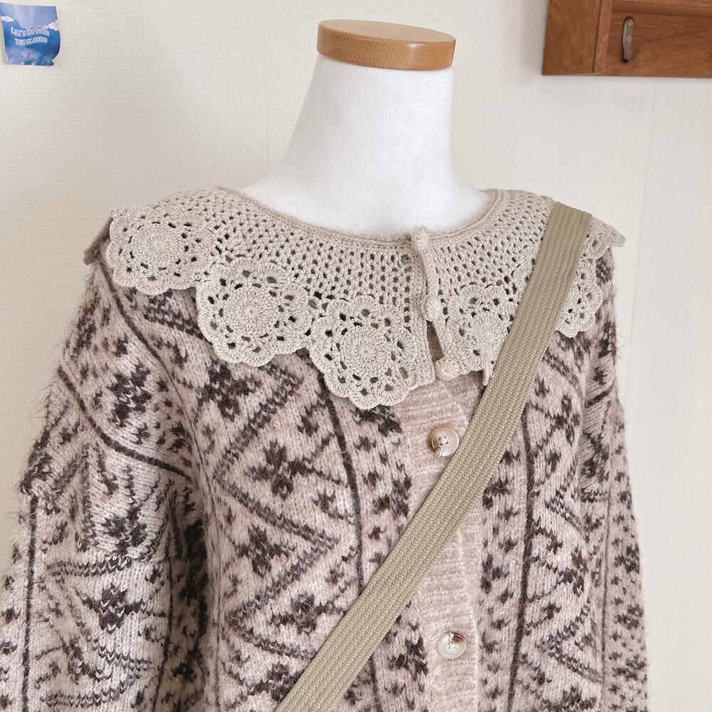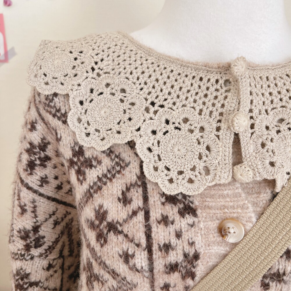 크로셰 카라 포인트의 베이지 패턴 가디건이에요