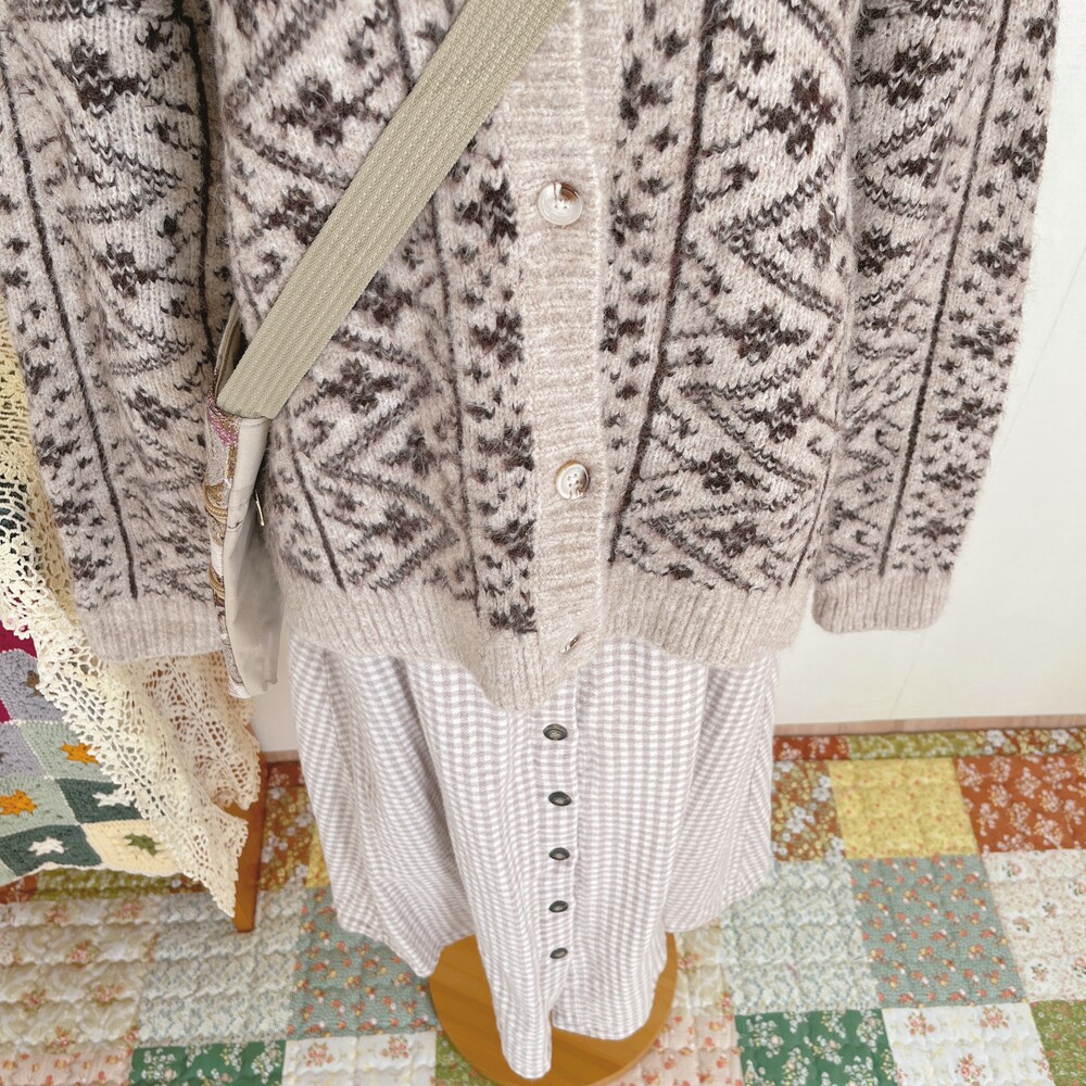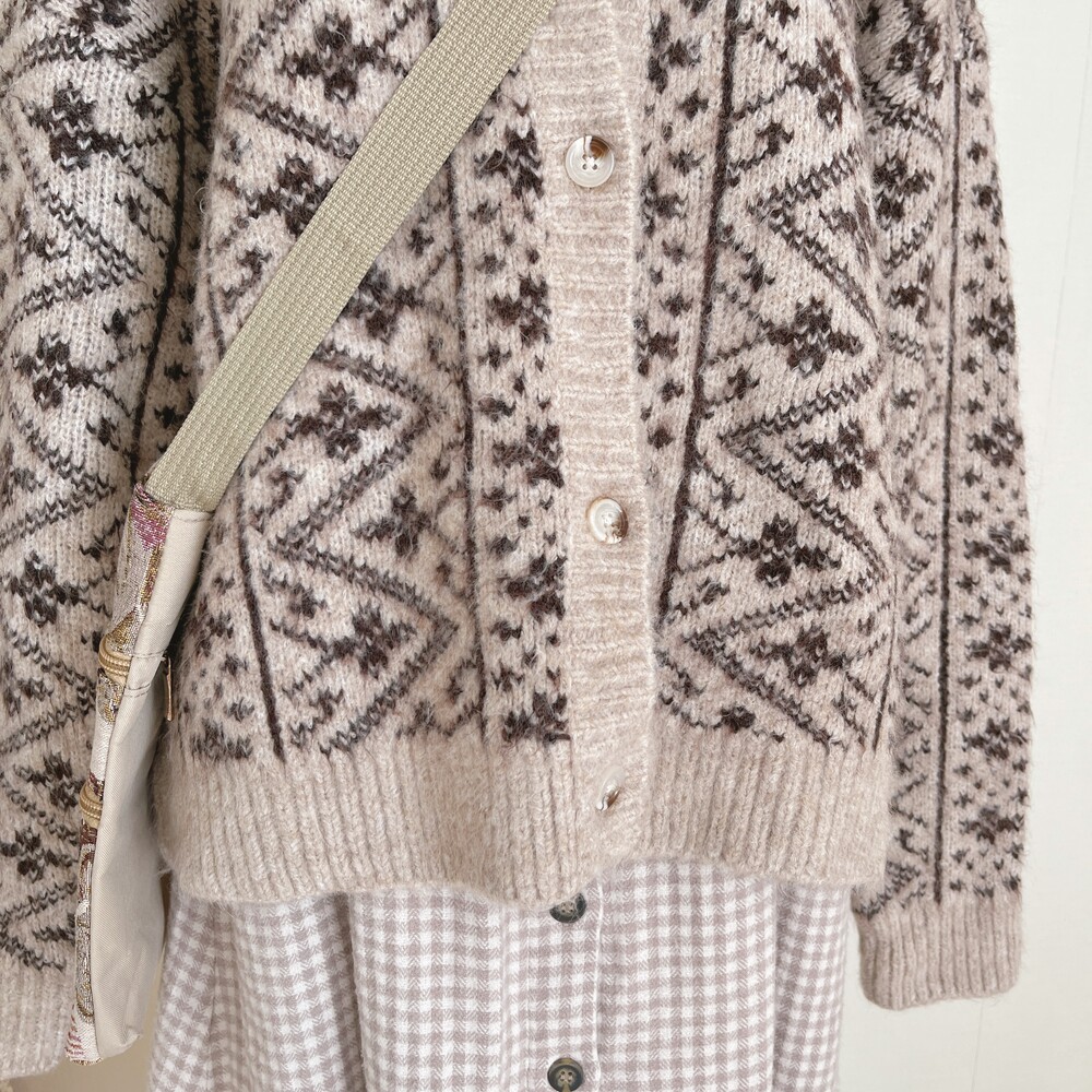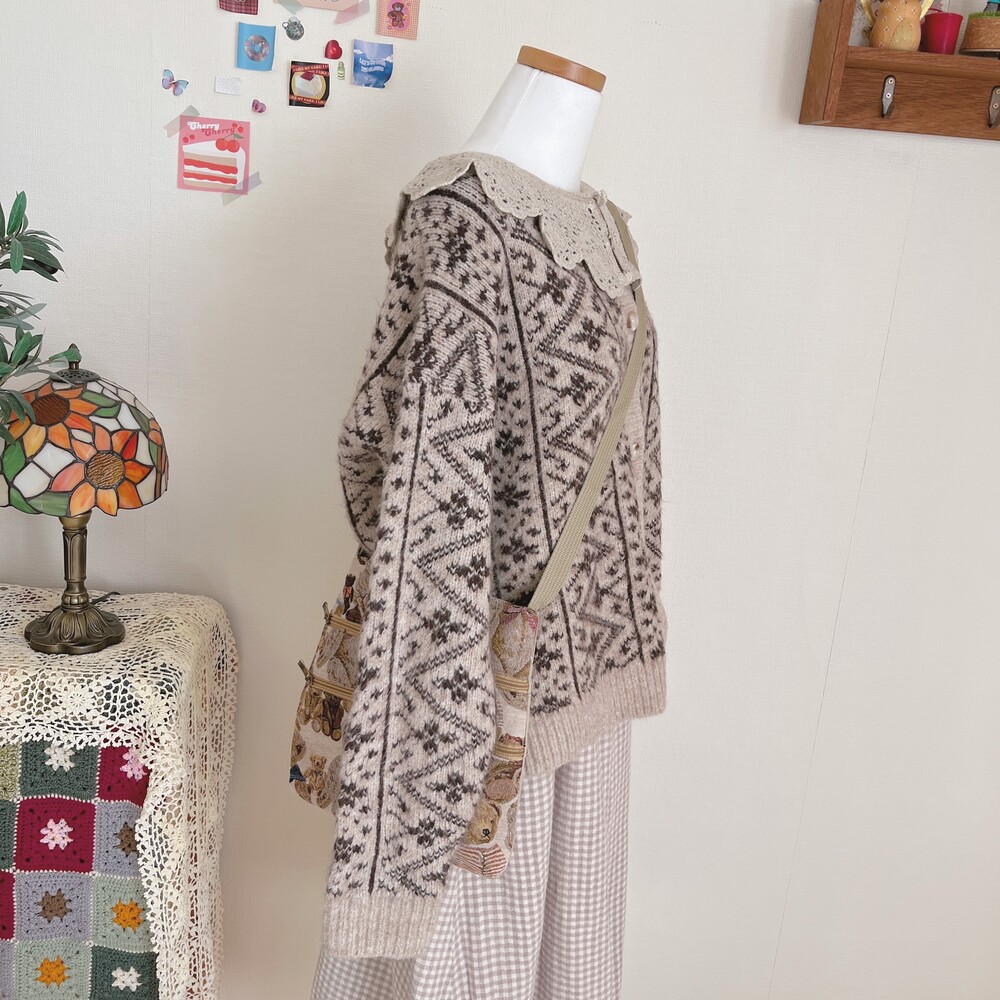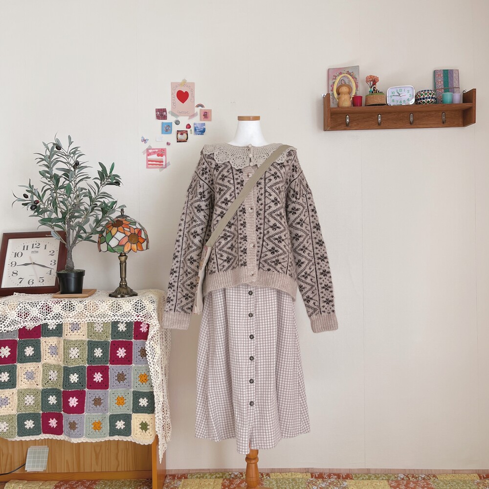 크로셰 카라 포인트의 베이지 패턴 가디건이에요