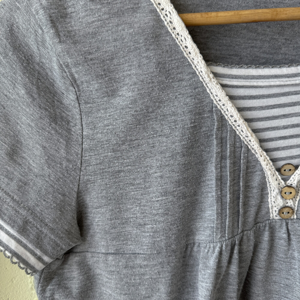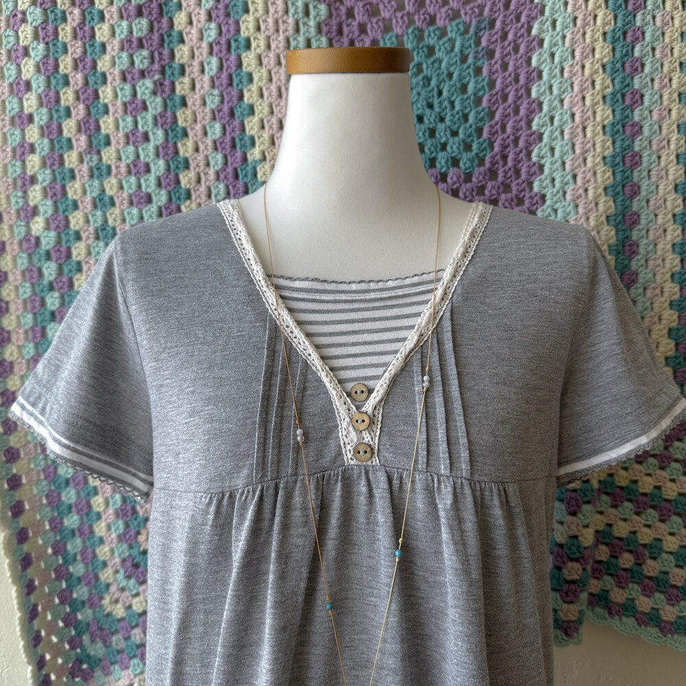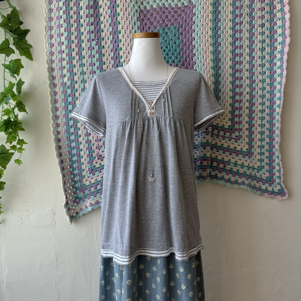 gray stirpe&wood button layered top