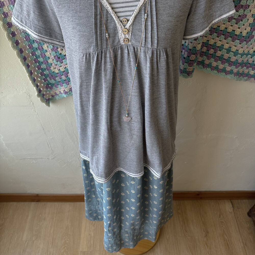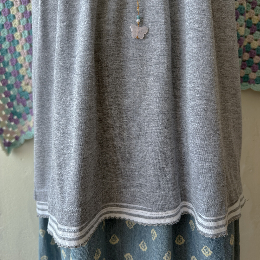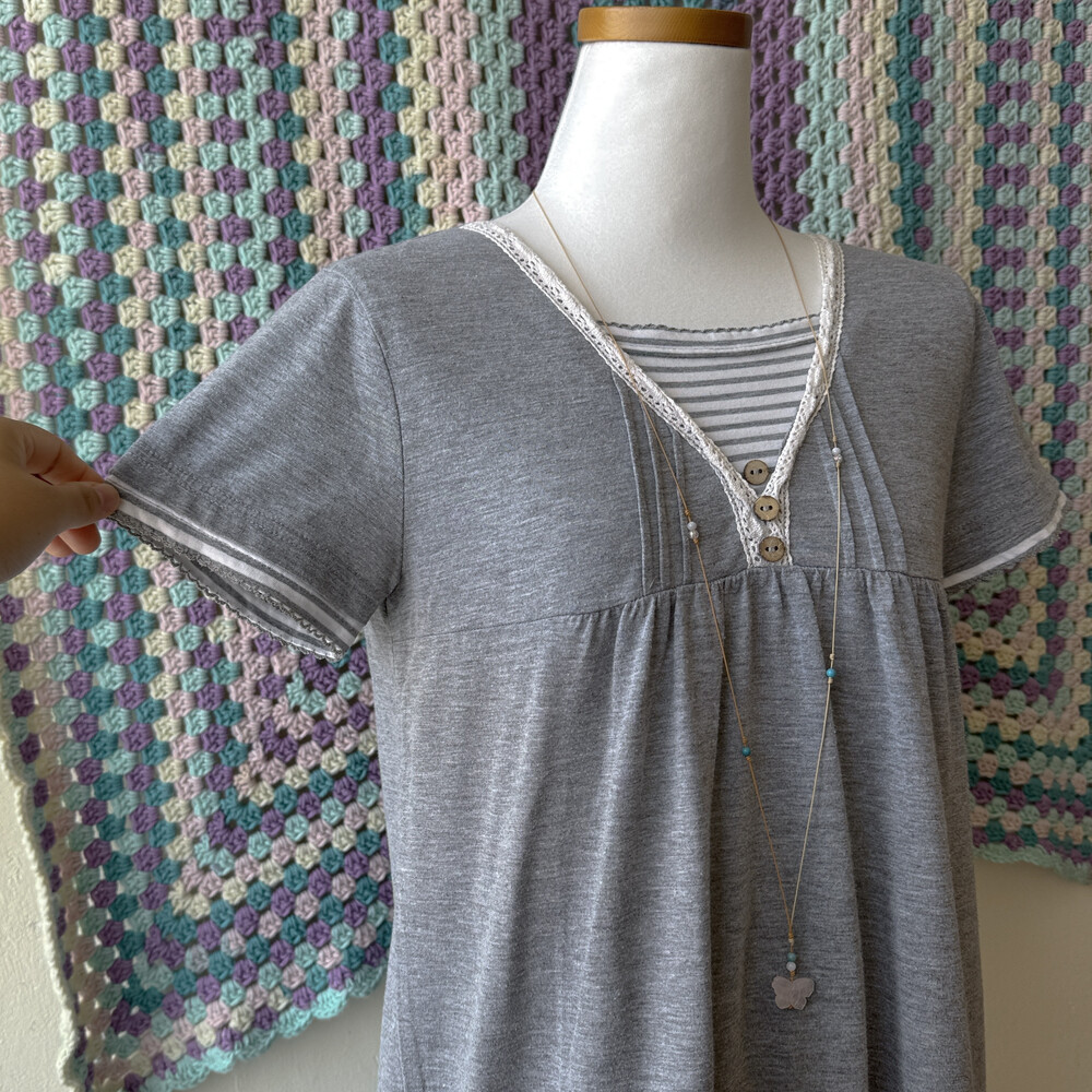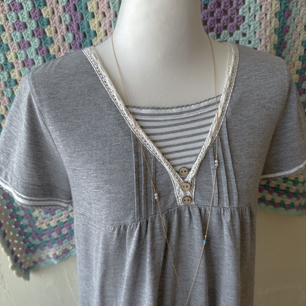 gray stirpe&wood button layered top