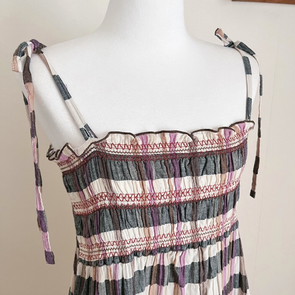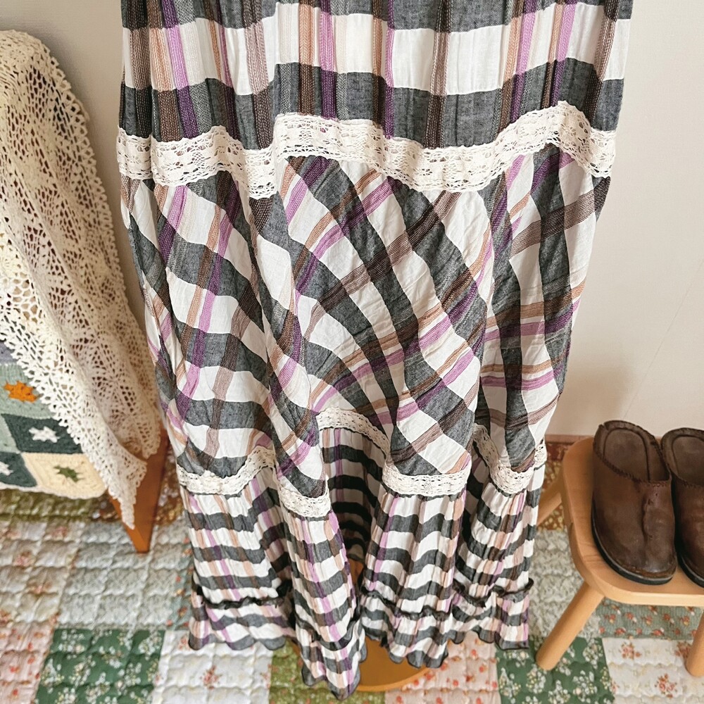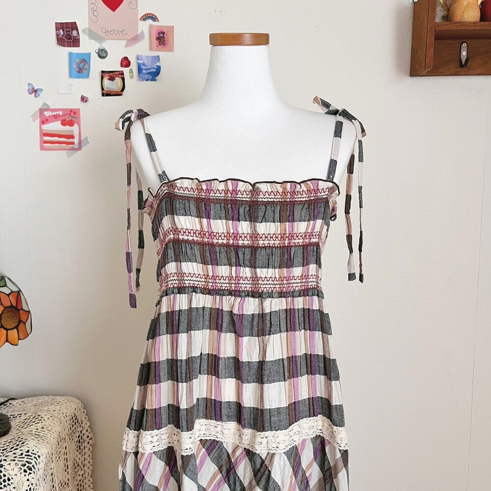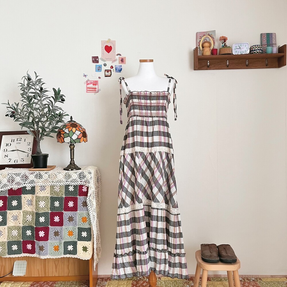 그레이와 브라운, 보라 색감 조합의 체크 끈원피스예요