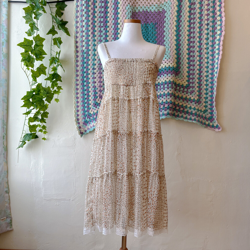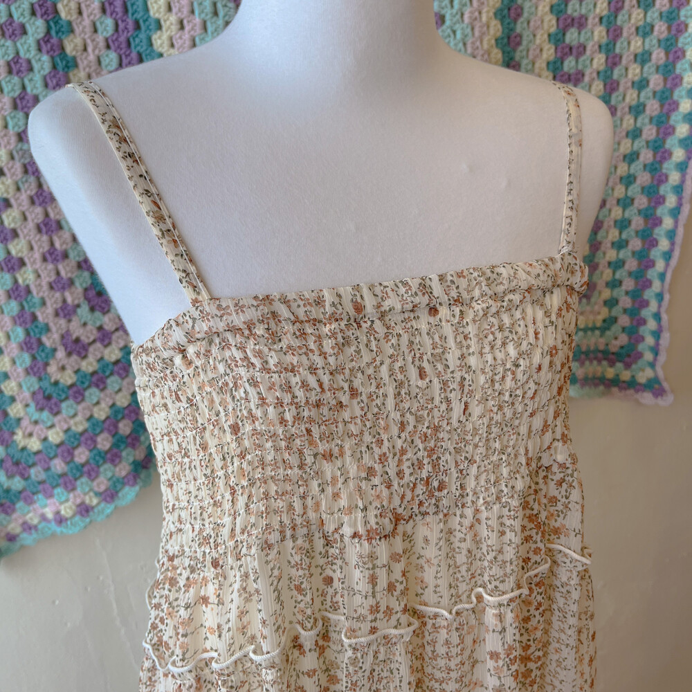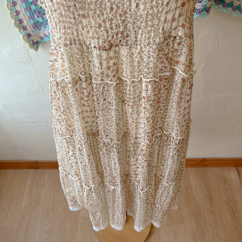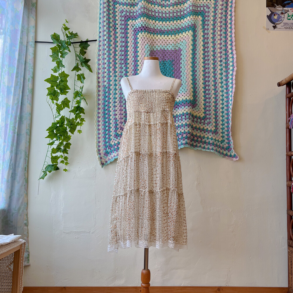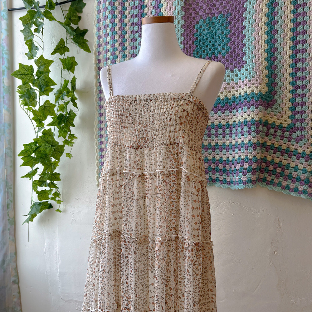 살구, 브라운 잔꽃 패턴의 쉬폰 끈원피스예요