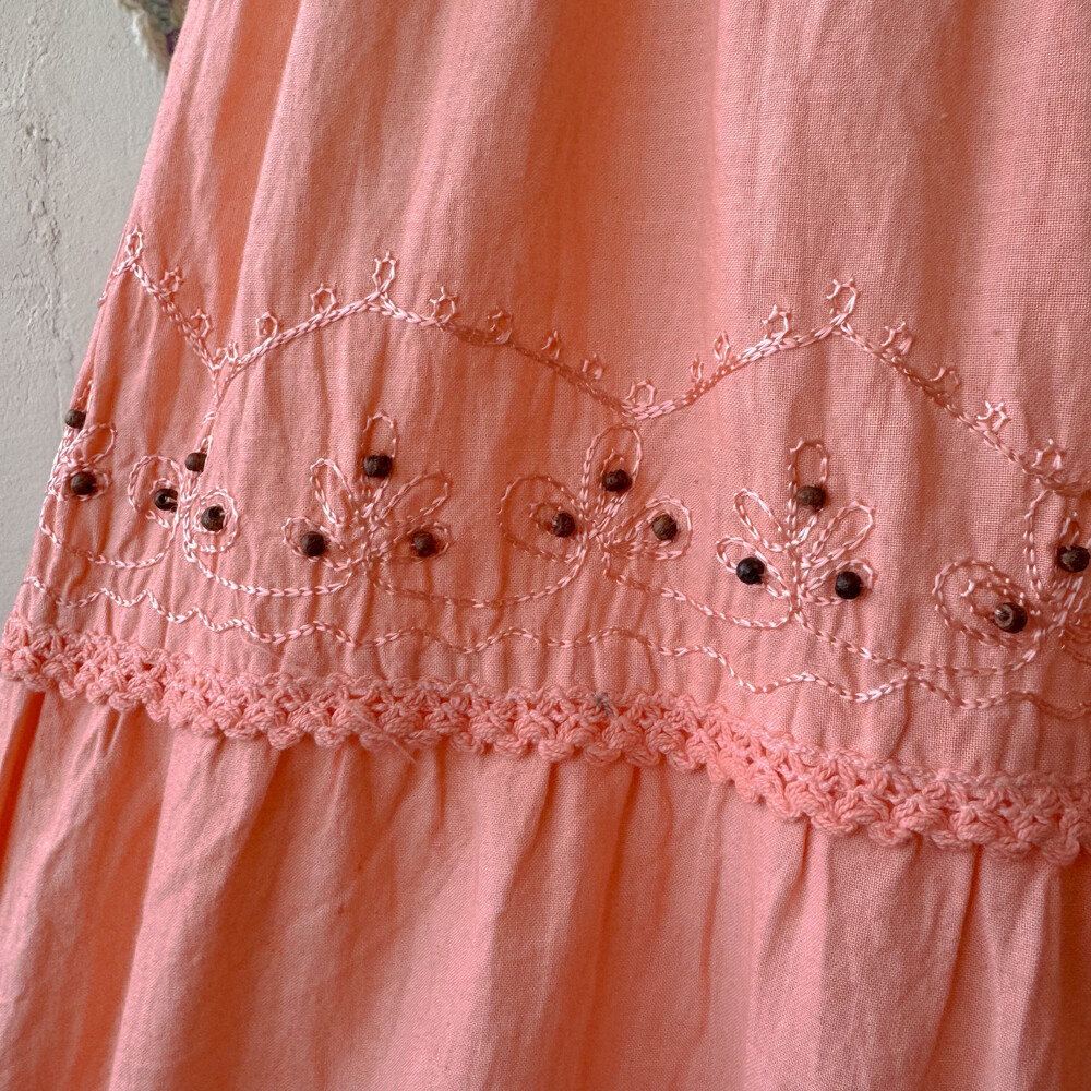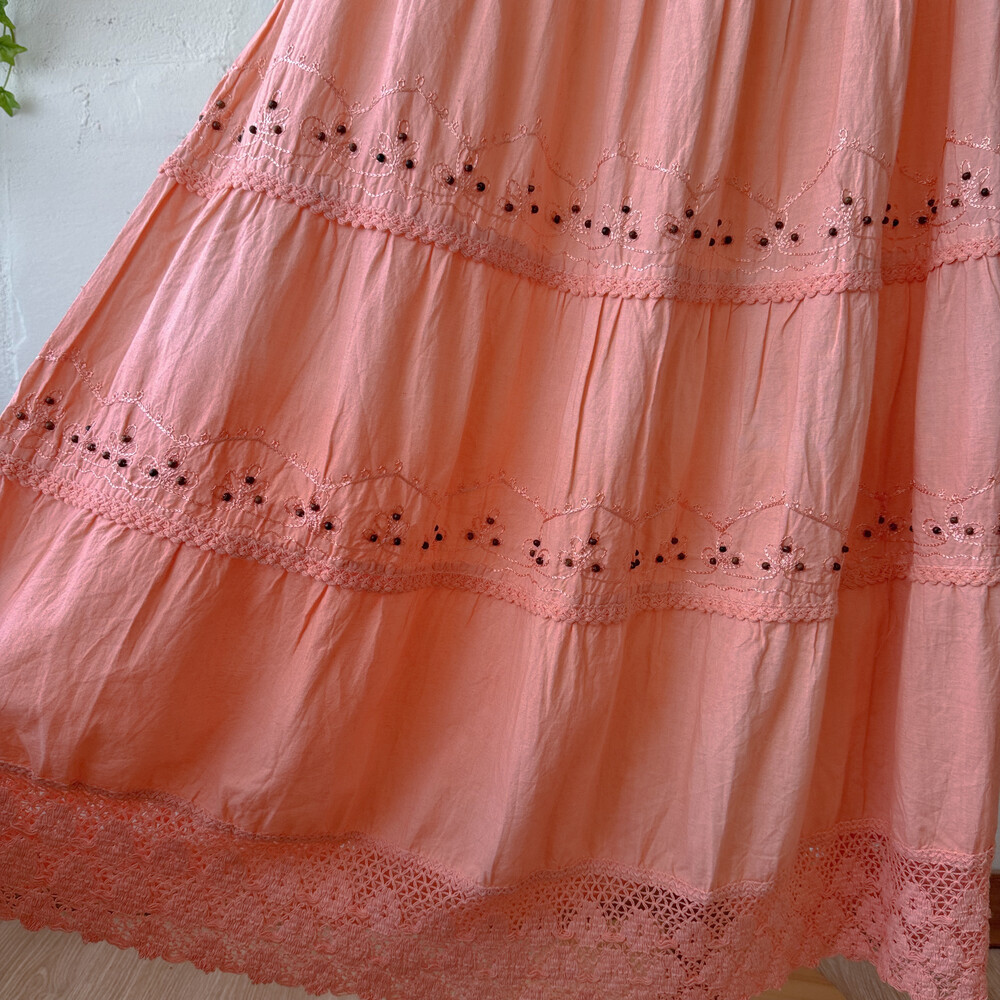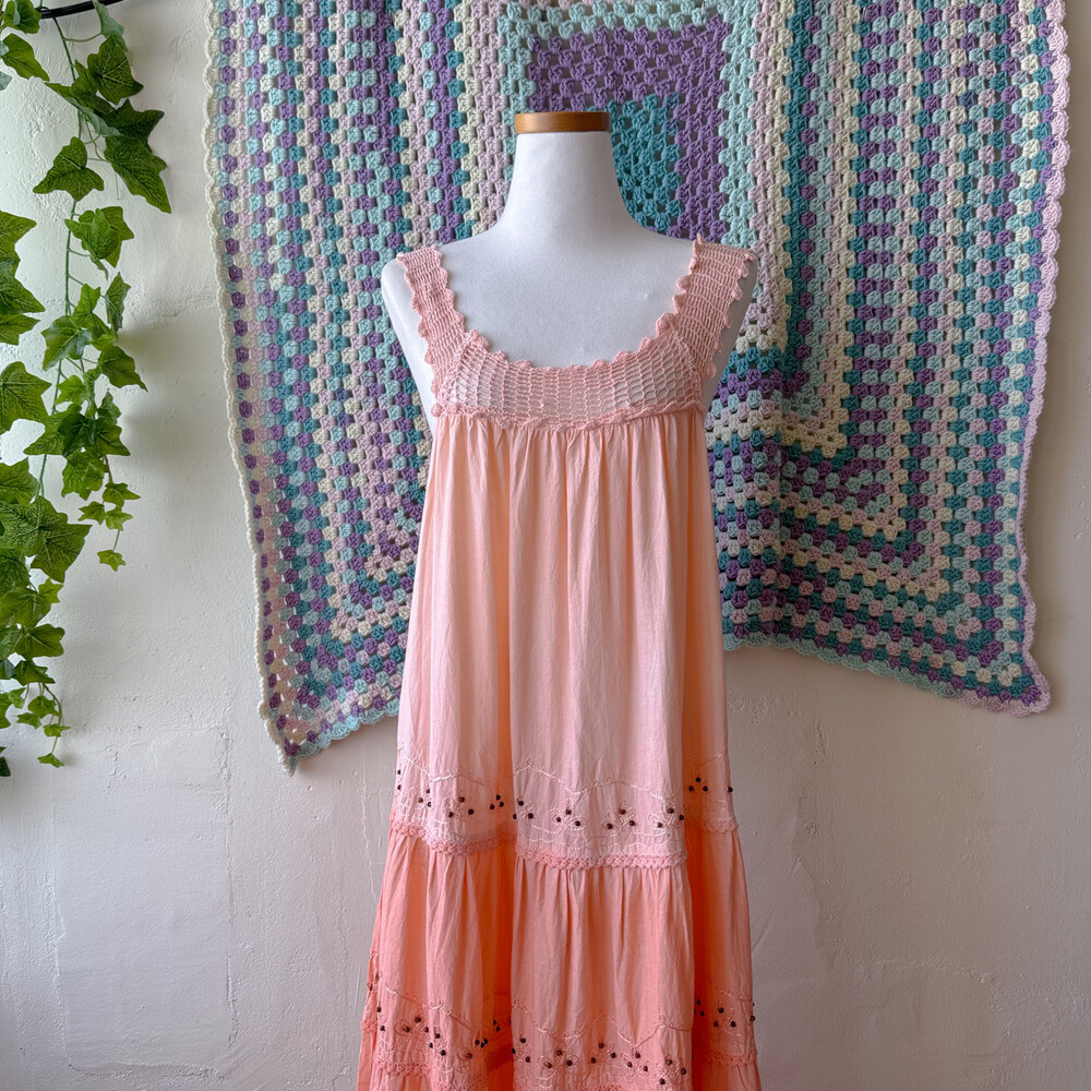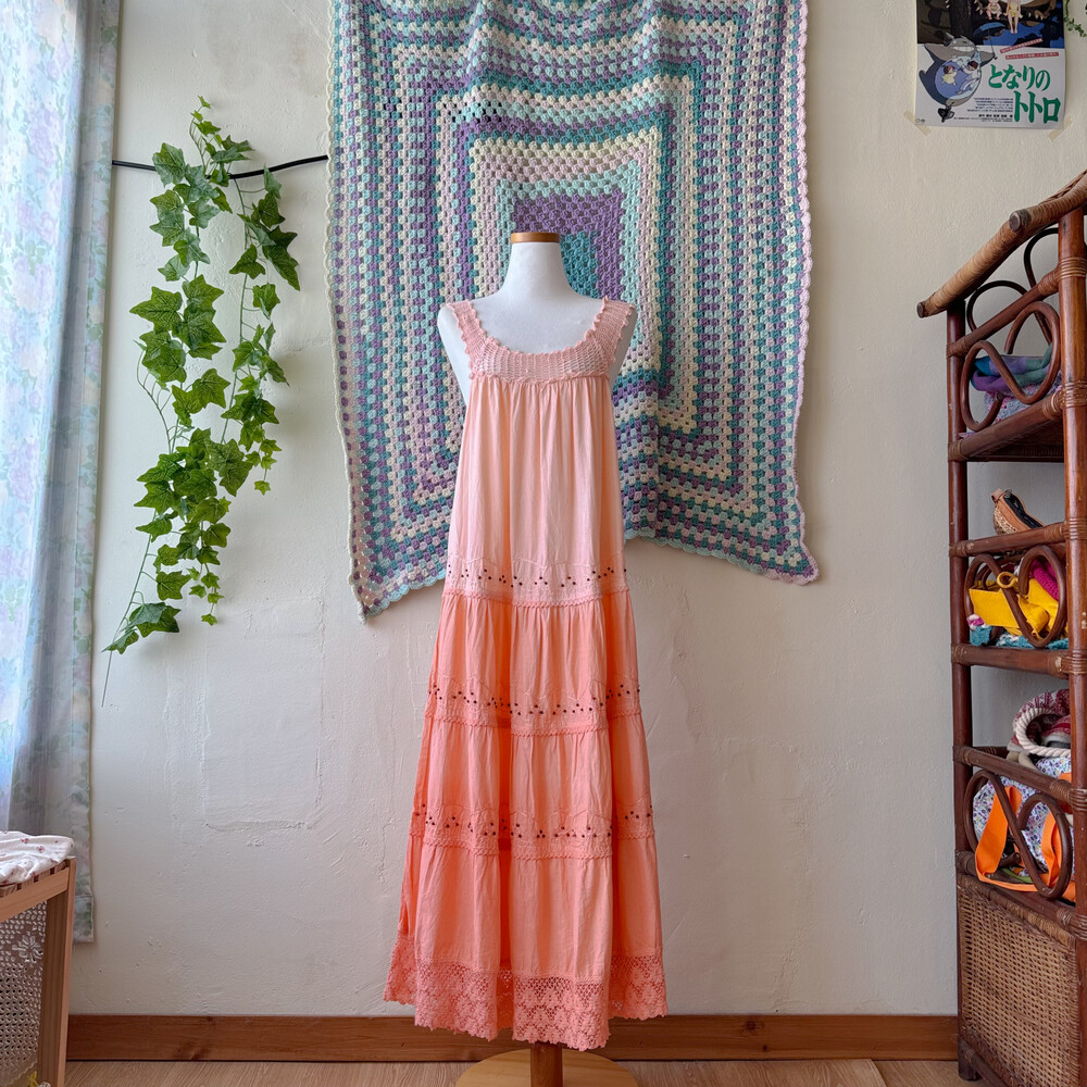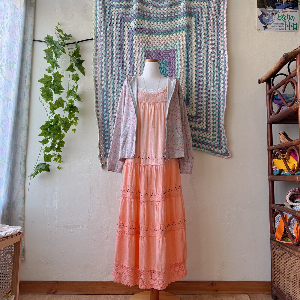 살구와 핑크가 섞인 색감의 그라데이션 원피스예요