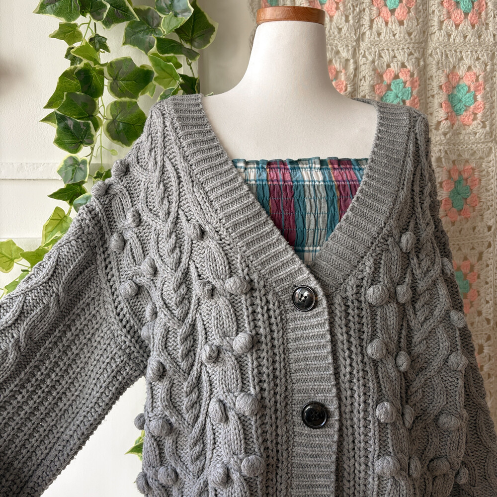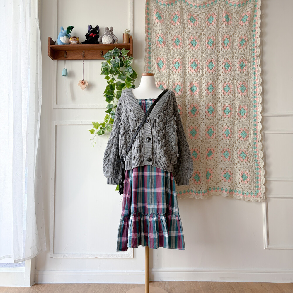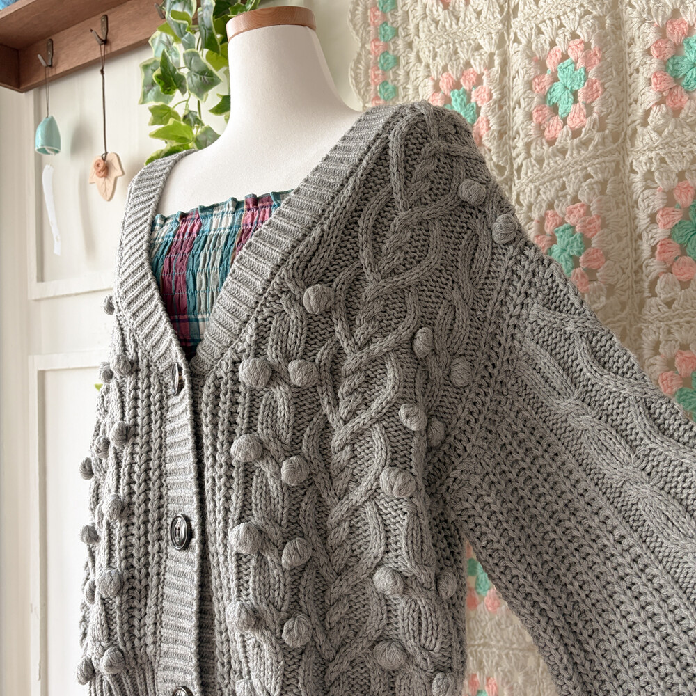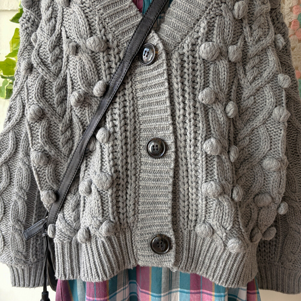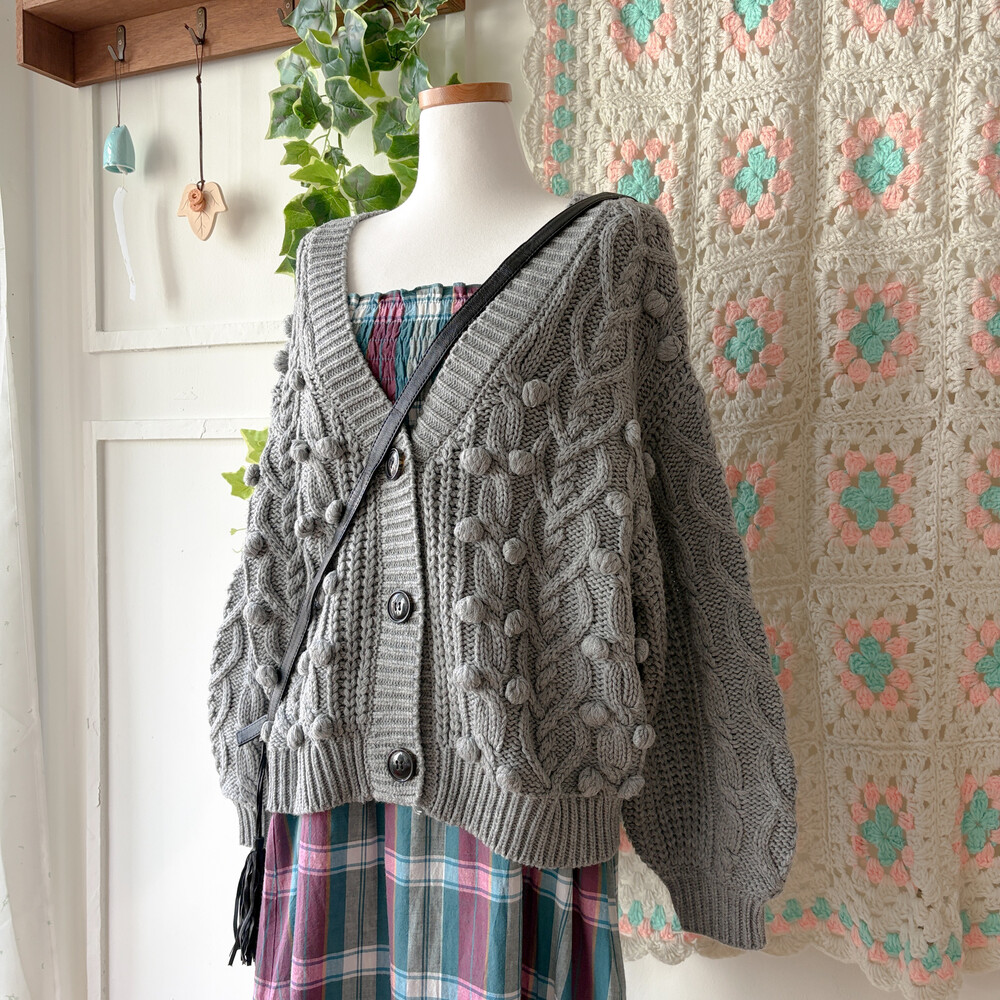 그레이 색감의 브이넥 폼폼 가디건이에요