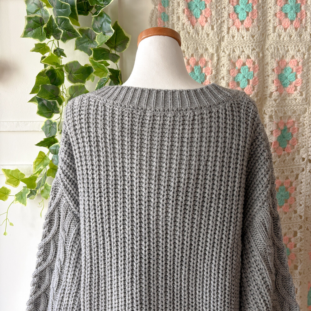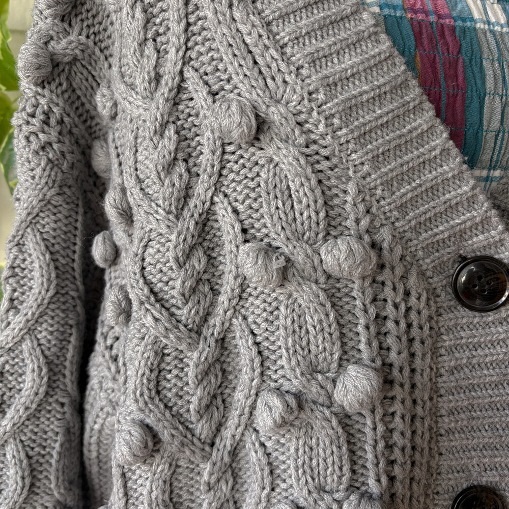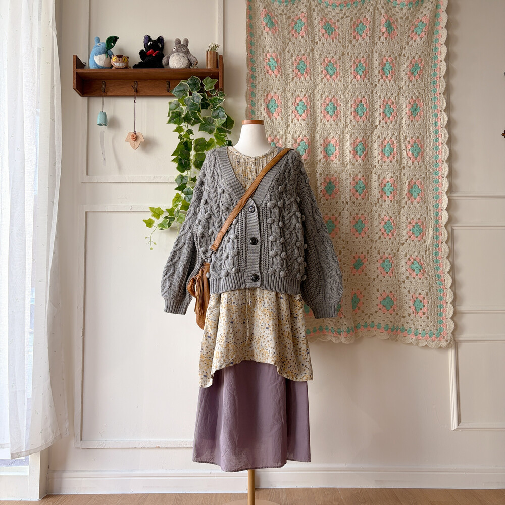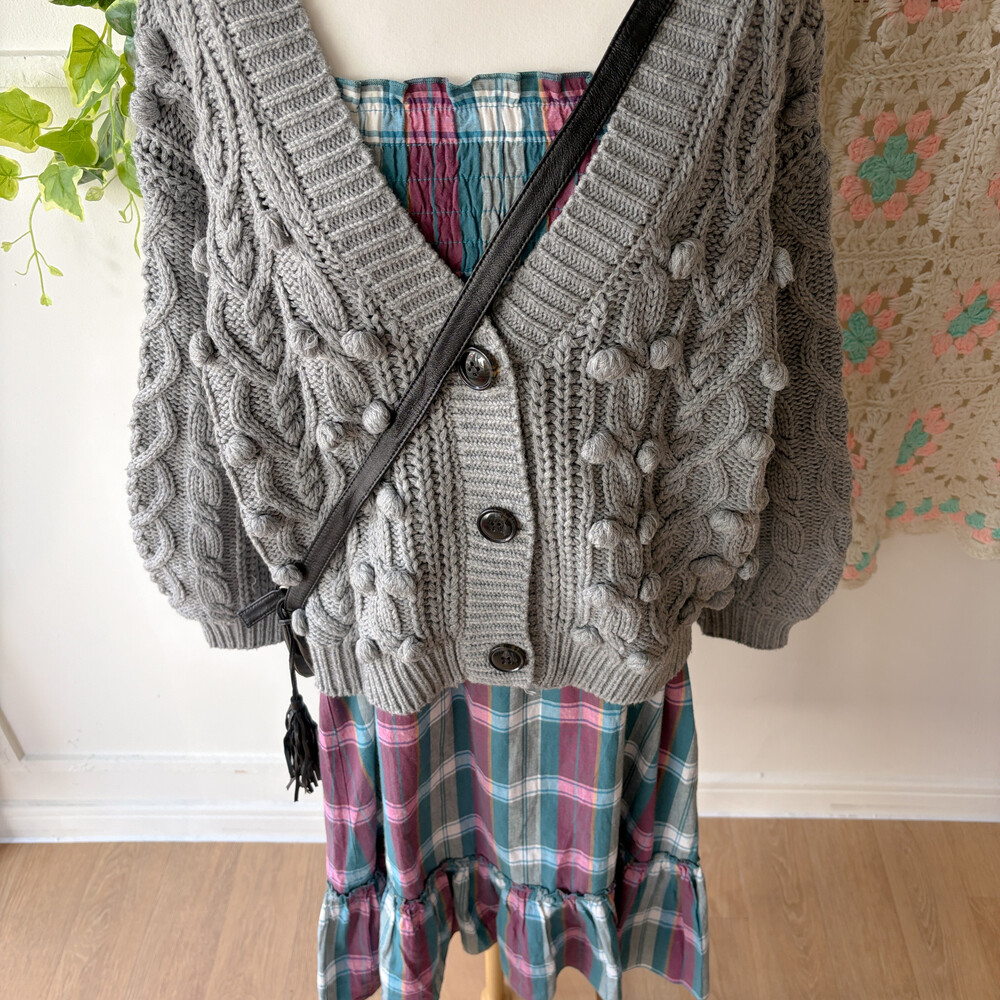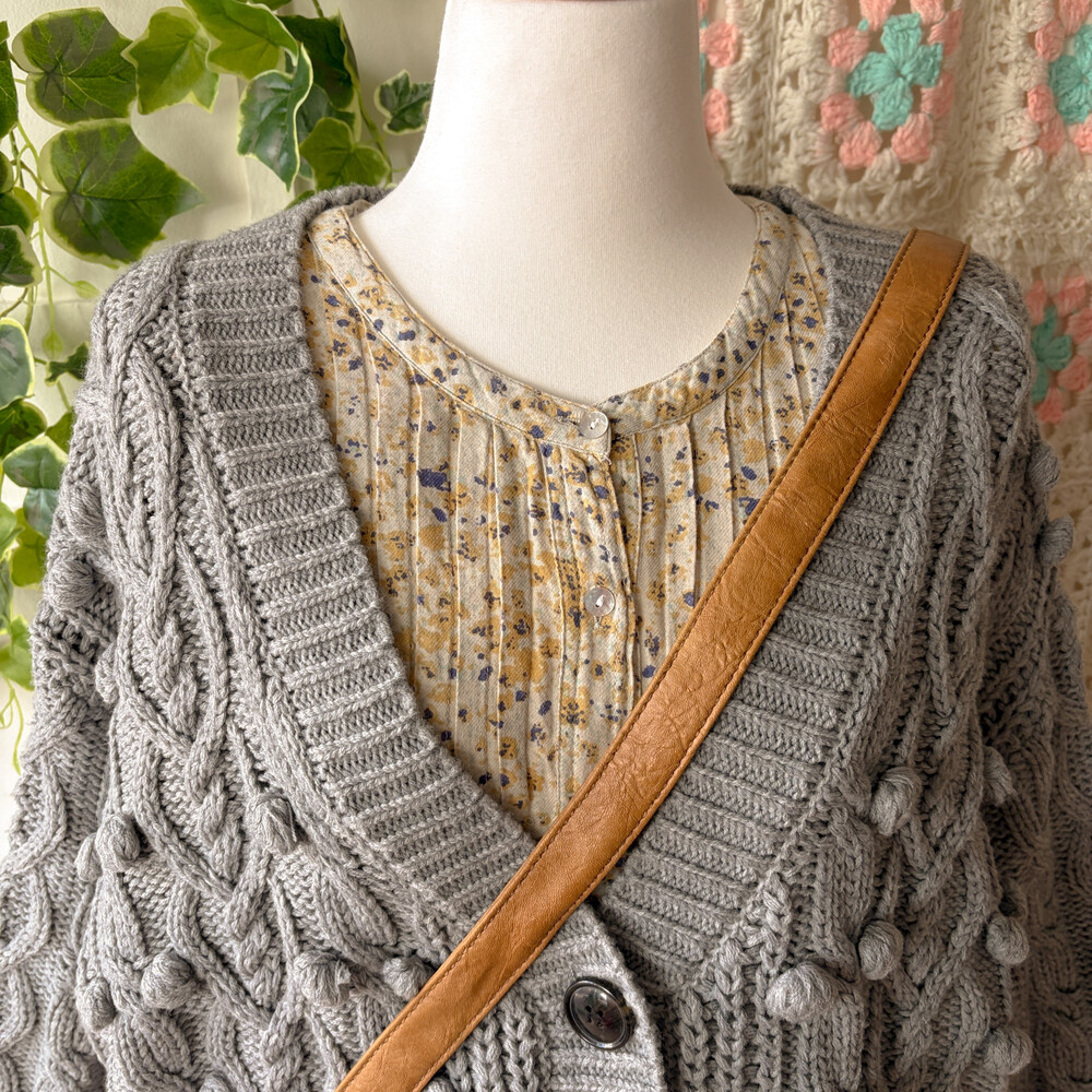 그레이 색감의 브이넥 폼폼 가디건이에요