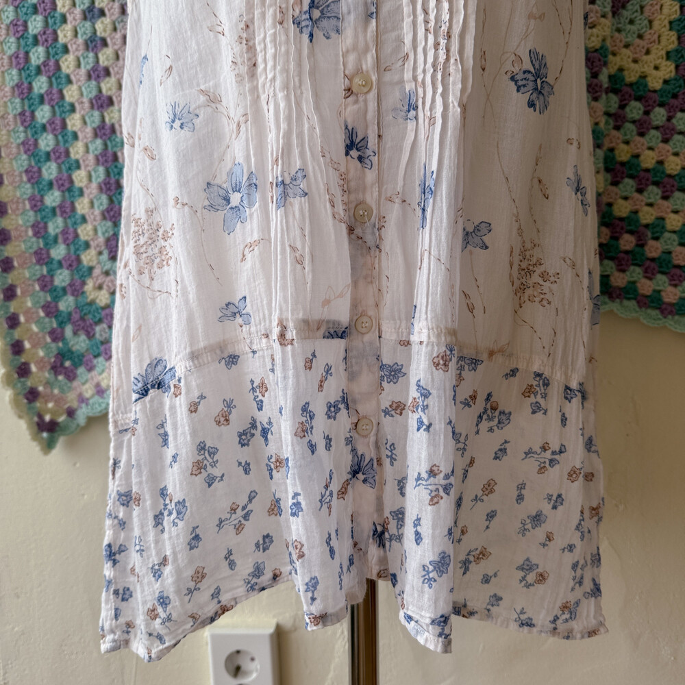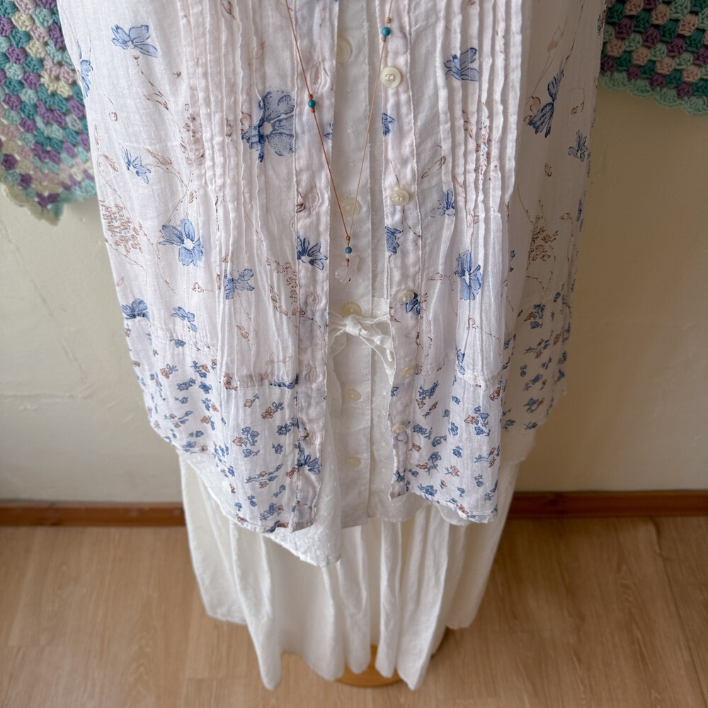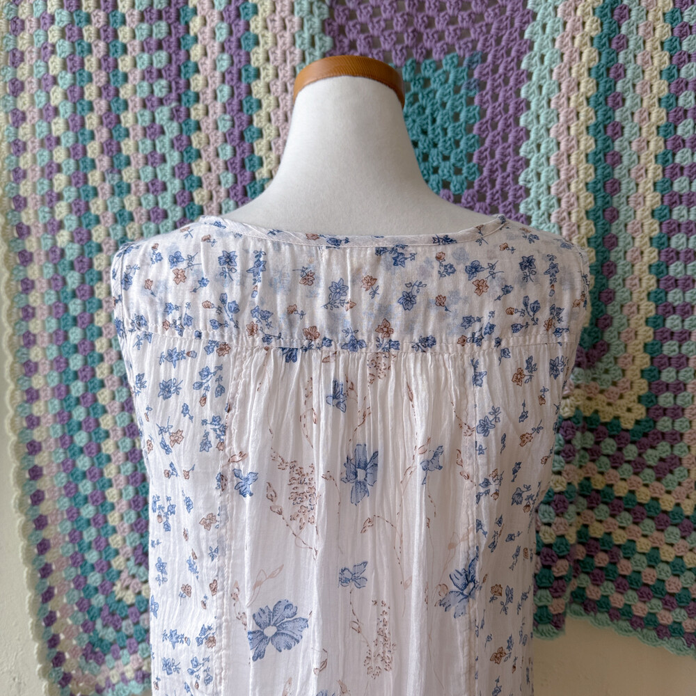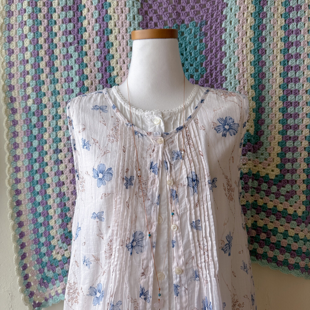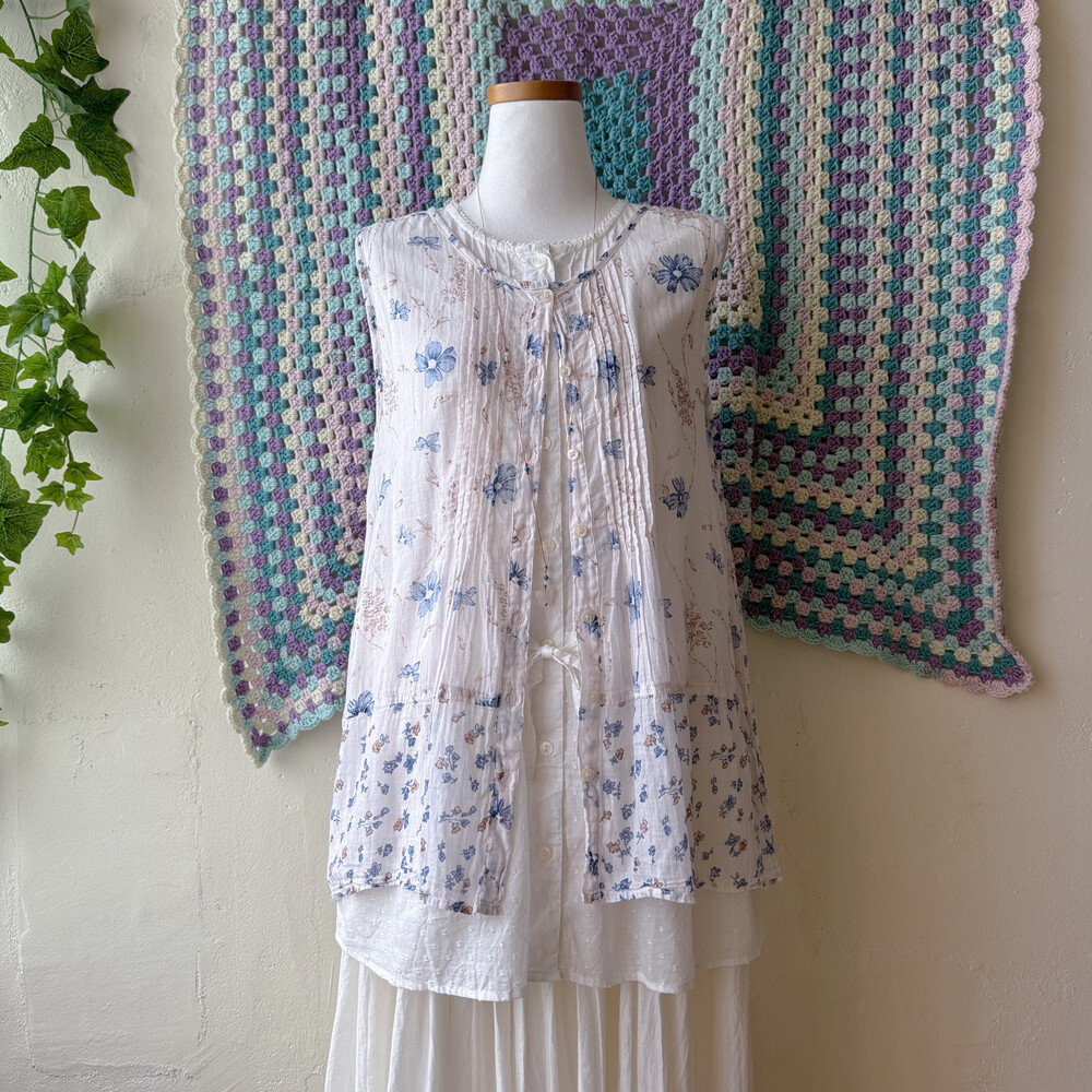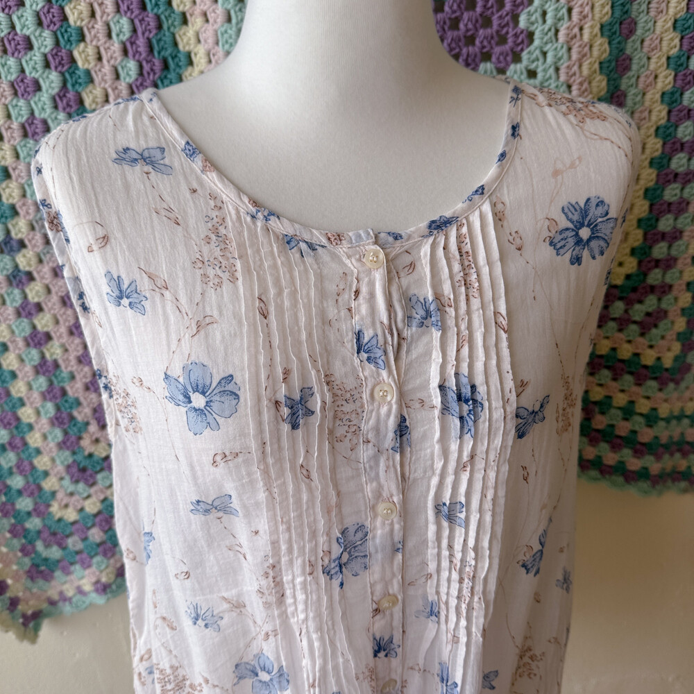 블루, 브라운 꽃무늬 패턴의 민소매 블라우스예요