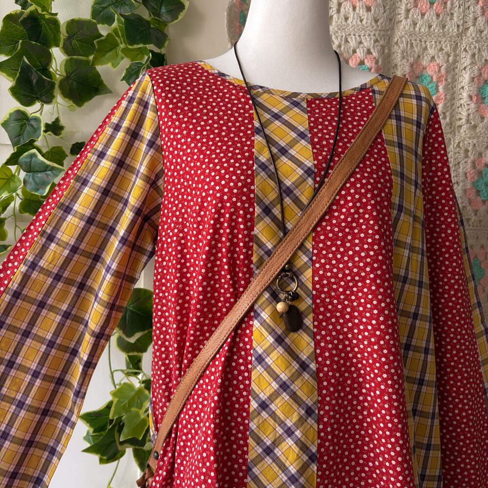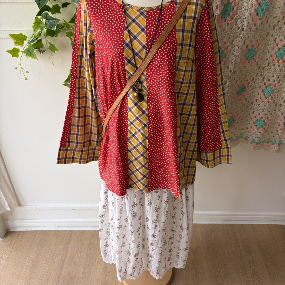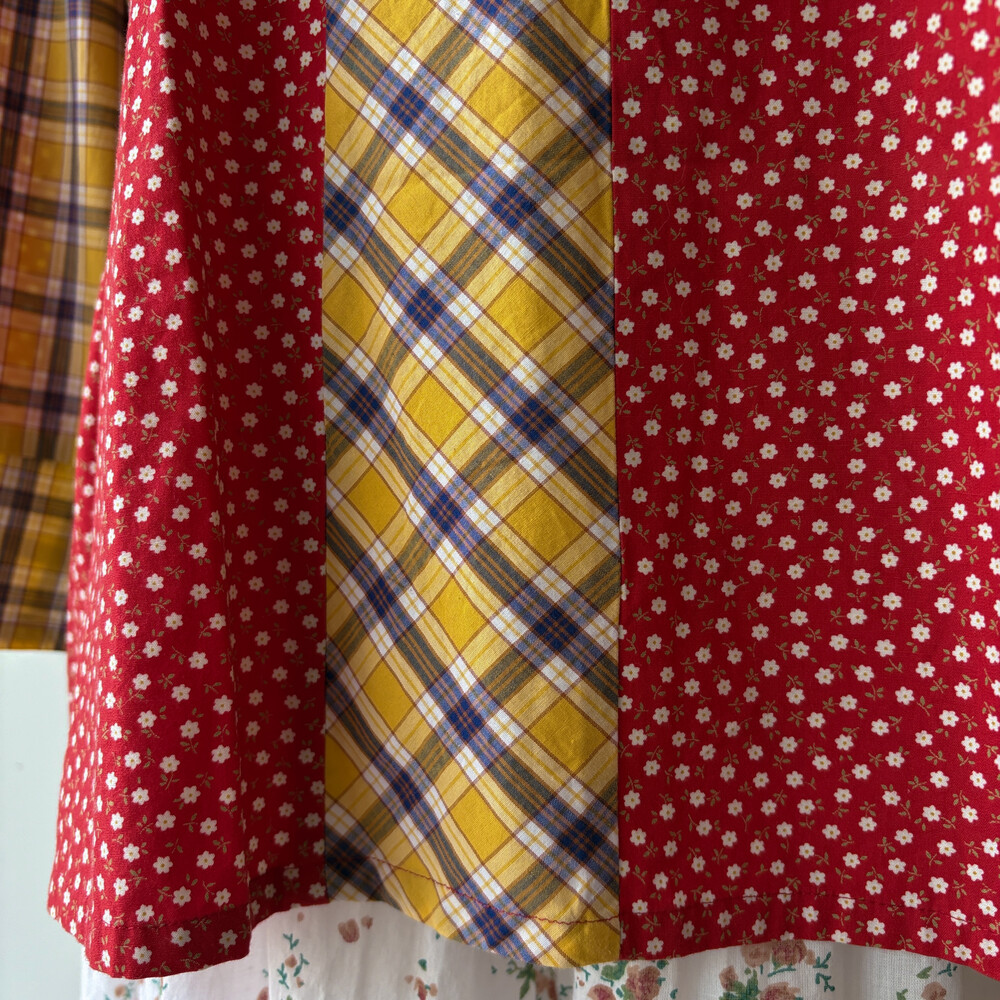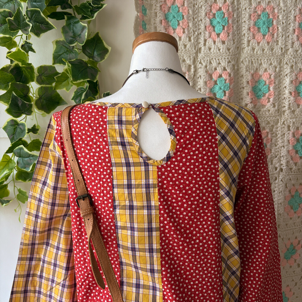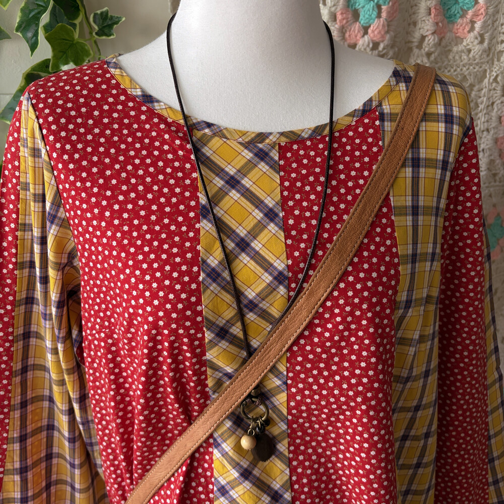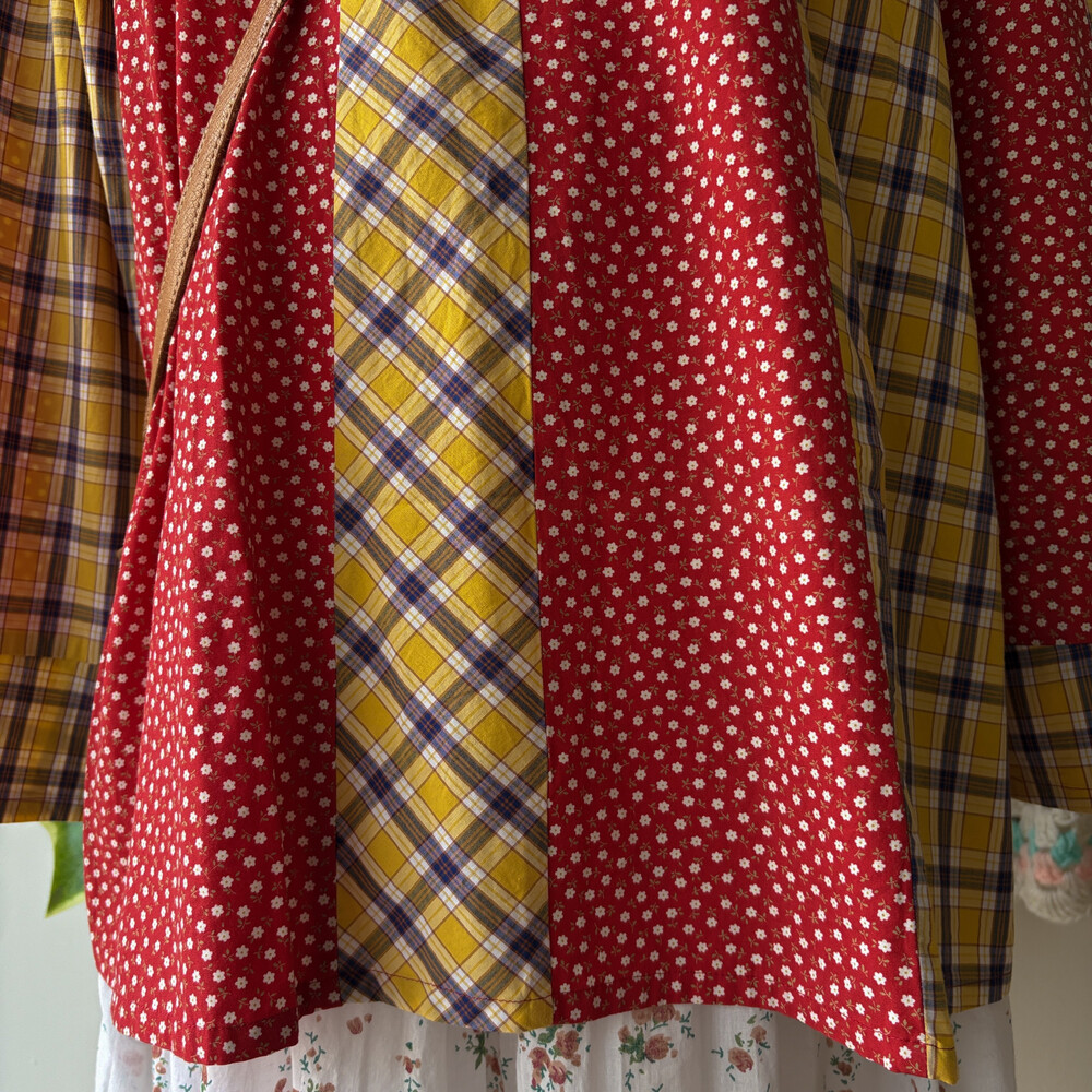 레드 바탕에 꽃무늬 패치, 노랑 바탕에 체크 패치가 조합되어 있어요