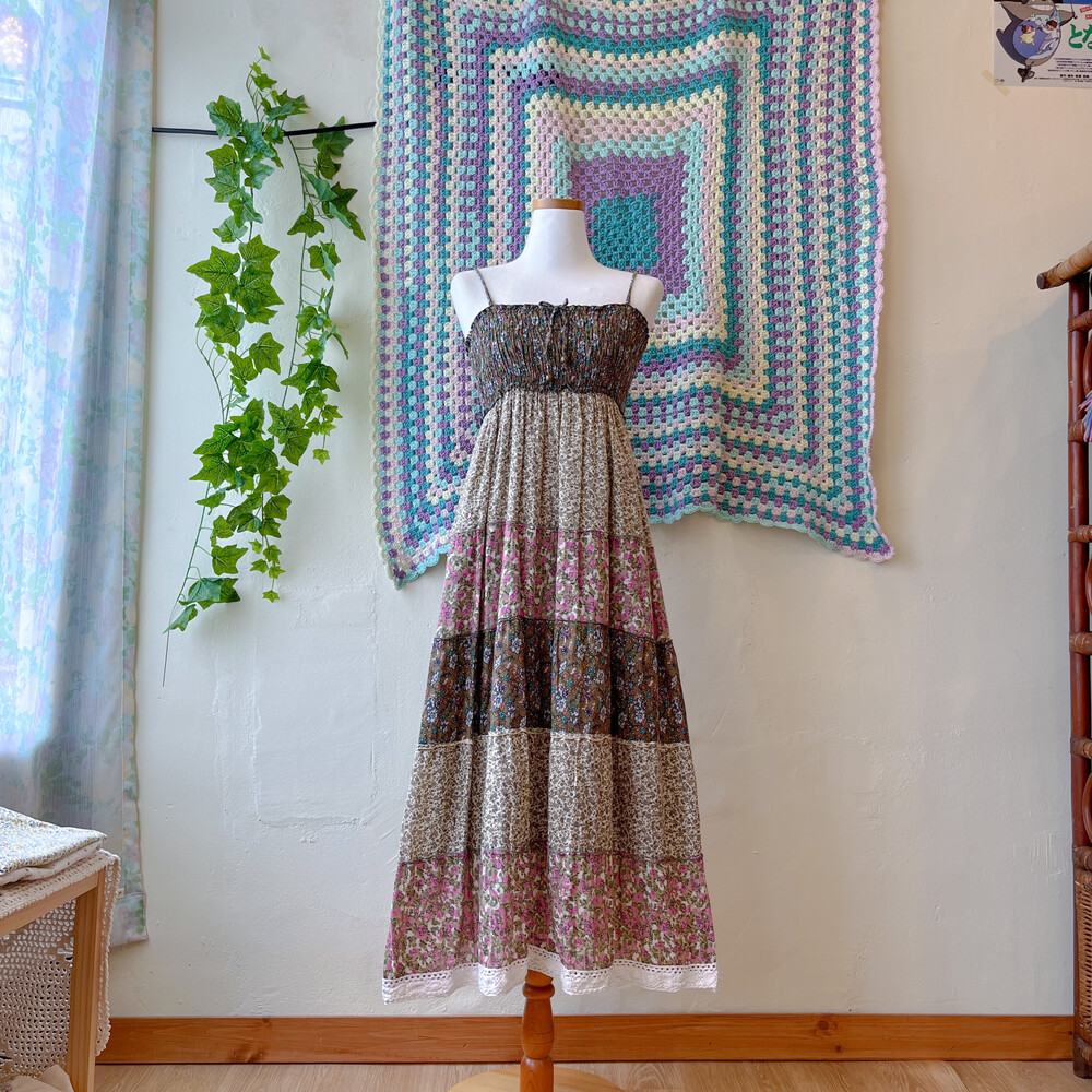 카키 브라운 색감 베이스의 패치 끈원피스예요