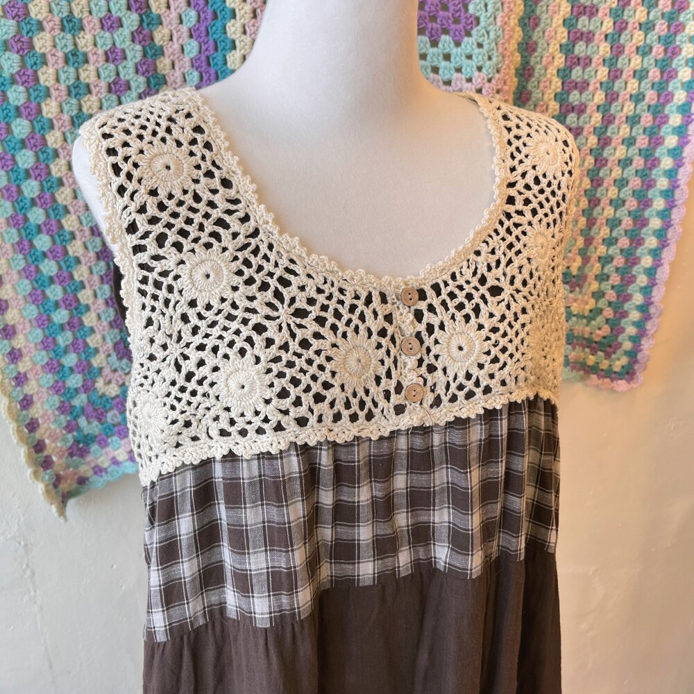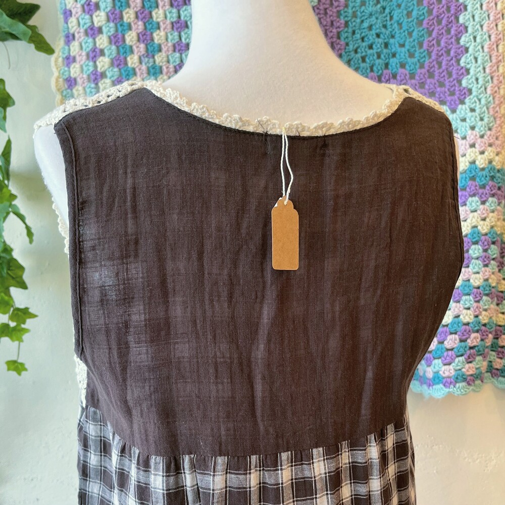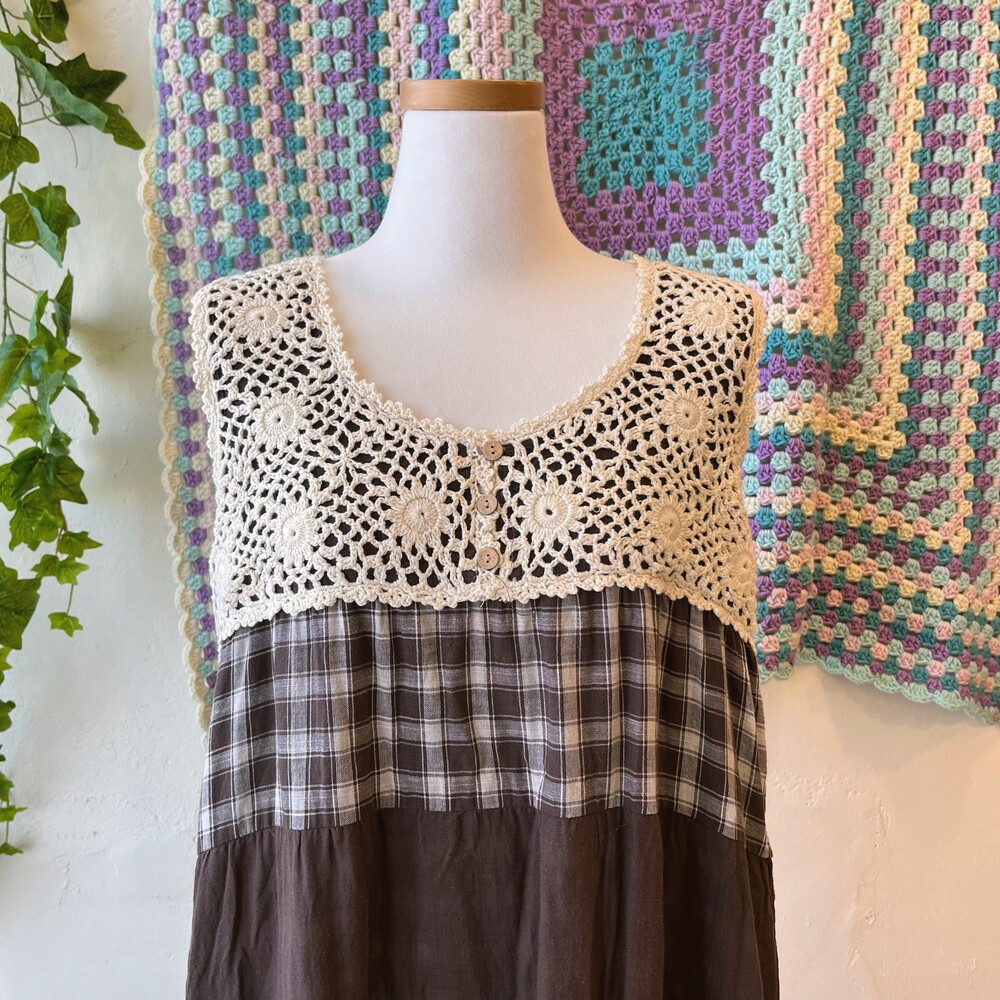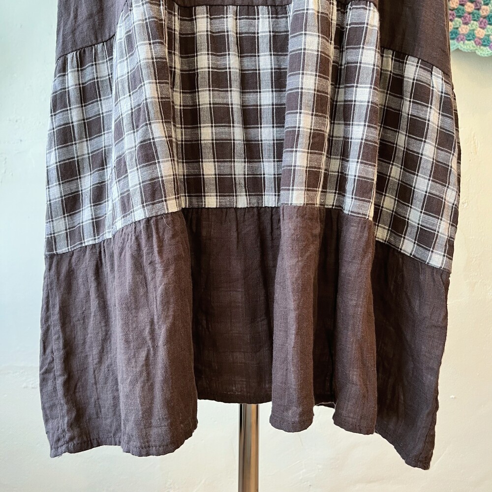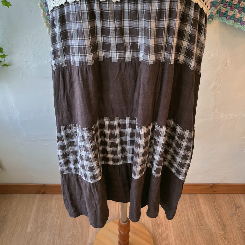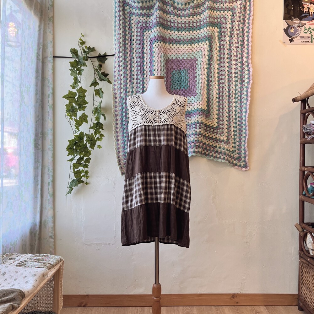 코지한 분위기의 고동색 체크 민소매 원피스예요