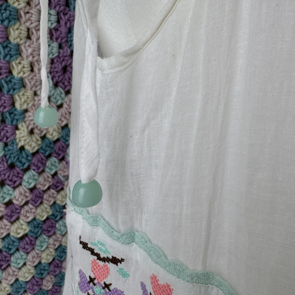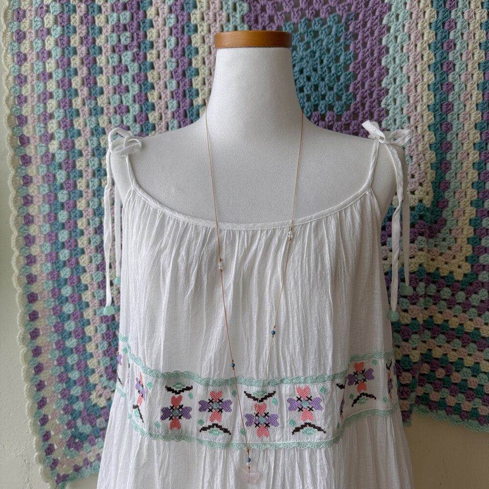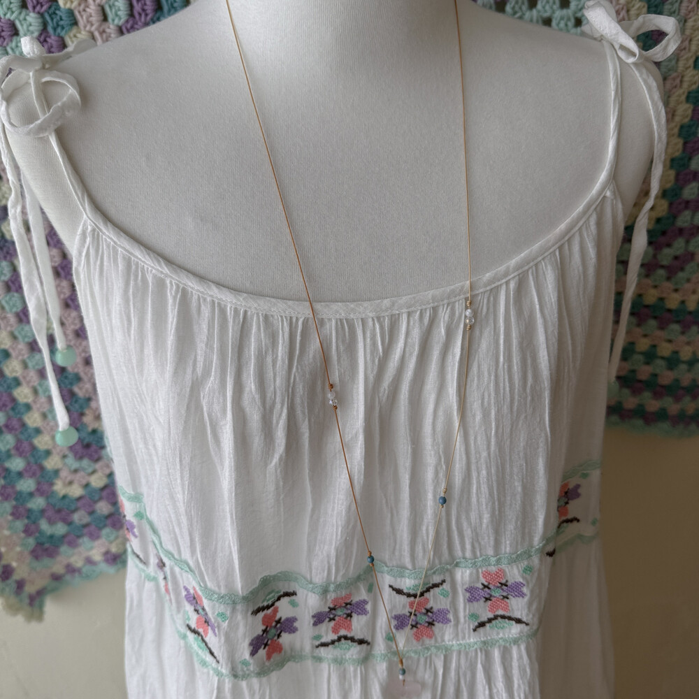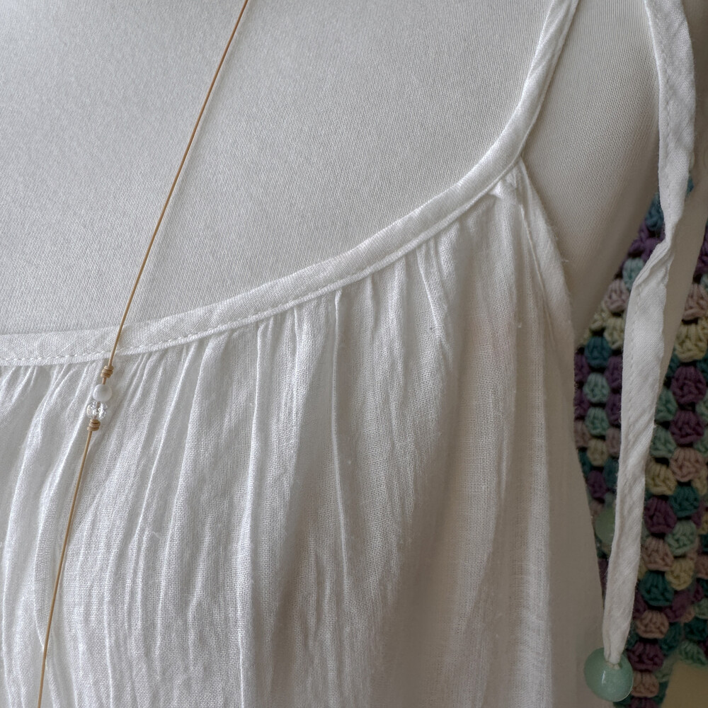 민트 색감의 레이스 포인트 자수 끈블라우스예요