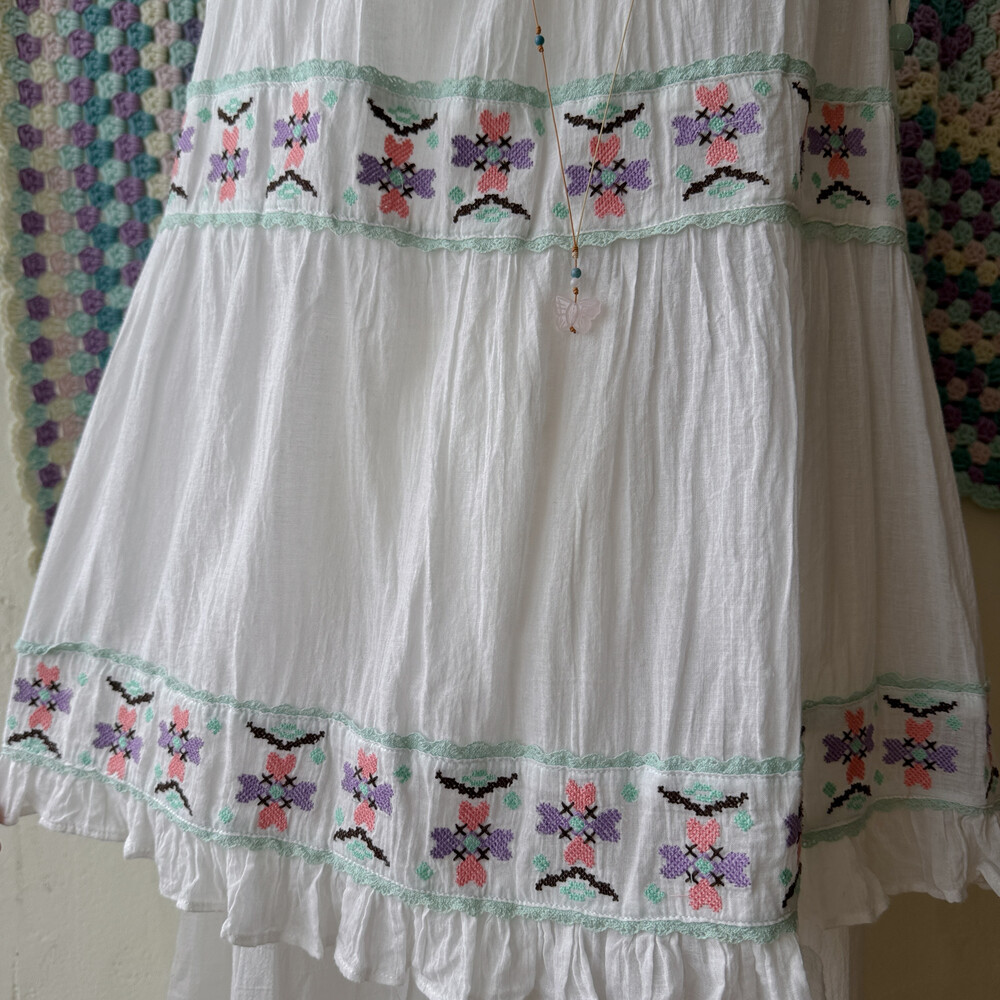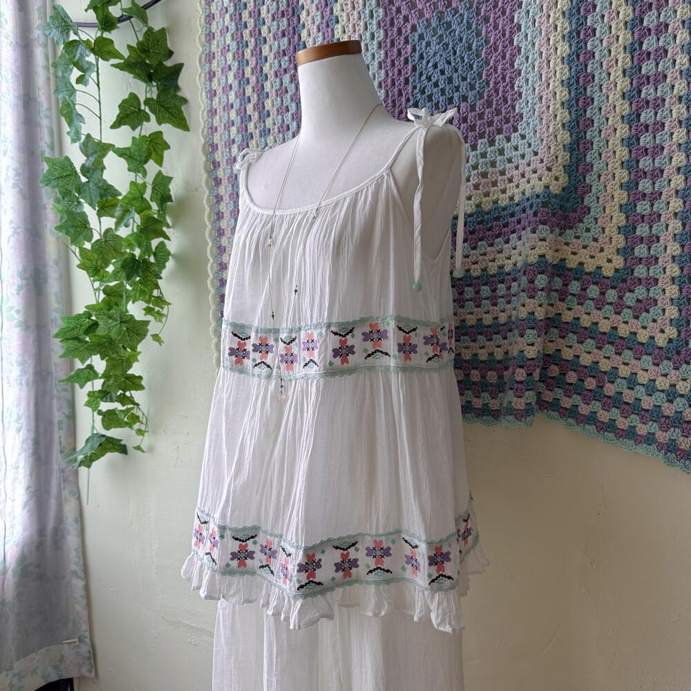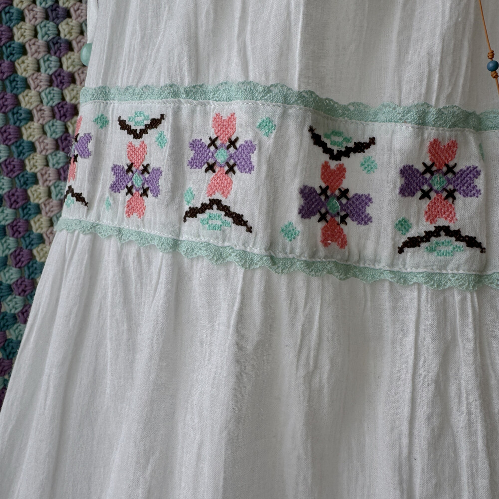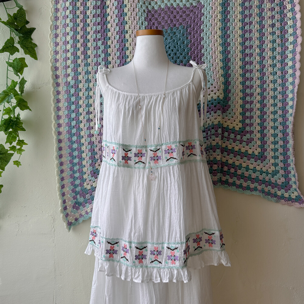 민트 색감의 레이스 포인트 자수 끈블라우스예요