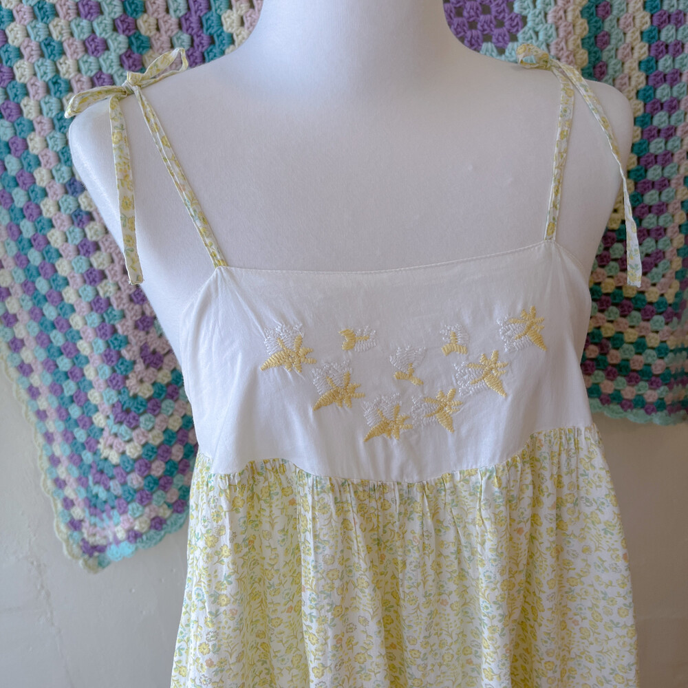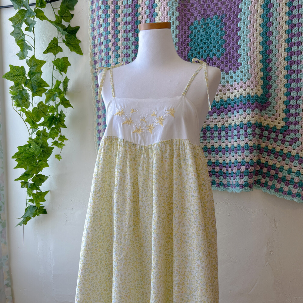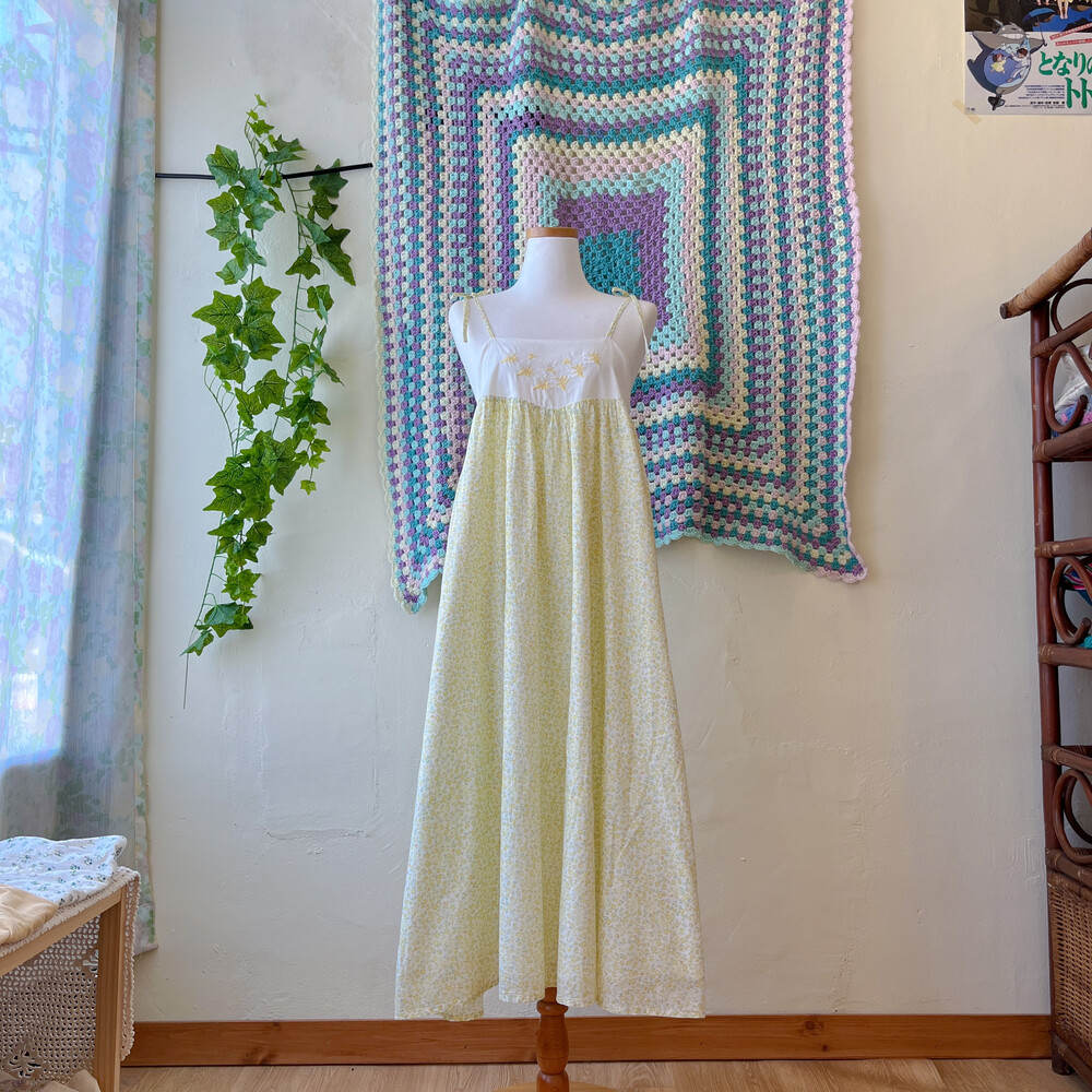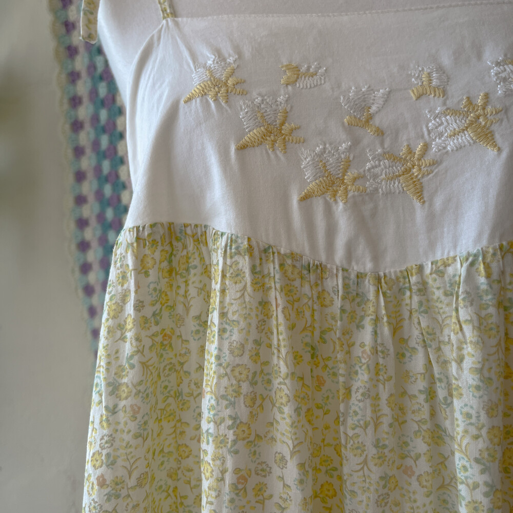 노랑-연두 색감의 잔꽃 자수 끈원피스예요