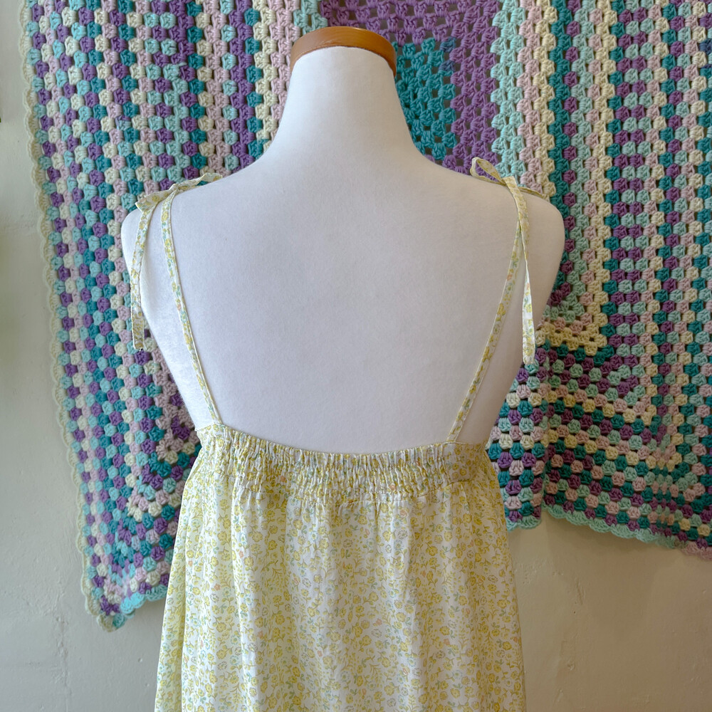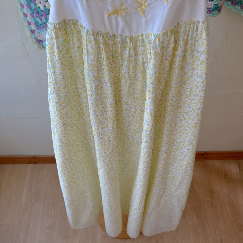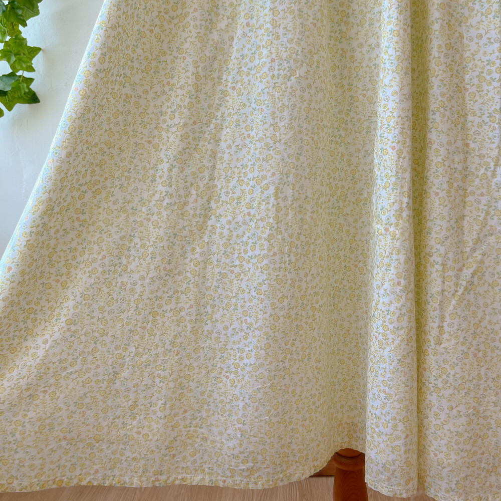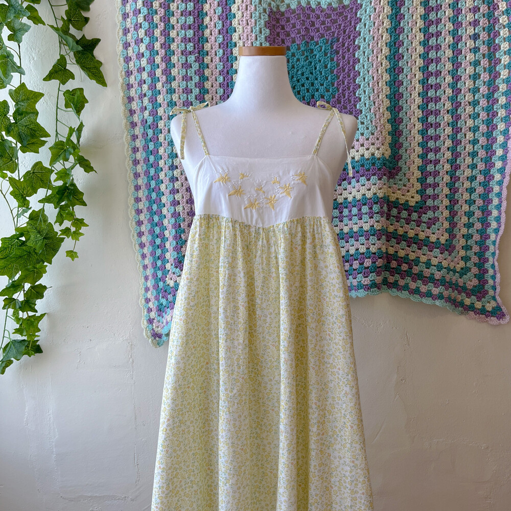 노랑-연두 색감의 잔꽃 자수 끈원피스예요