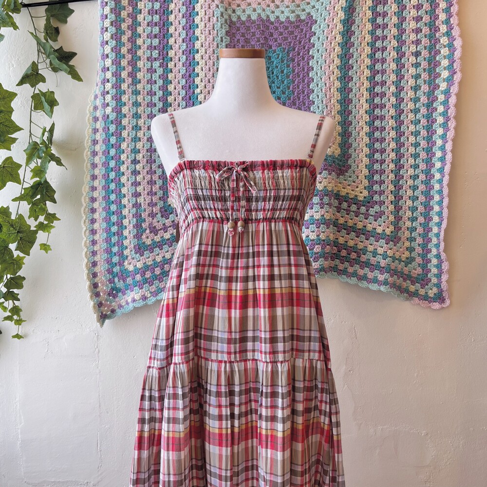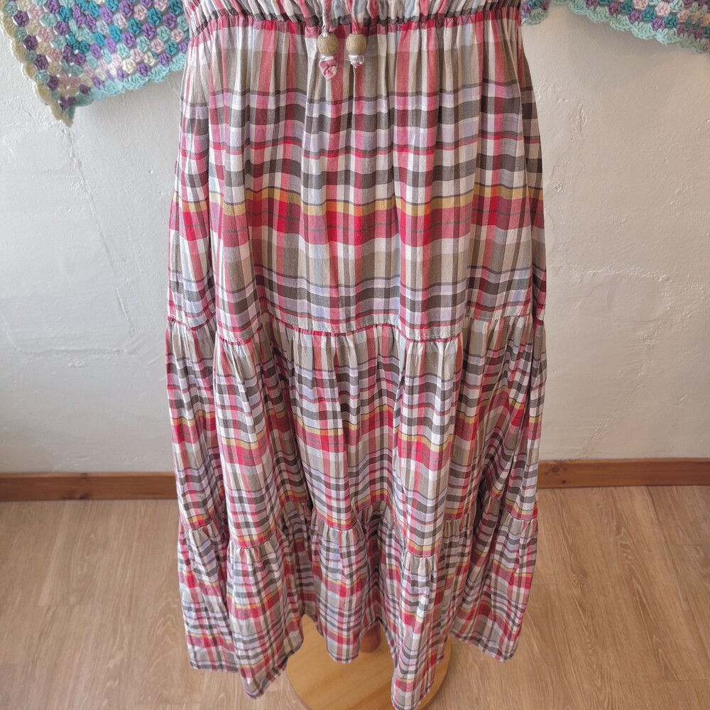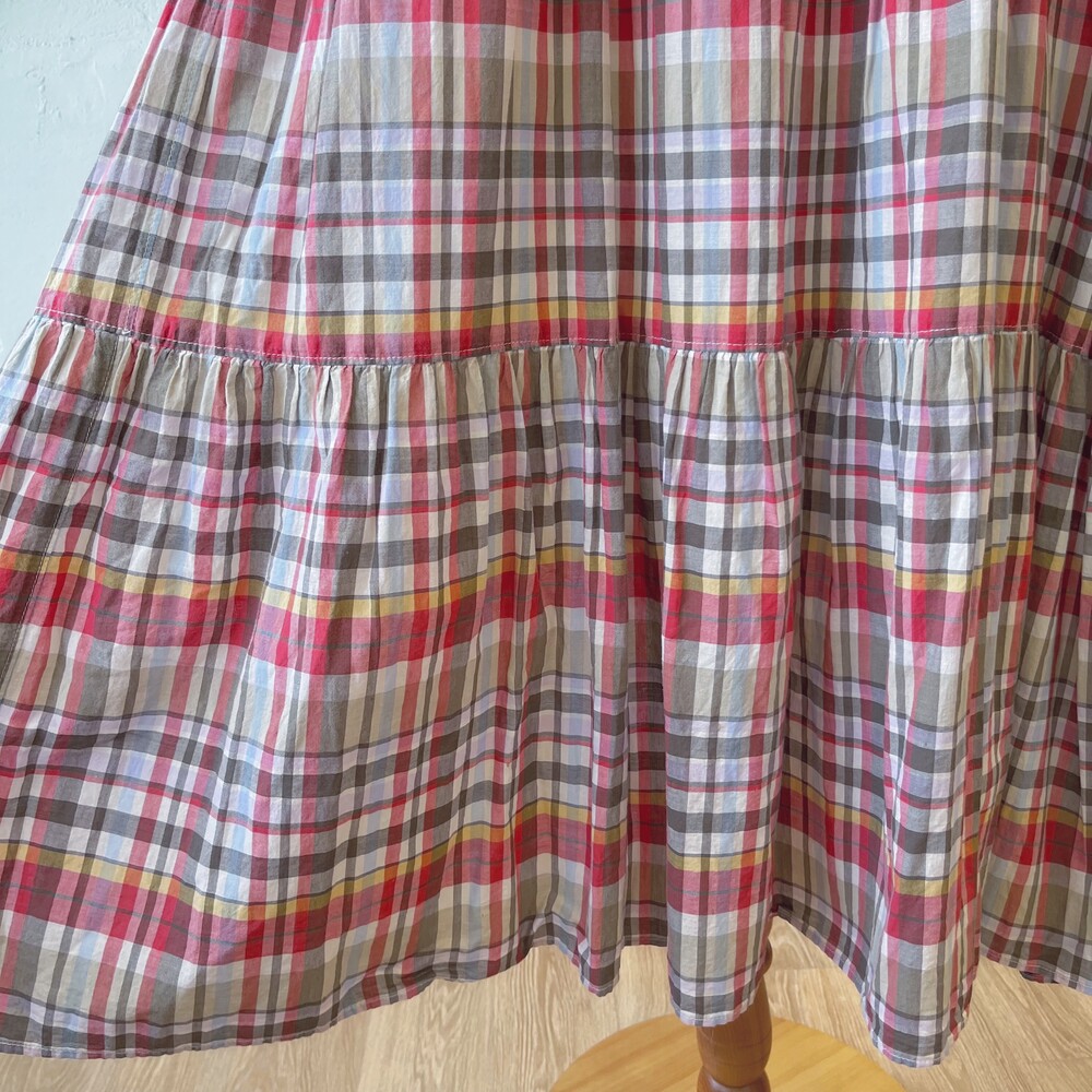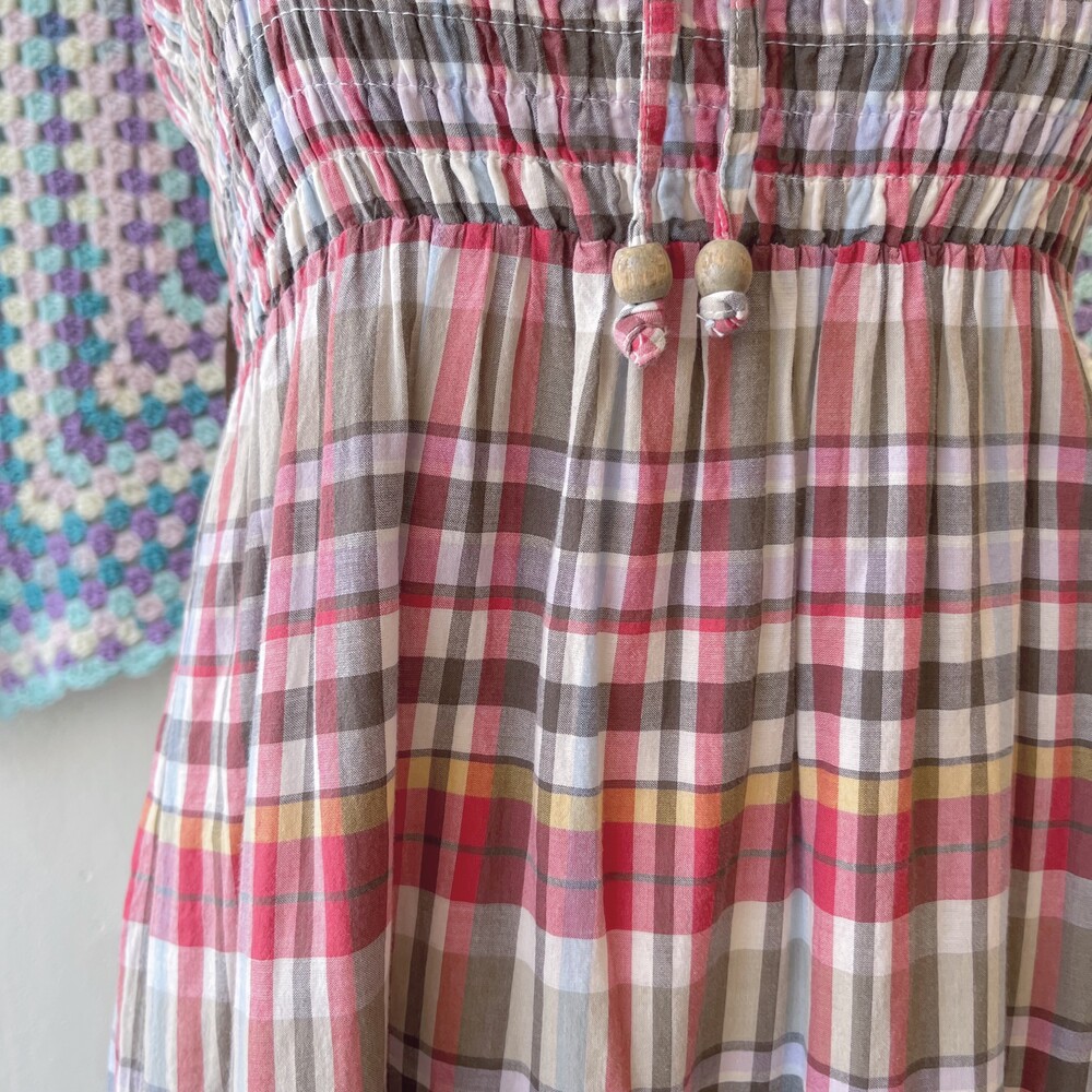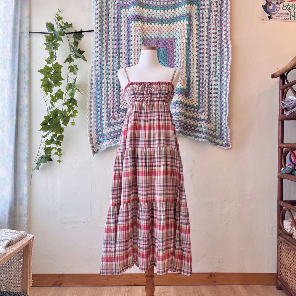 다홍, 카키, 보라 색감 조합의 체크 끈원피스예요