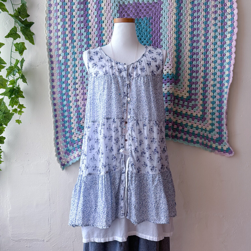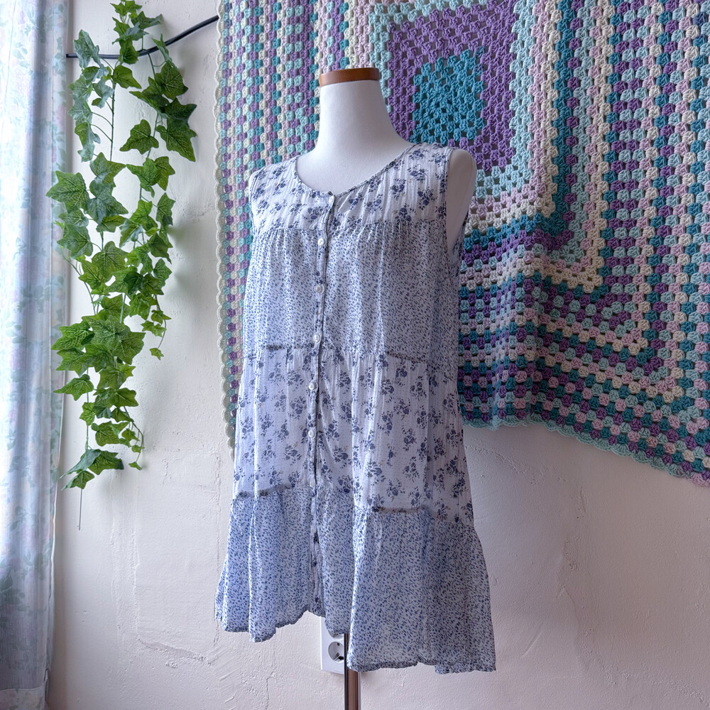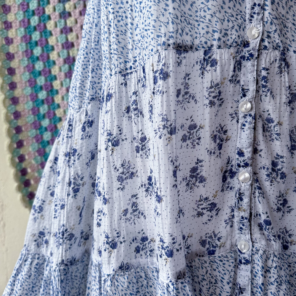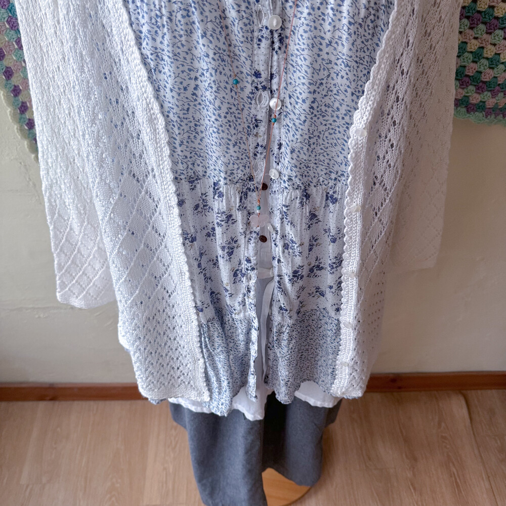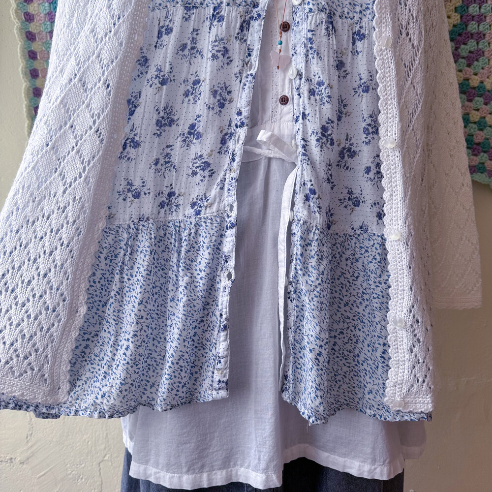 블루, 퍼플 잔꽃 패턴의 패치워크 블라우스예요
