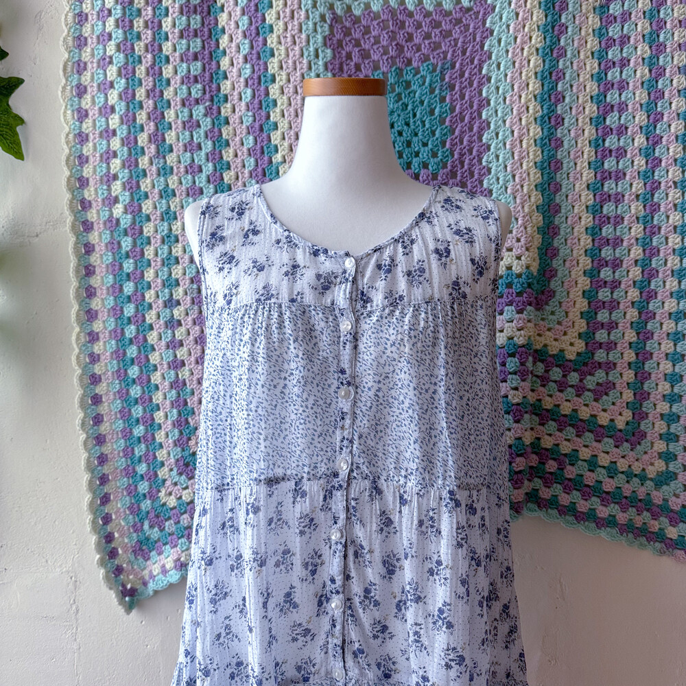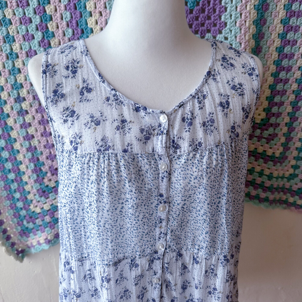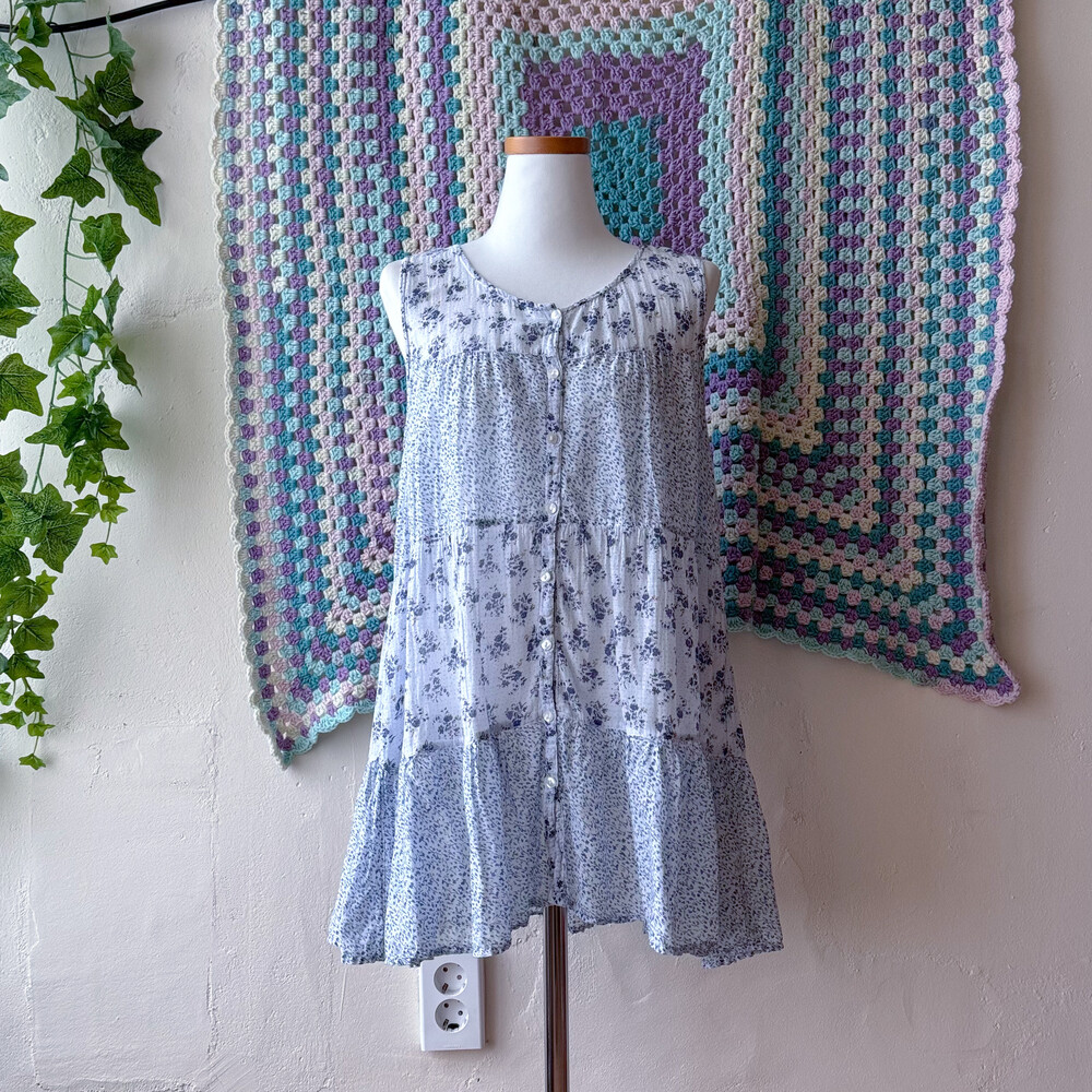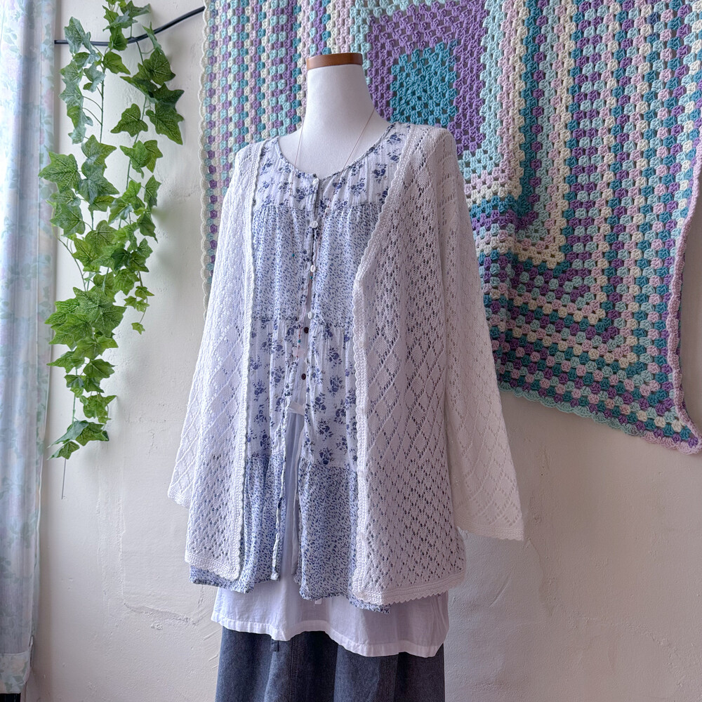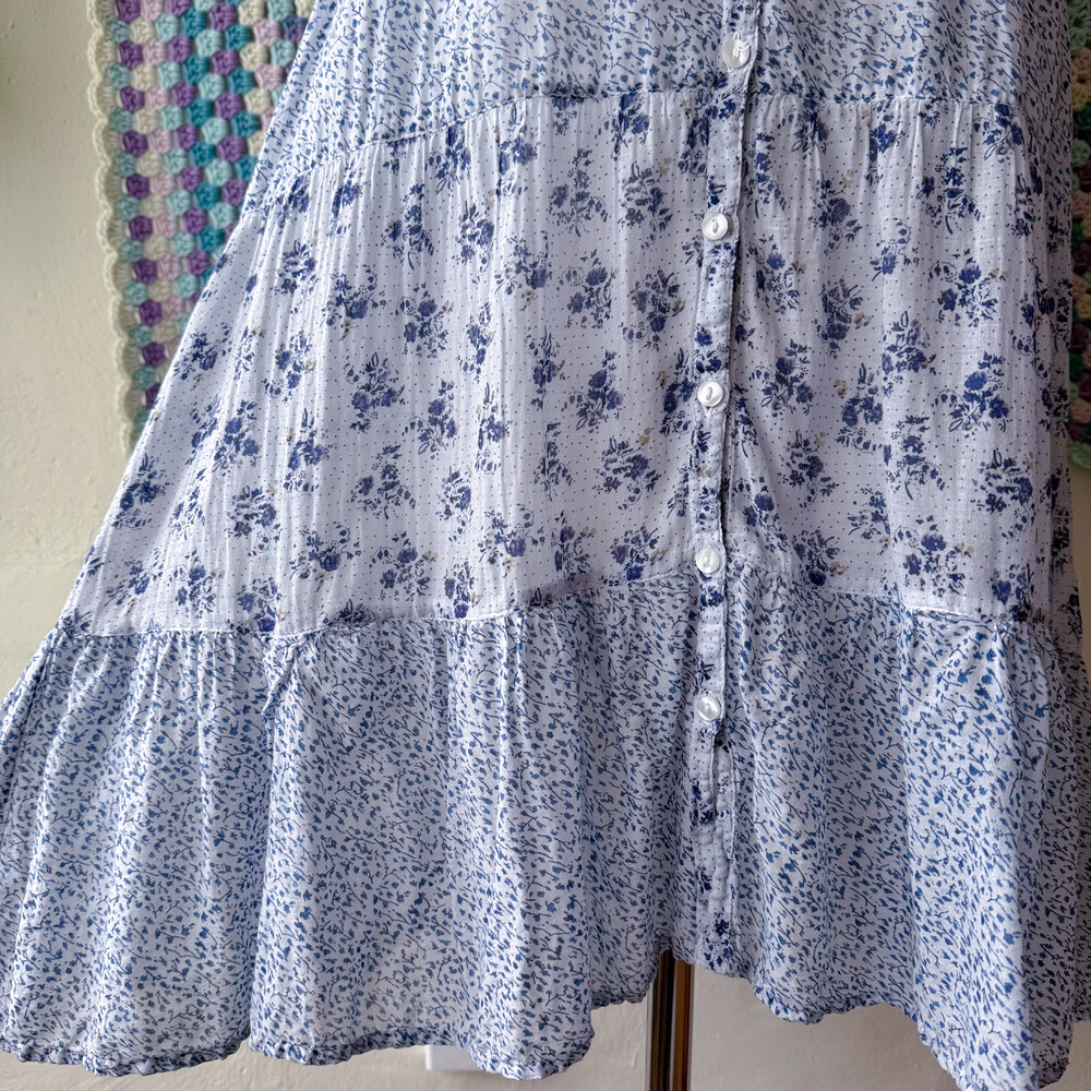 블루, 퍼플 잔꽃 패턴의 패치워크 블라우스예요