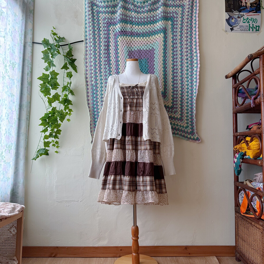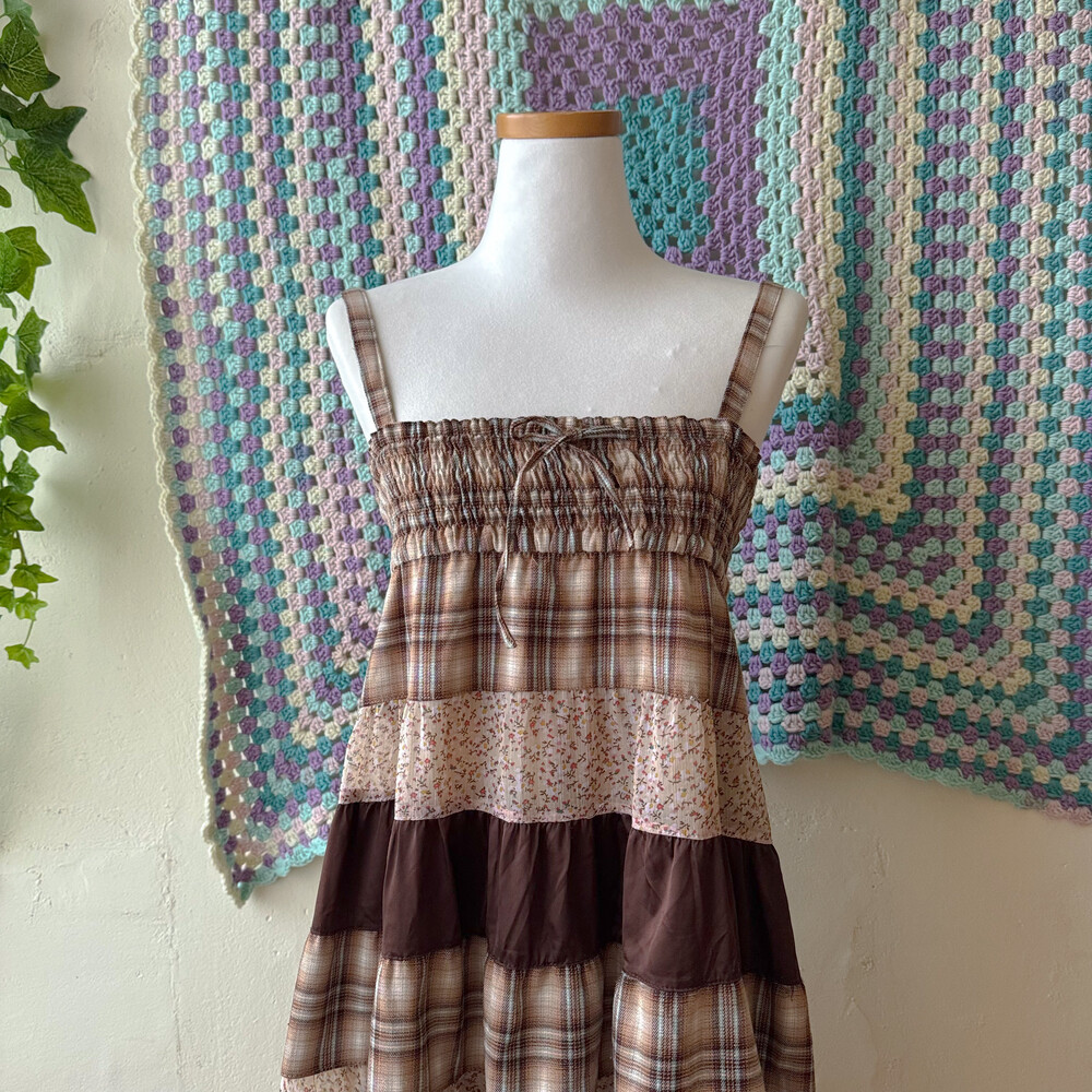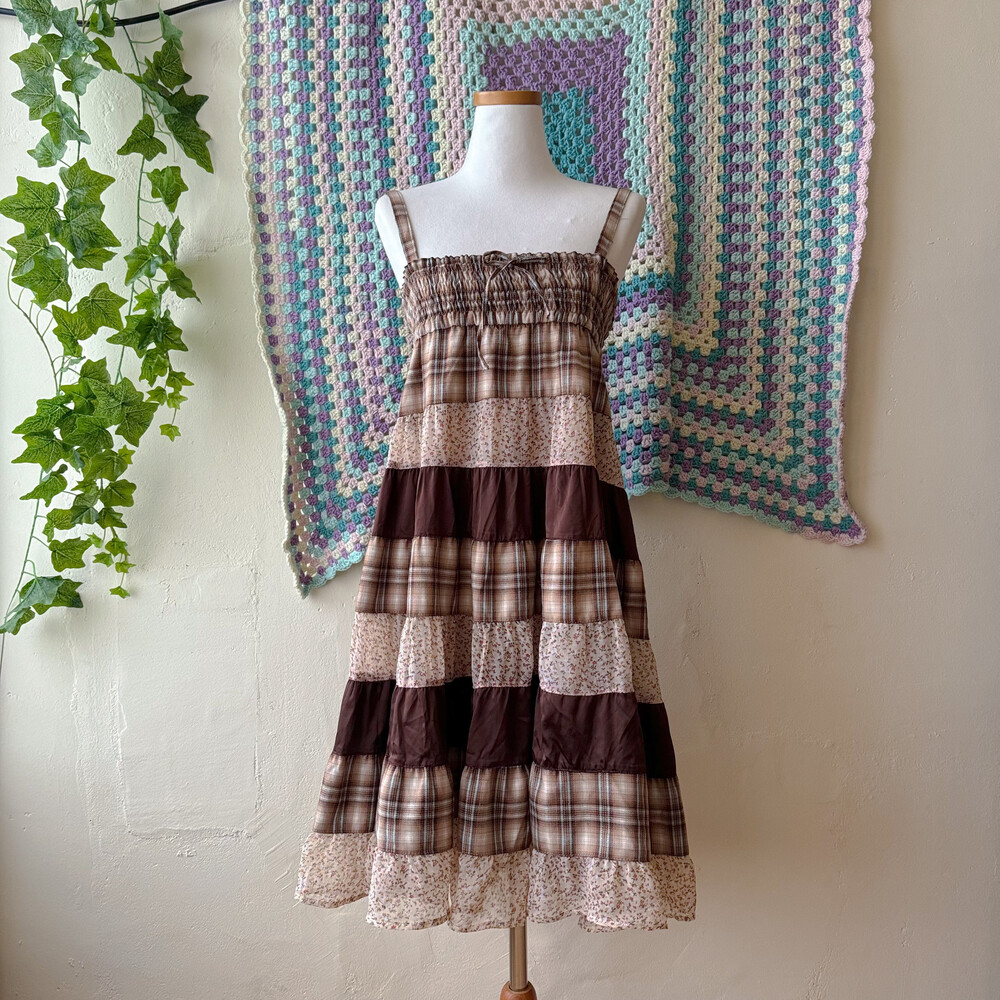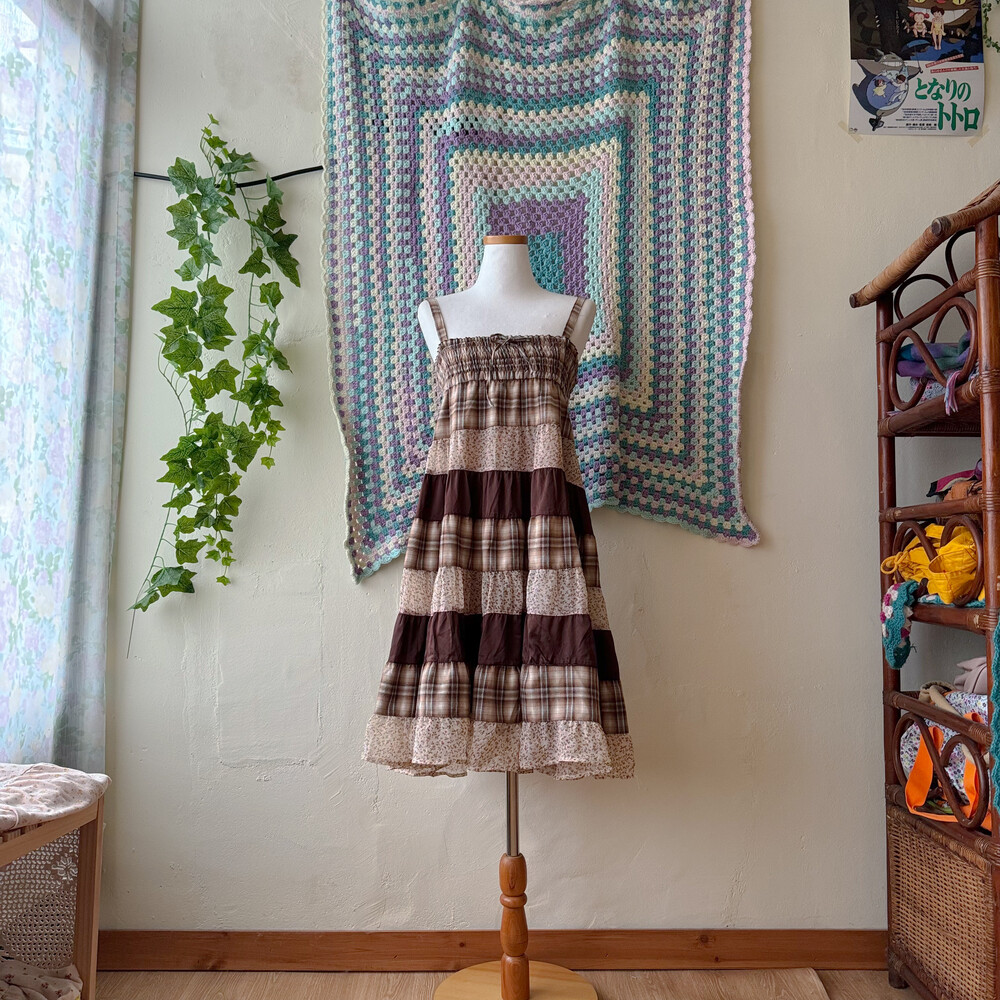 베이지, 브라운 색감 조합의 체크 끈원피스예요