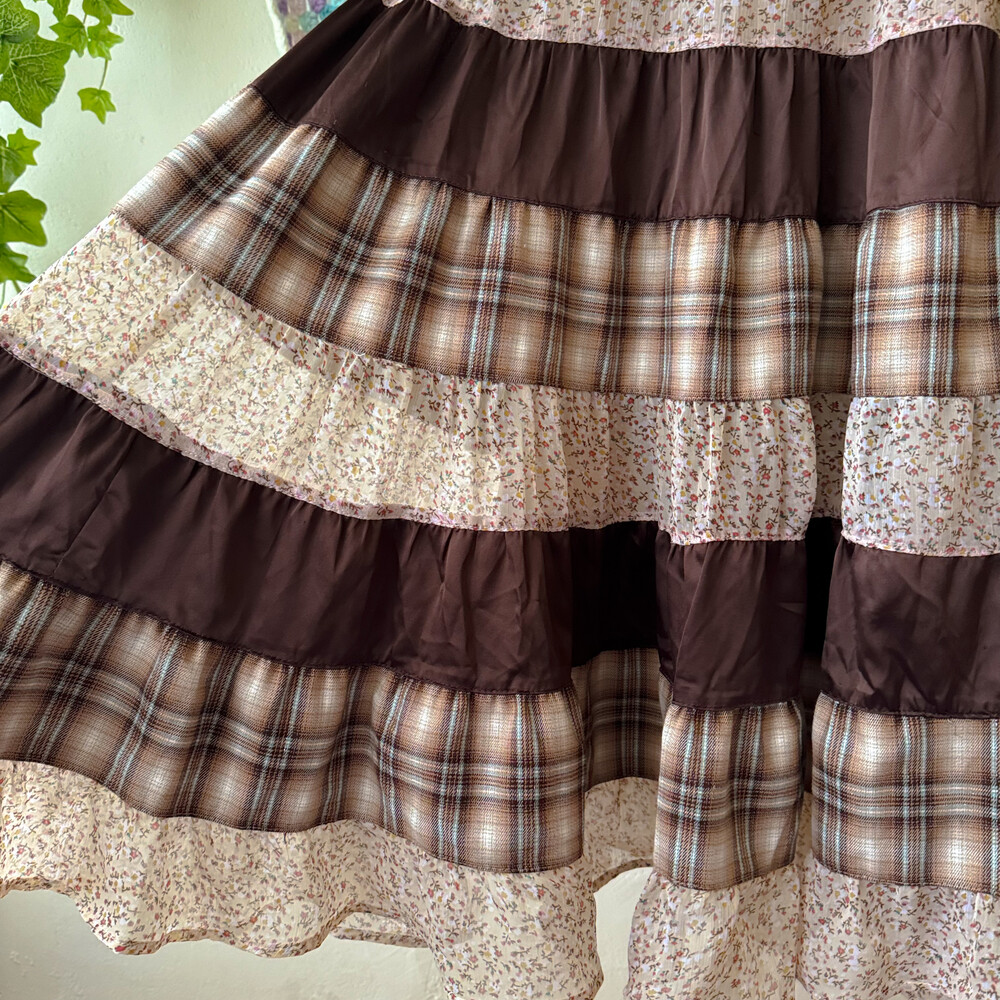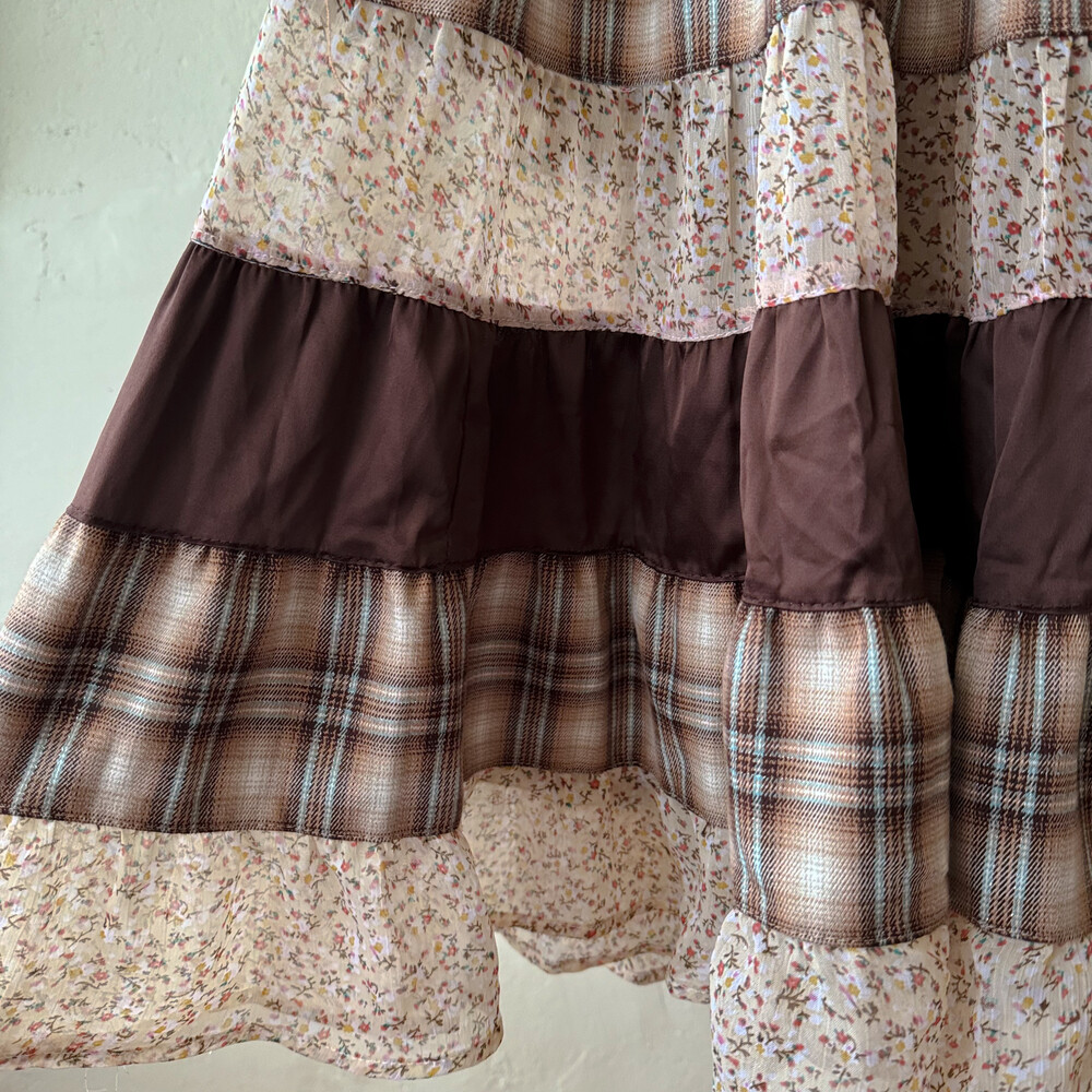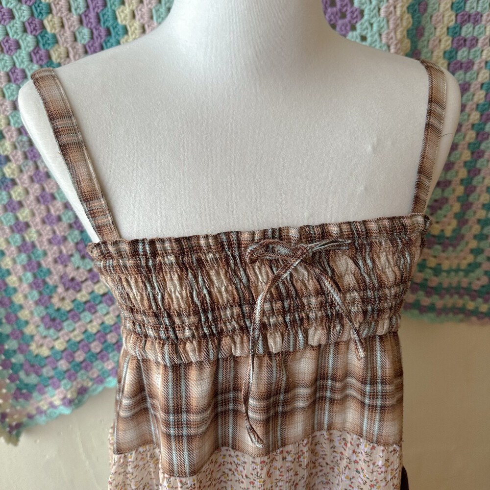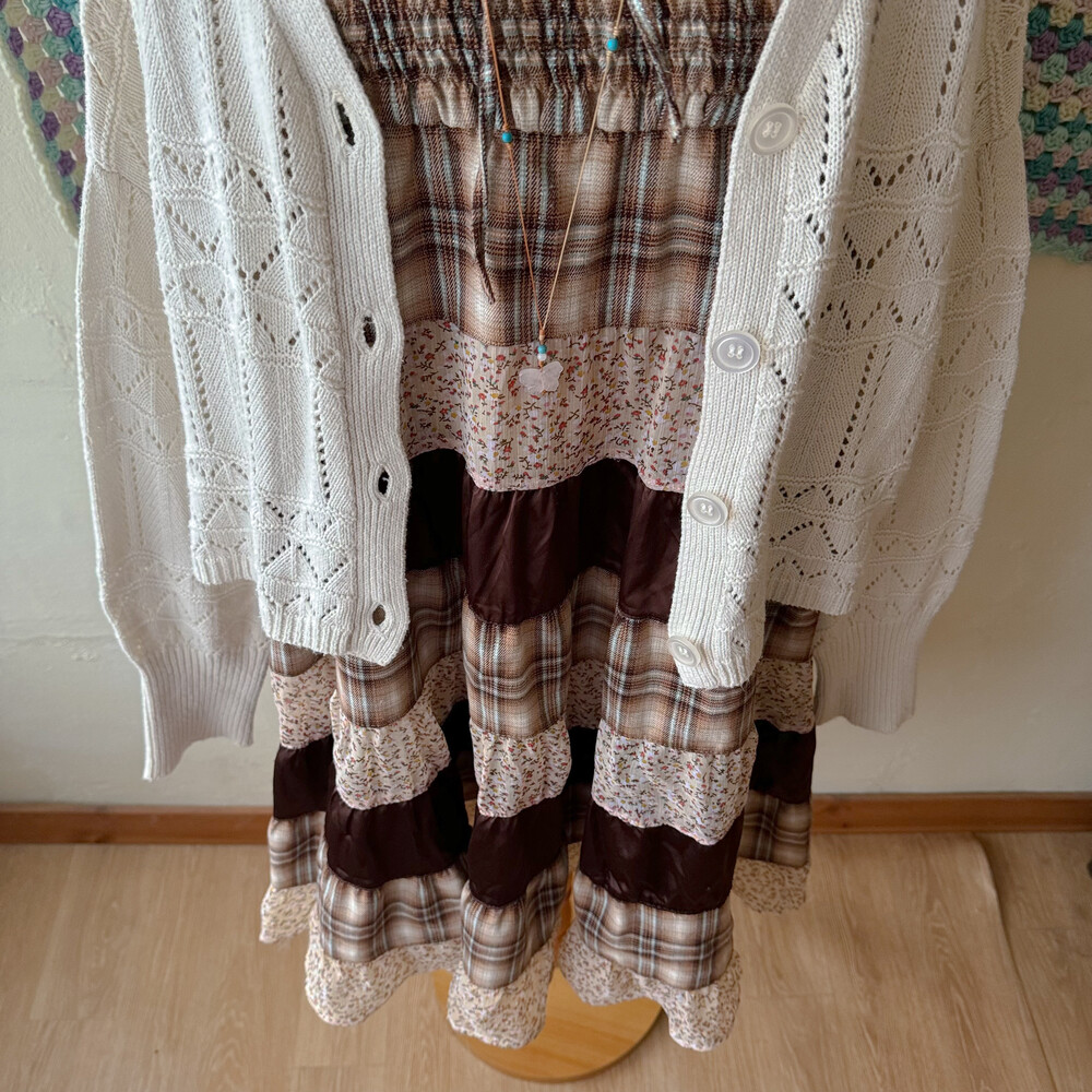 베이지, 브라운 색감 조합의 체크 끈원피스예요