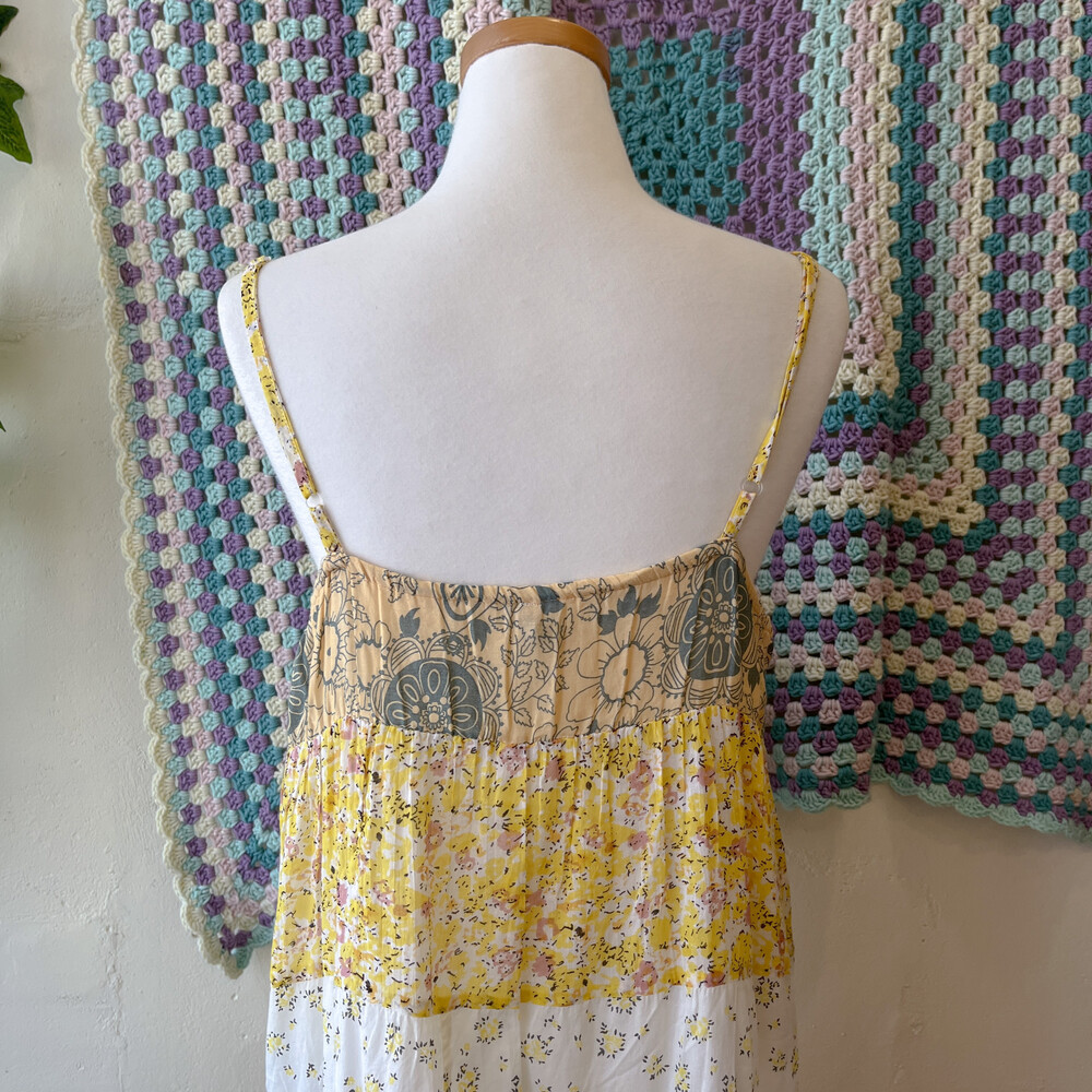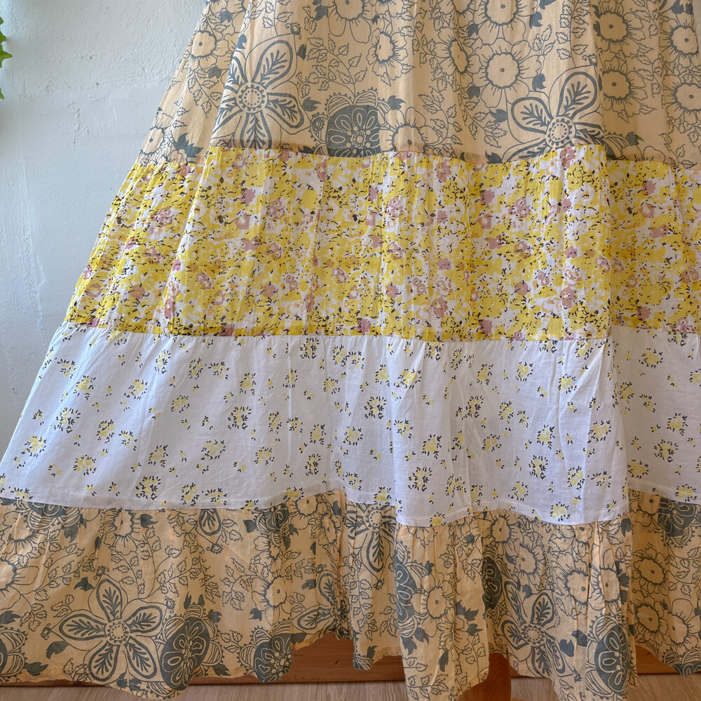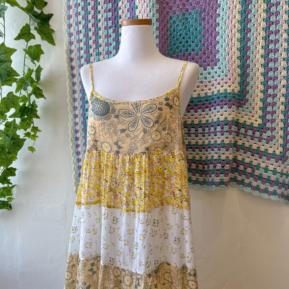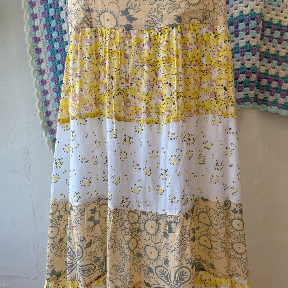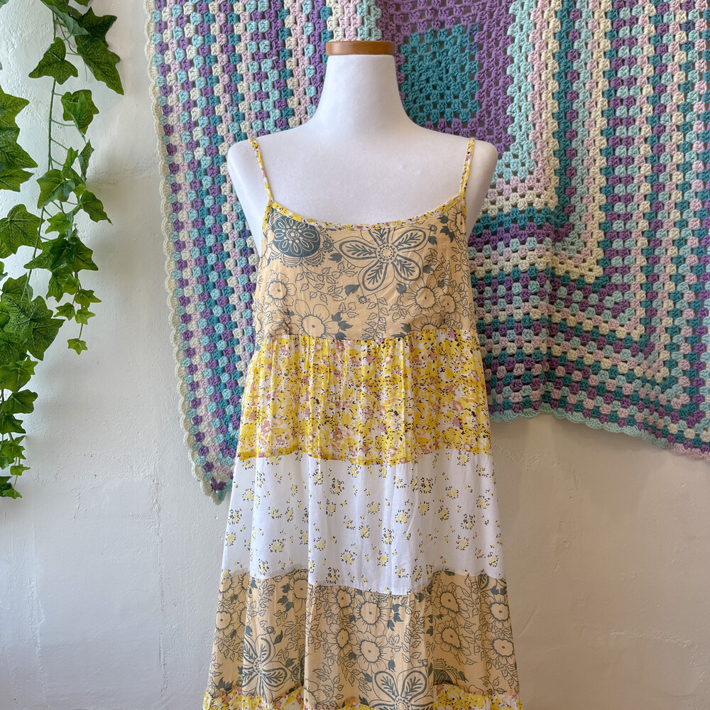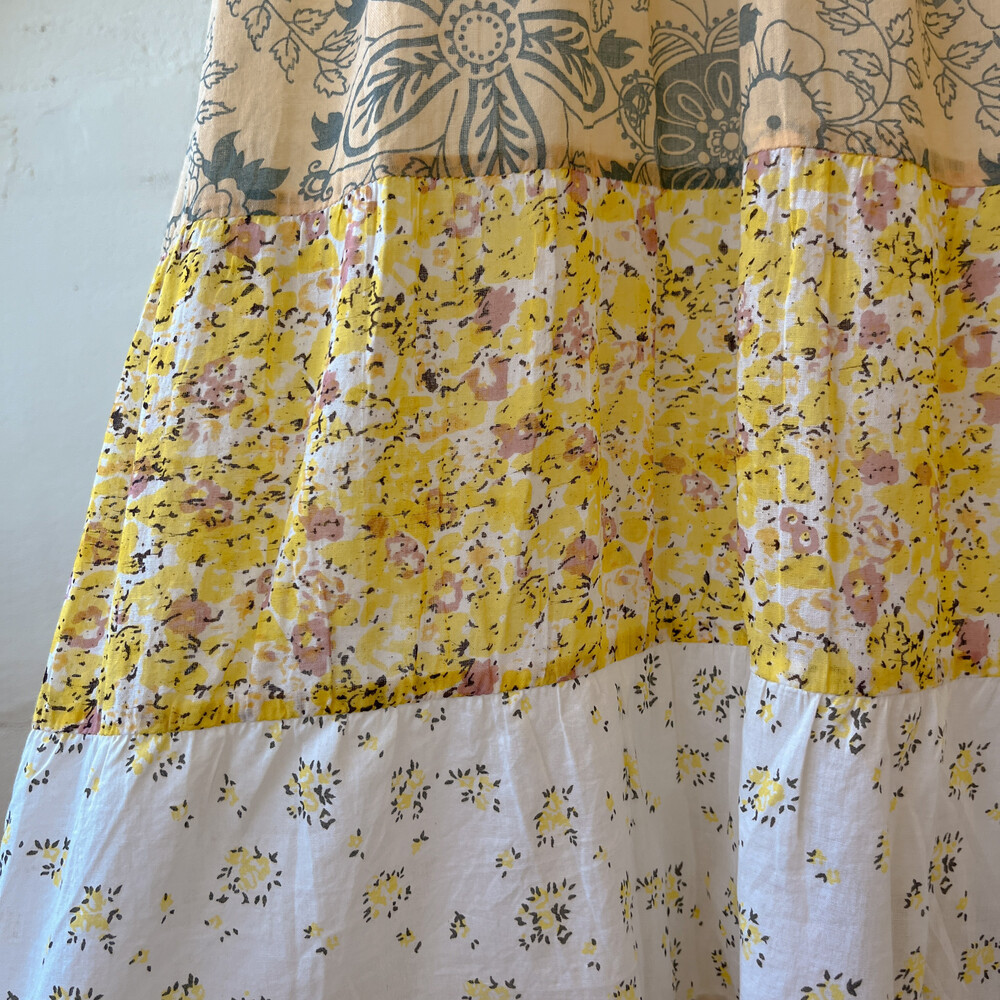 카키, 노랑, 핑크 꽃무늬들이 들어간 패치워크 끈원피스예요