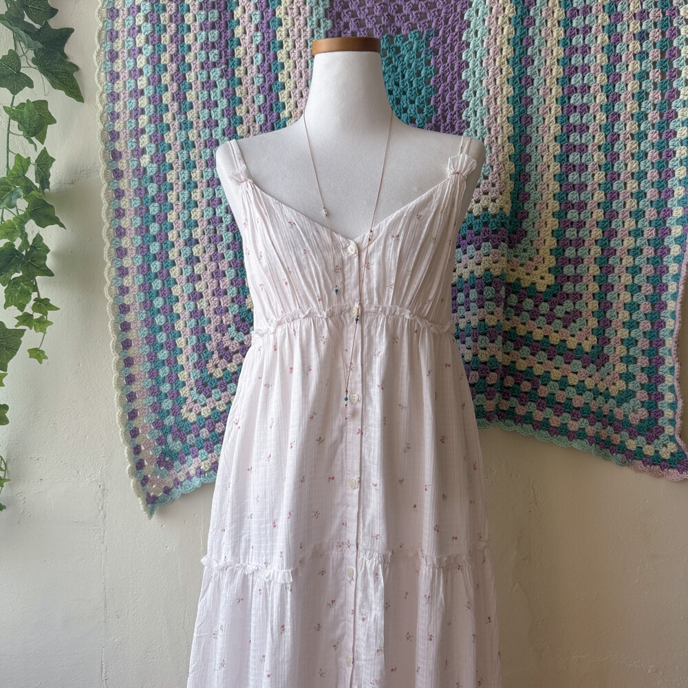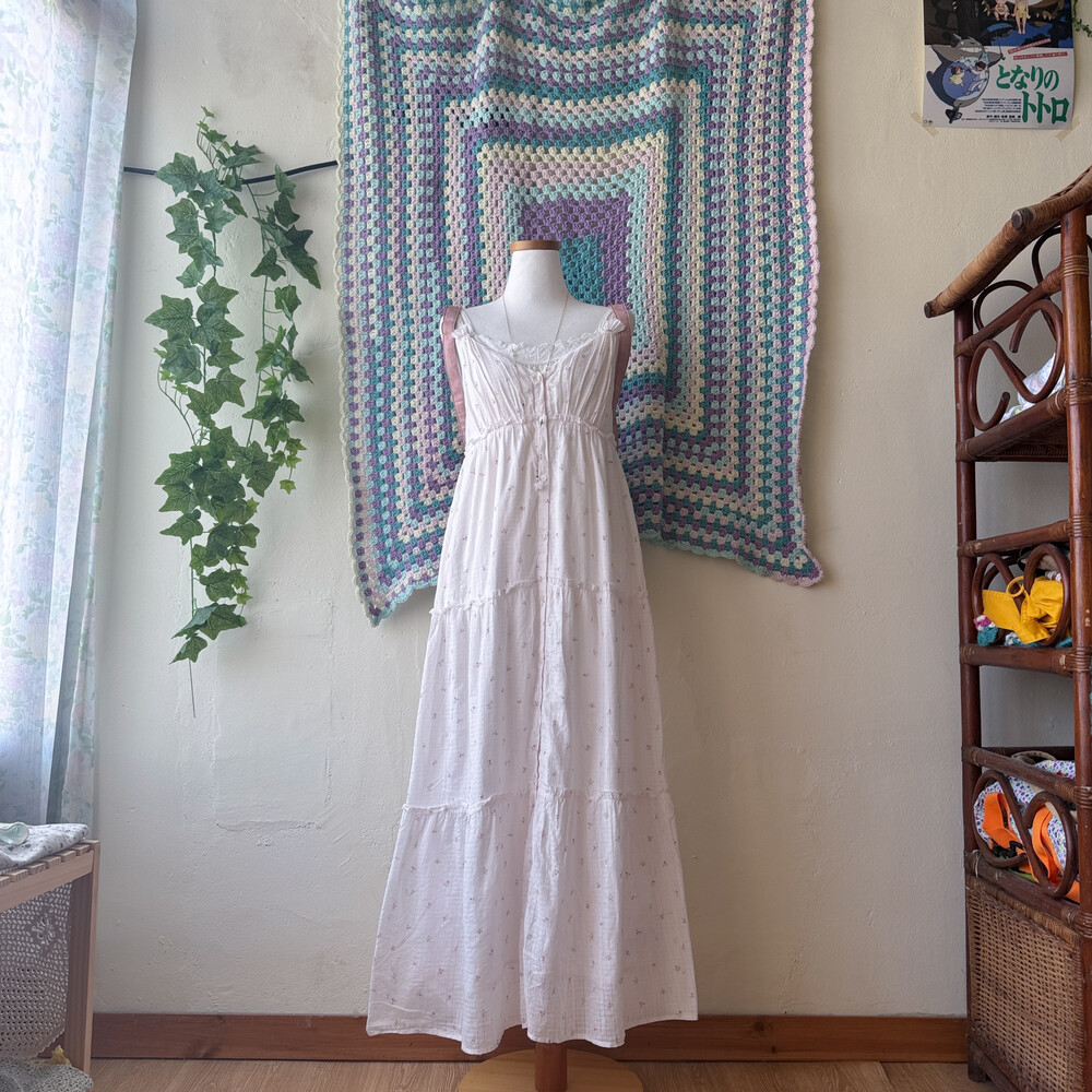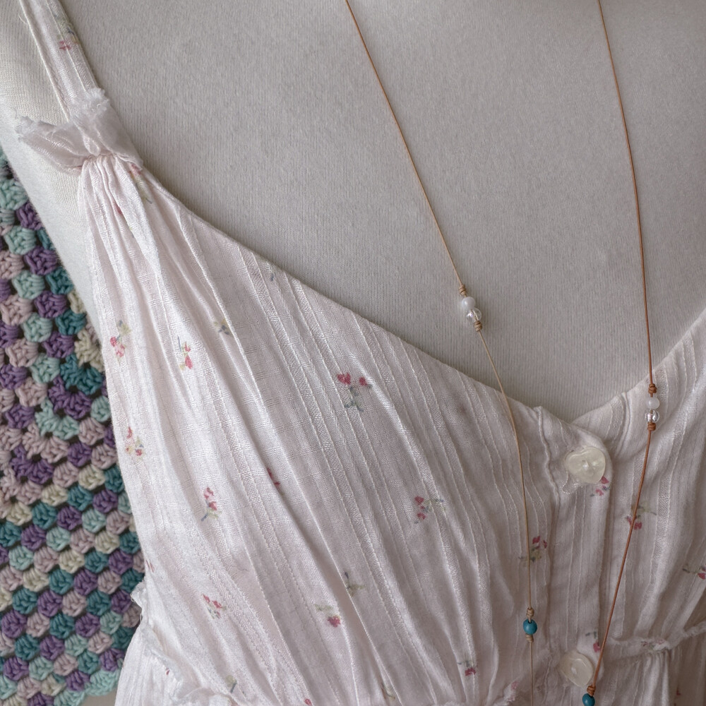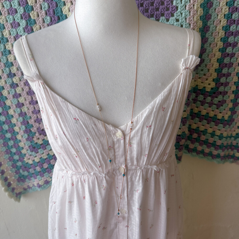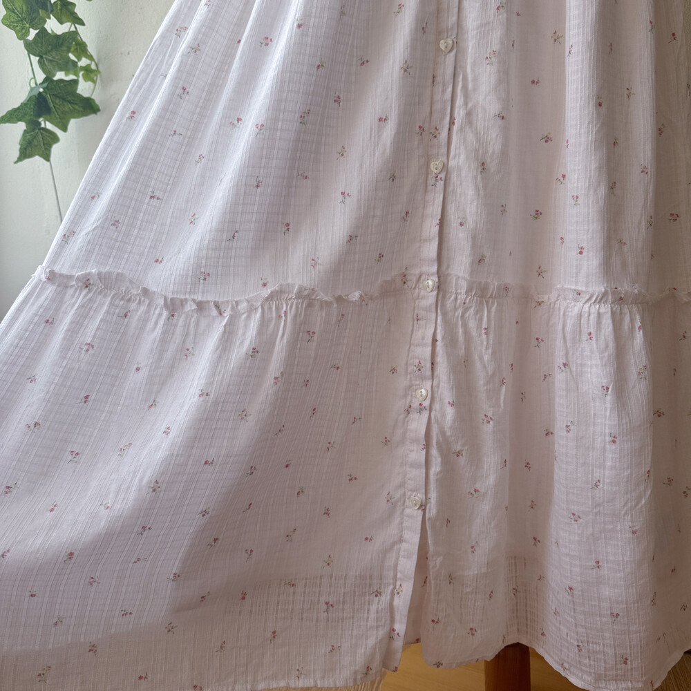 핑크가 한 방울 들어간 밀키한 색감의 잔꽃 끈원피스예요