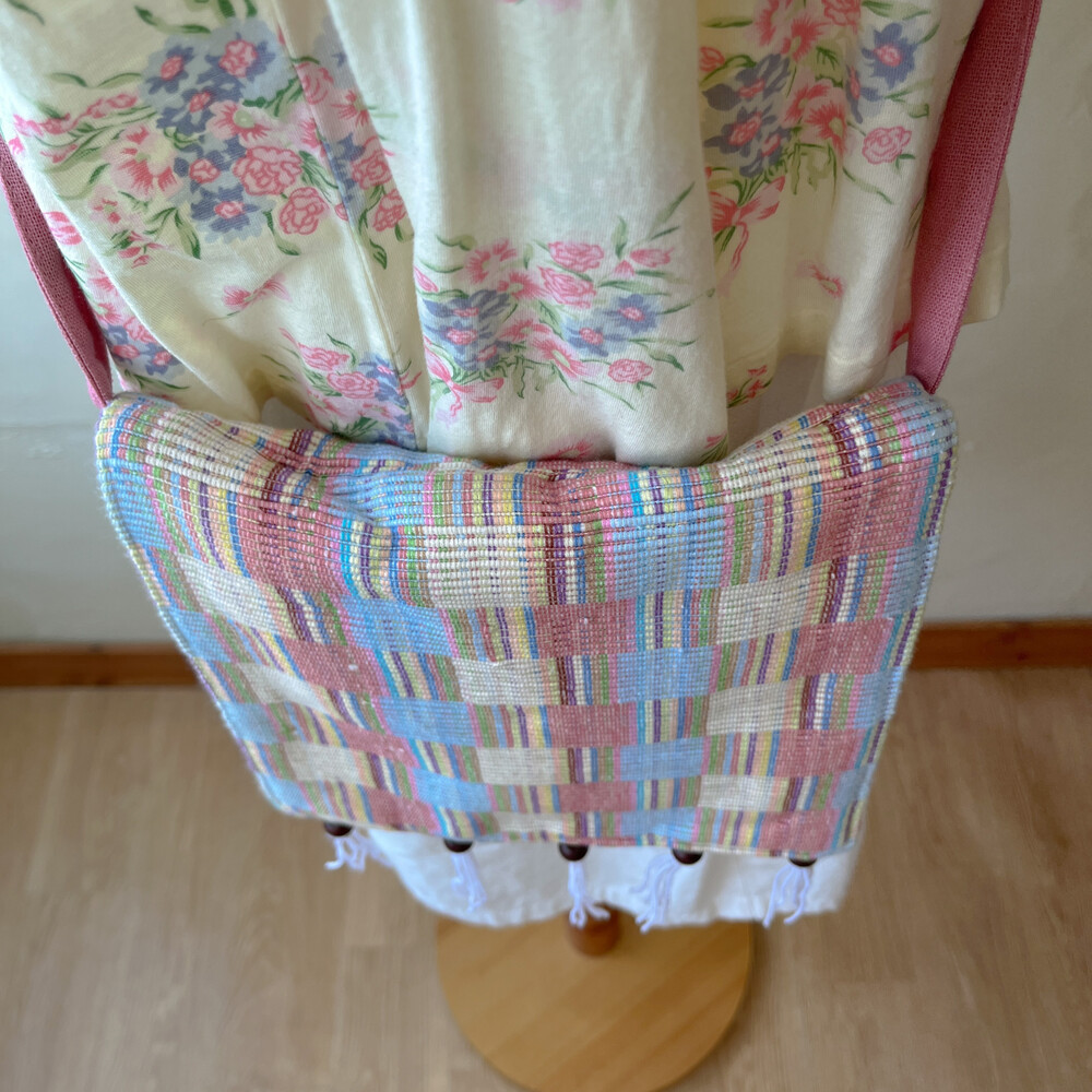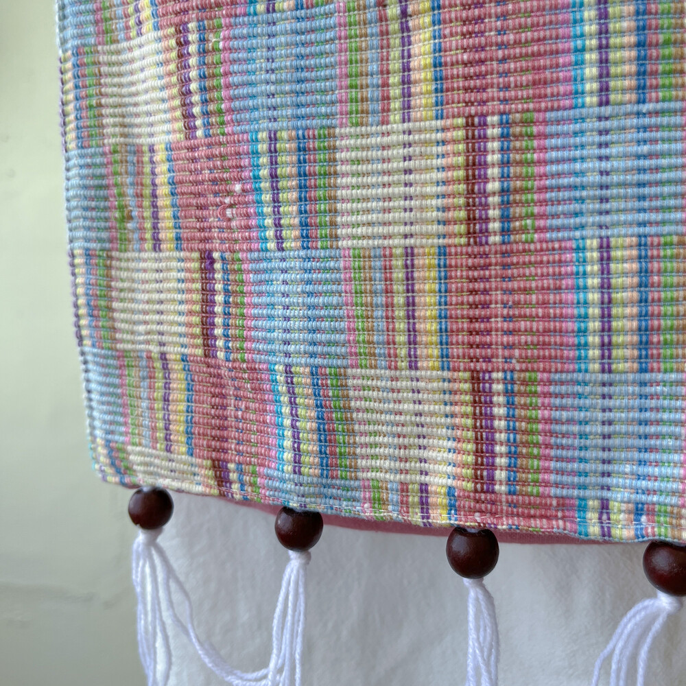 핑크, 블루 색감의 색실들이 네모모양으로 짜여졌고