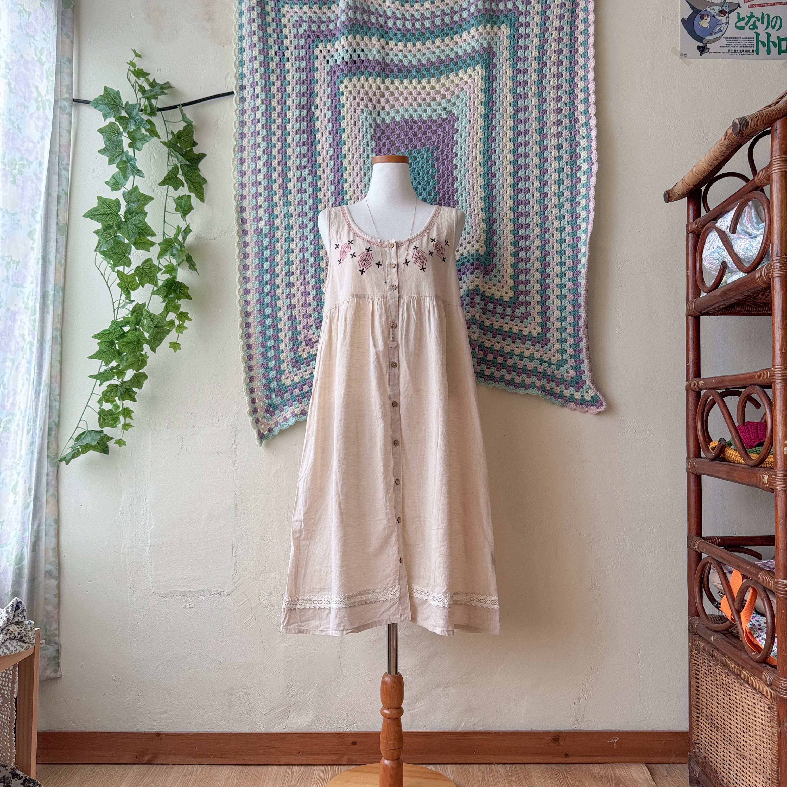 연베이지 색감의 자수 민소매 원피스예요
