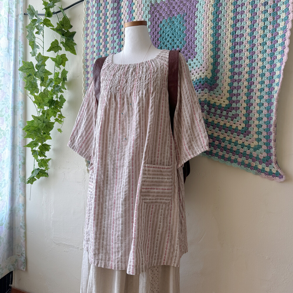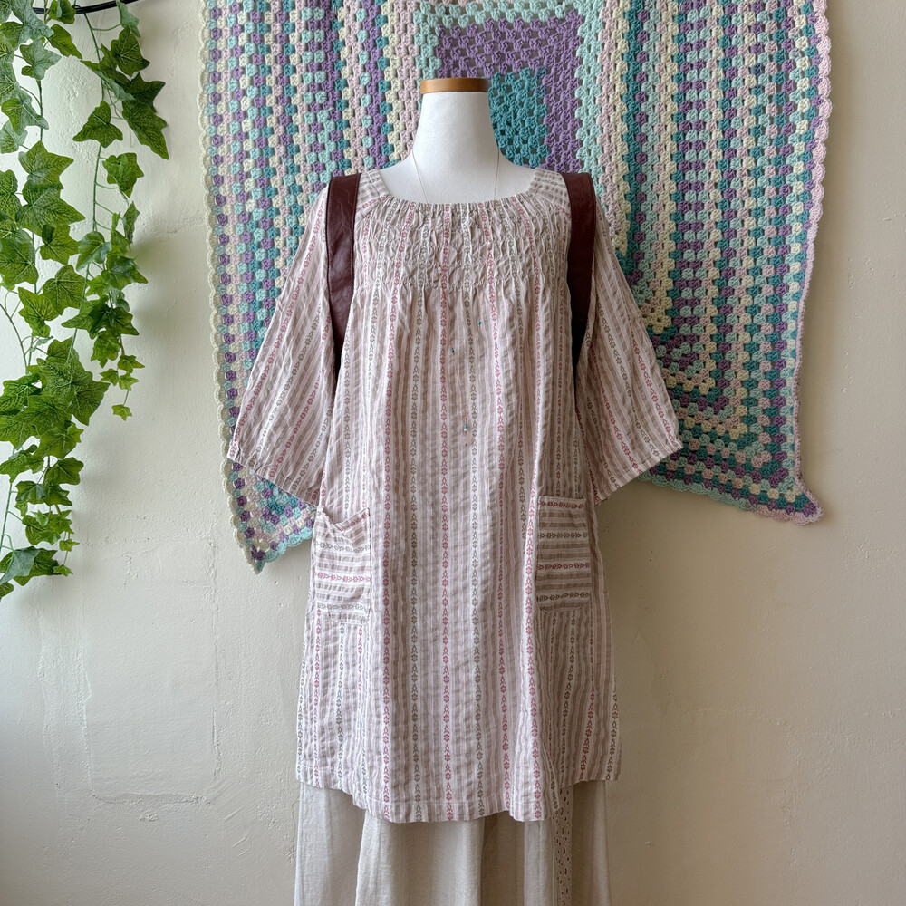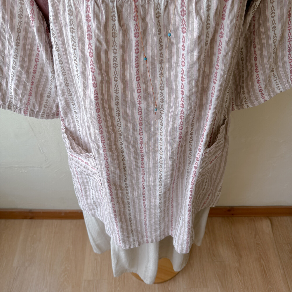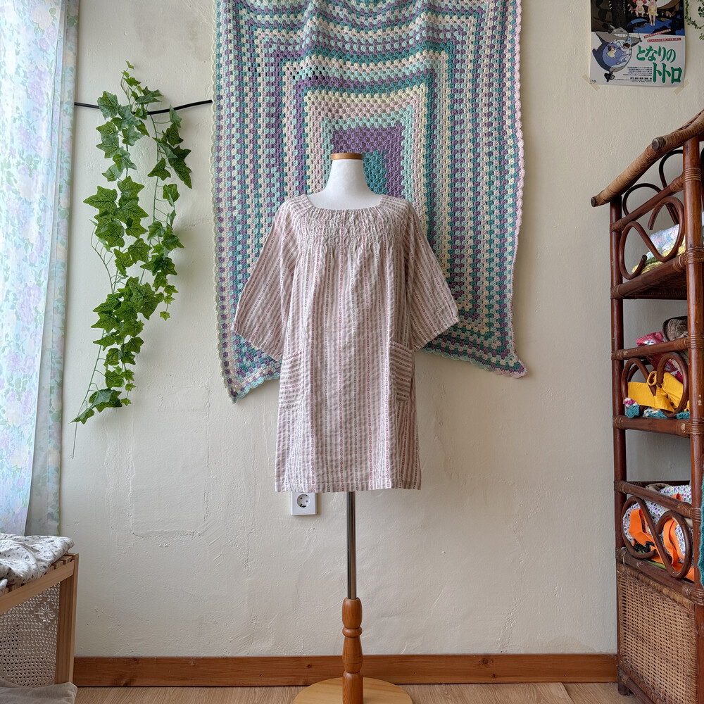 베이지, 핑크색감 조합의 코튼 원피스예요