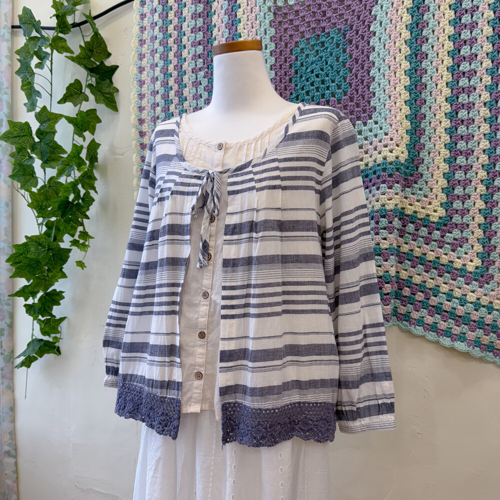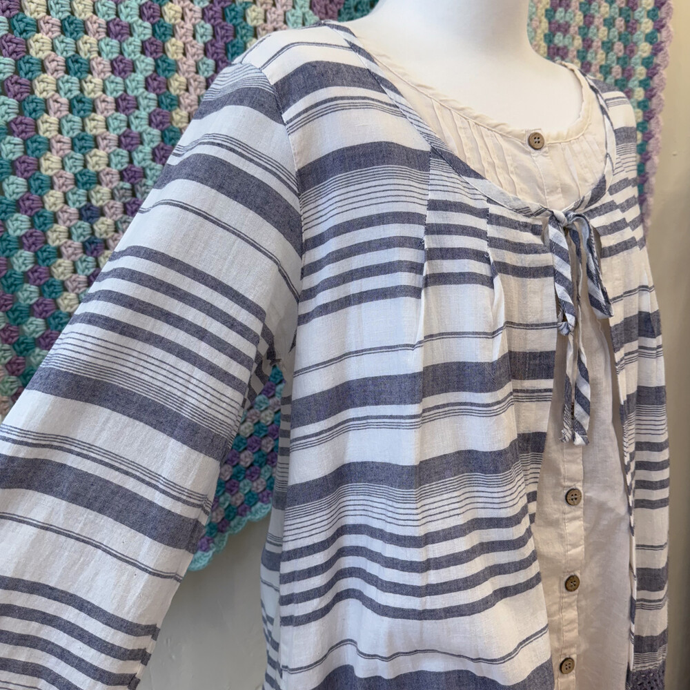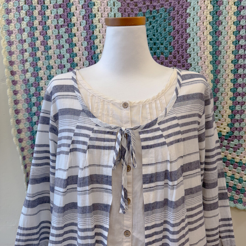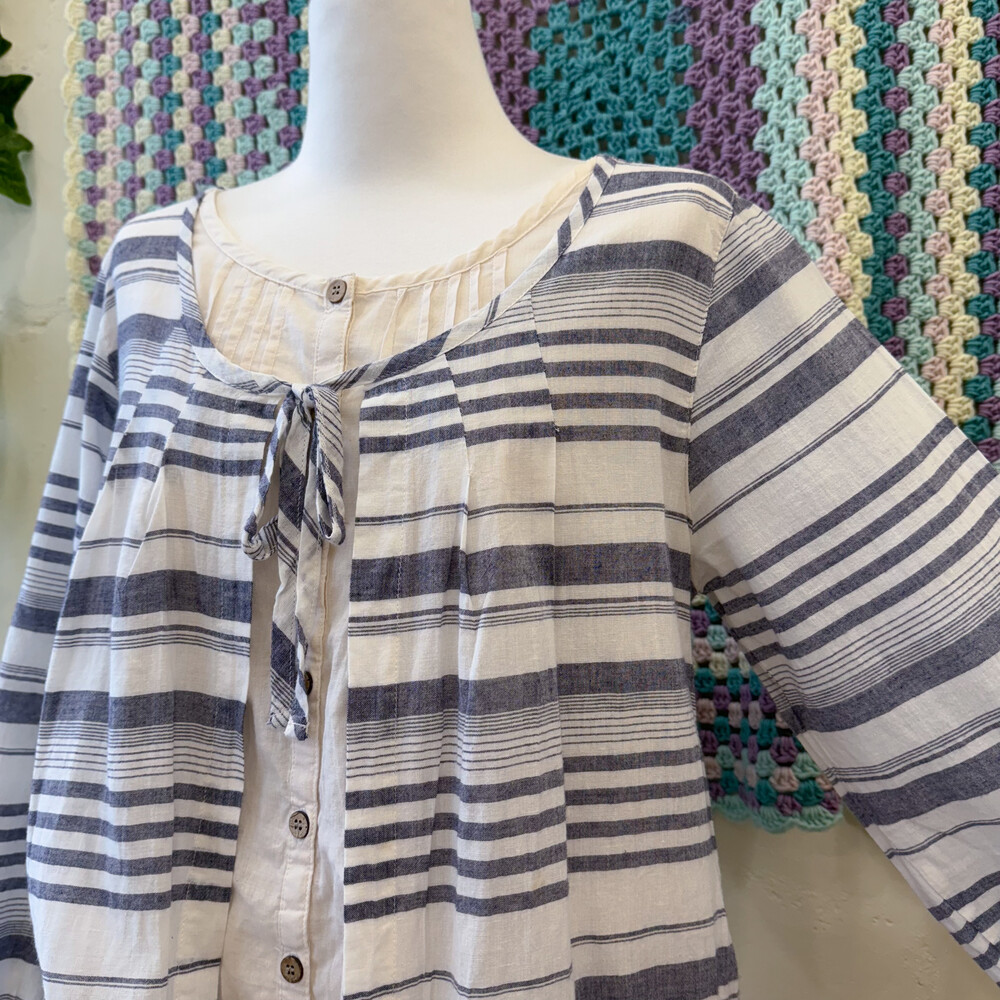 블루 퍼플 섞인 색감의 스트라이프 바선생 블라우스예요