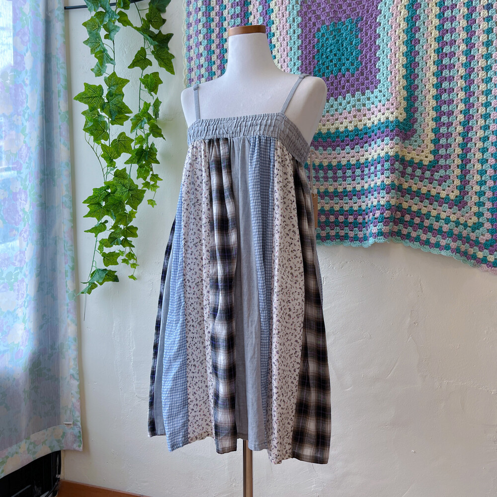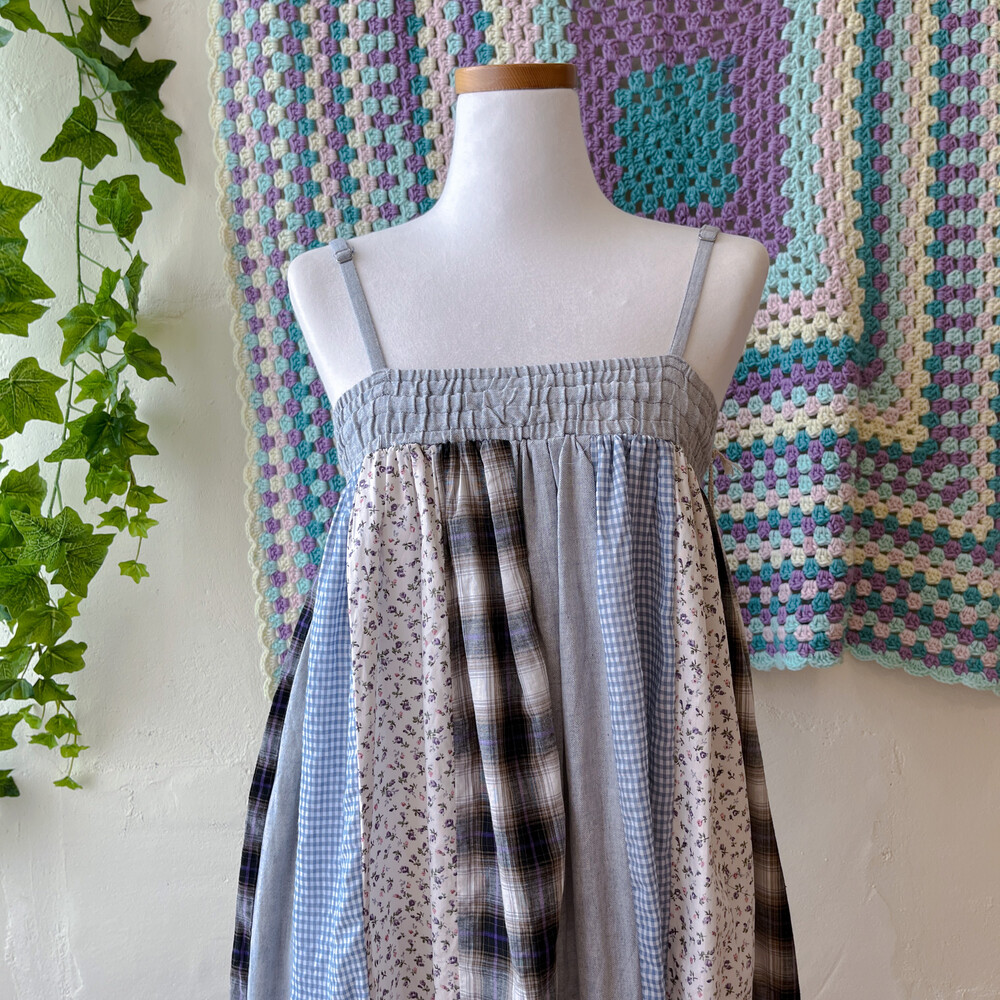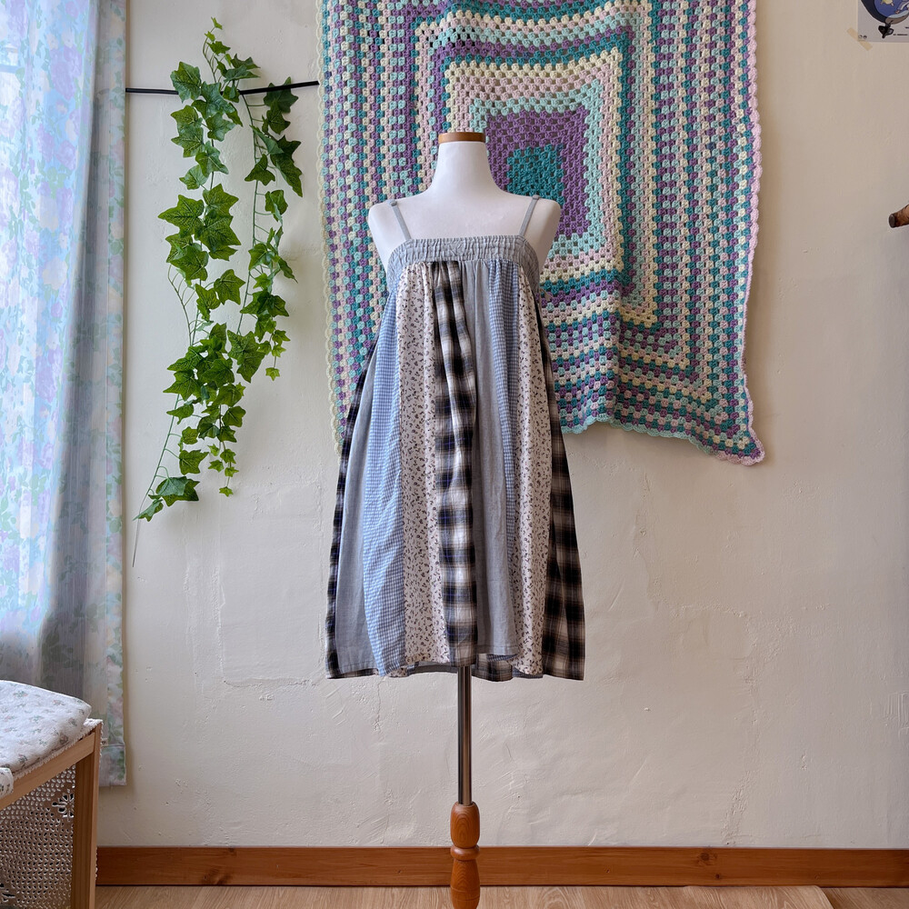 연청 바탕의 세로 패치워크 끈원피스예요