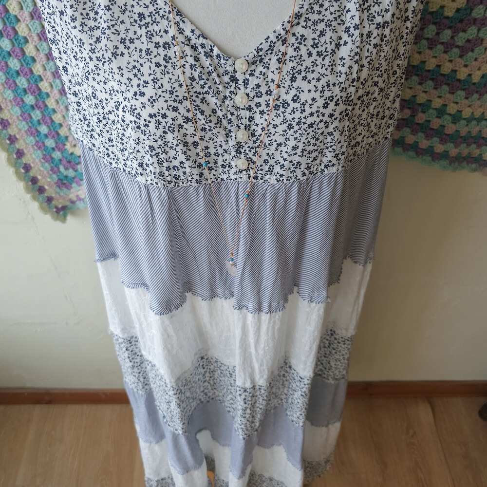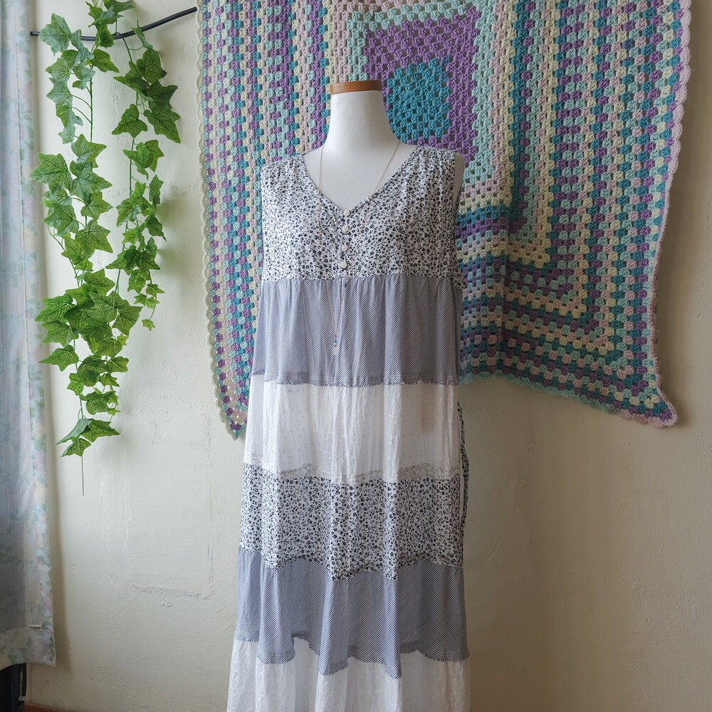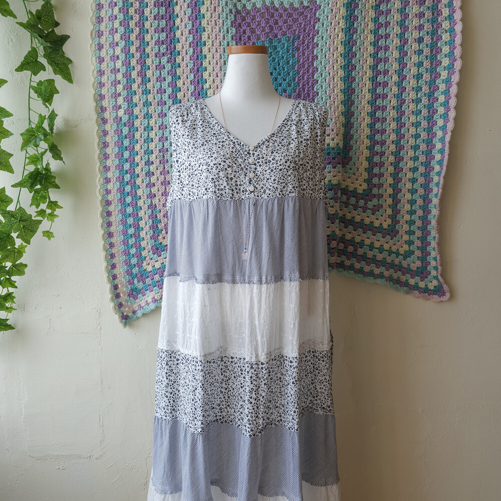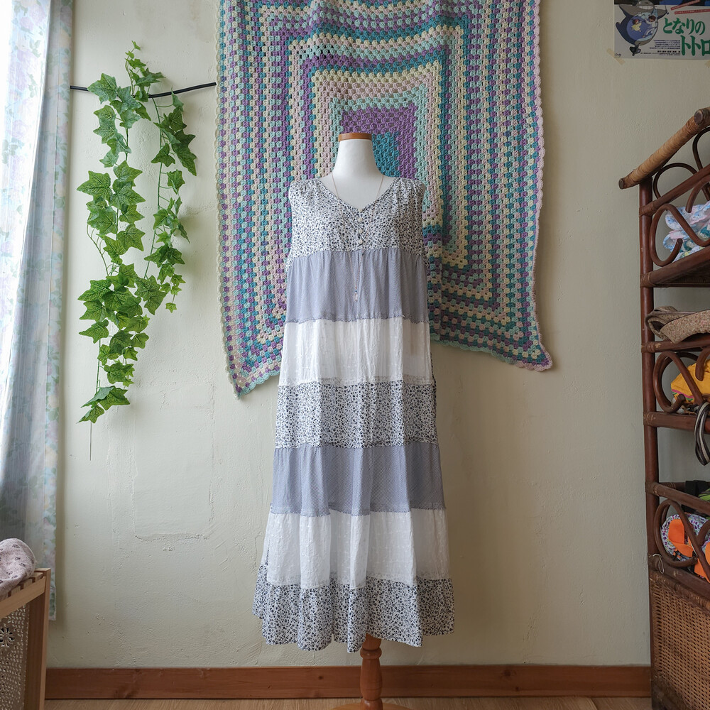 블랙 잔꽃 패턴의 민소매 패치워크 원피스예요