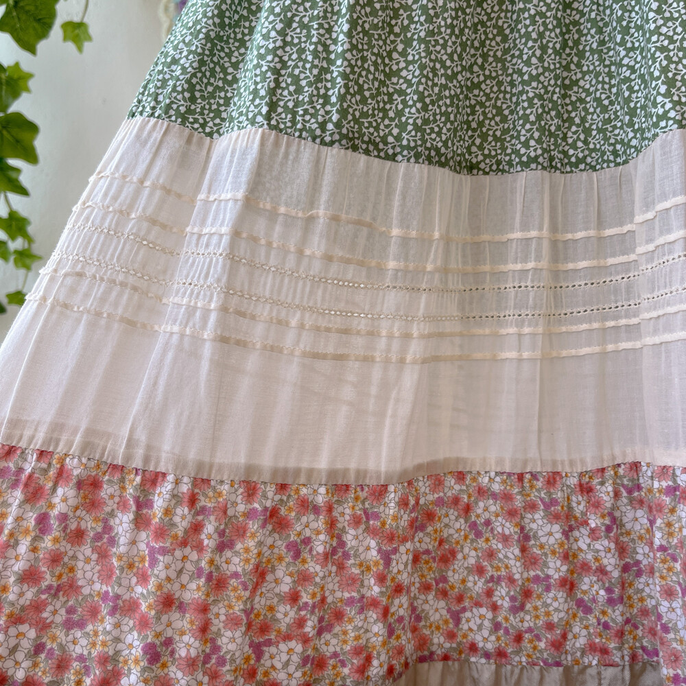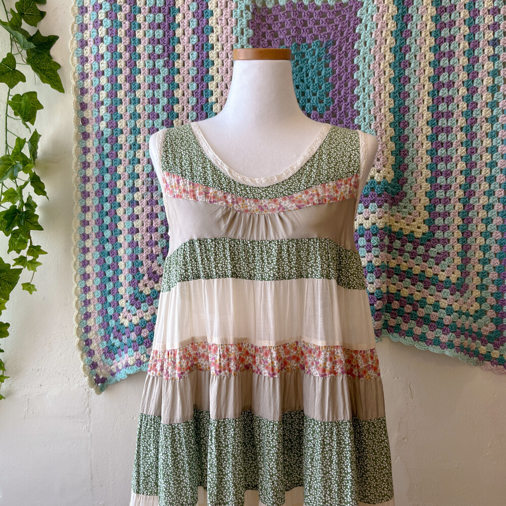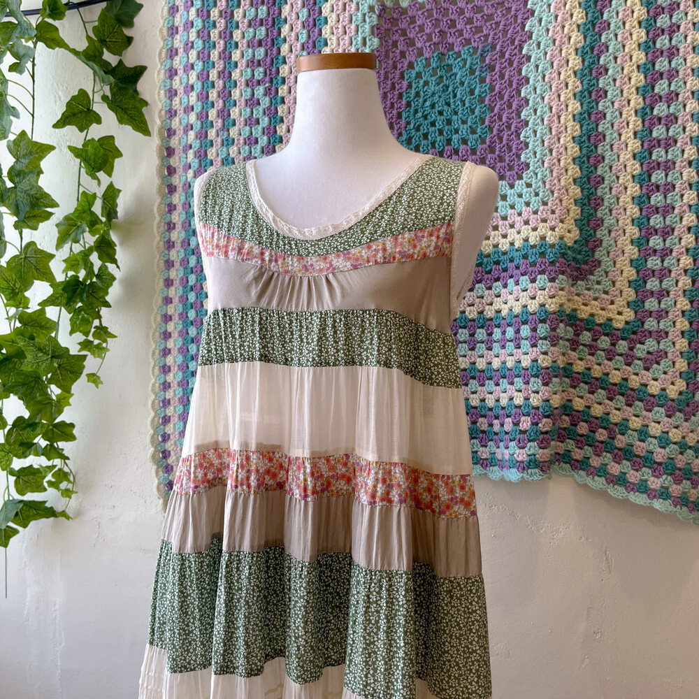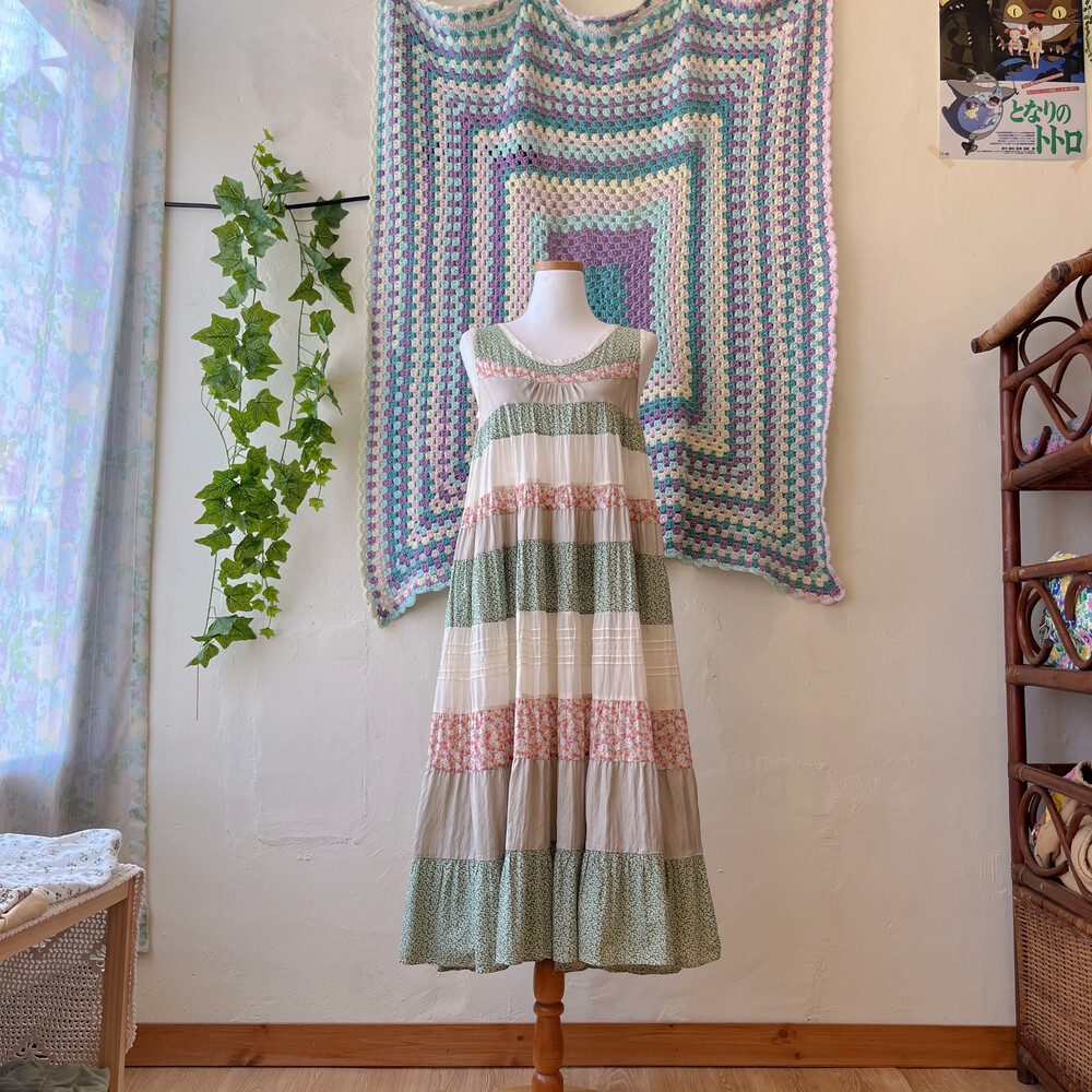 그리너리한 색감의 패치워크 민소매 원피스예요