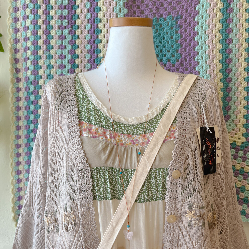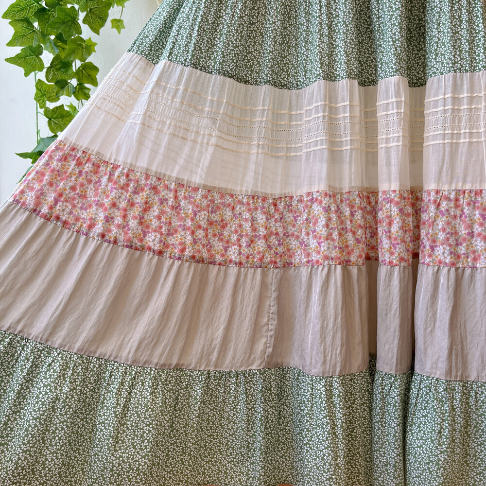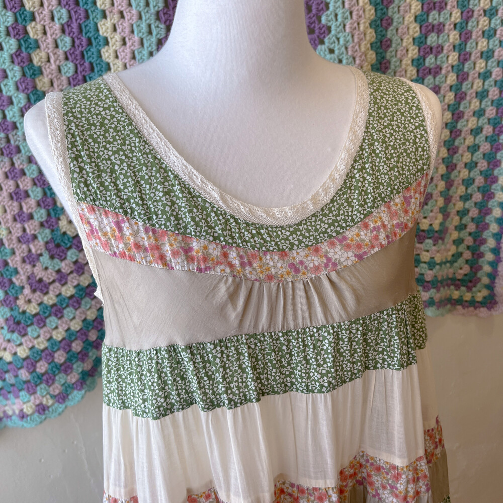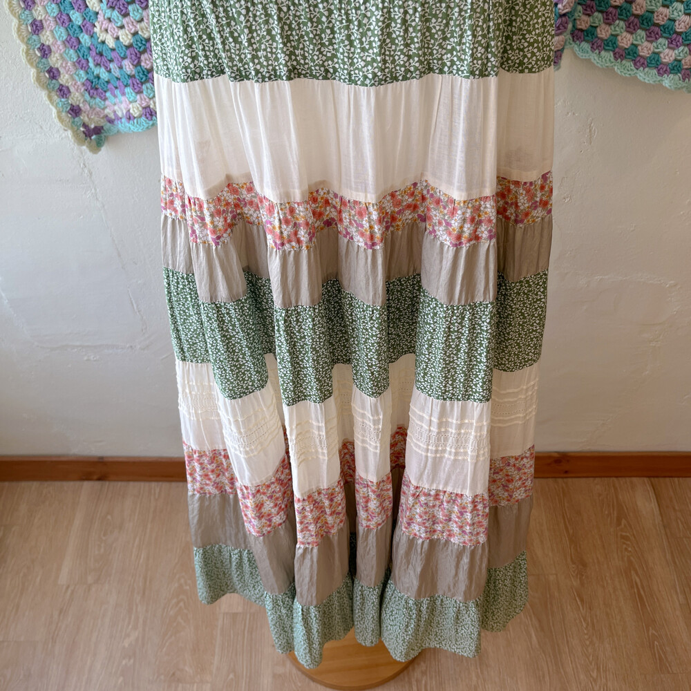 그리너리한 색감의 패치워크 민소매 원피스예요